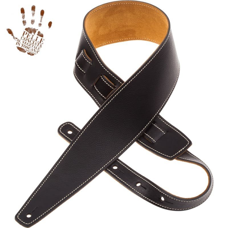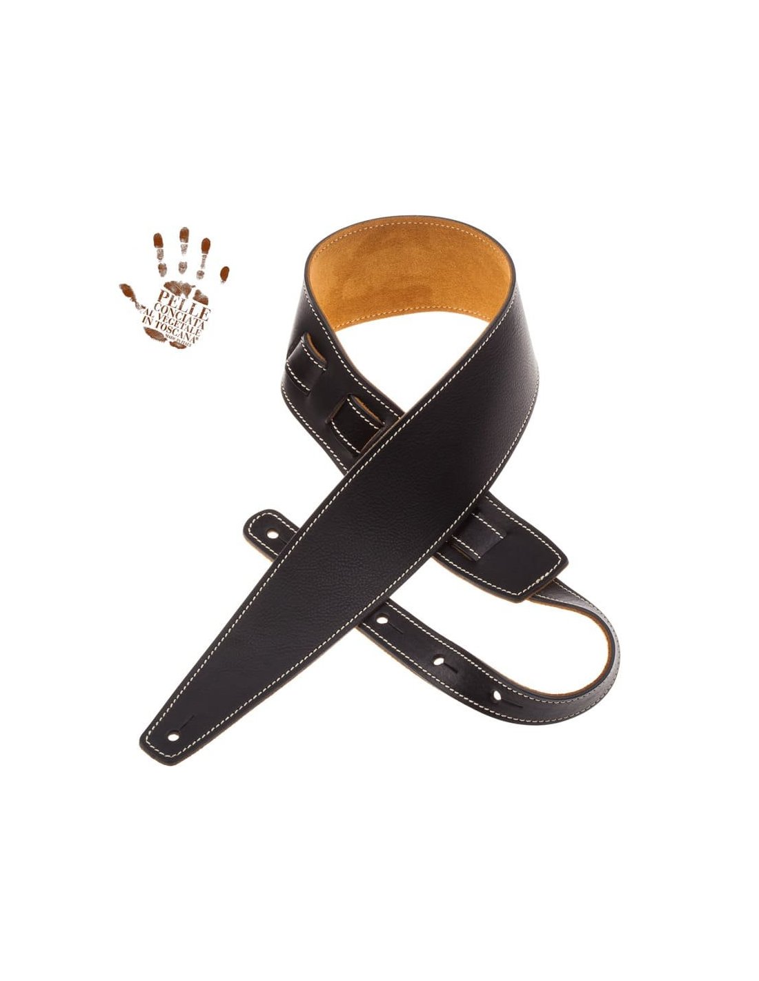 MAGRABO' HOLES HS CORE NERO 8CM Ed. 2019. Tracolla per chitarra e basso elettrico realizzata in vera pelle di alta qualità 100% Made in Italy con Concia al vegetale certificata, cuciture in cotone ecru, rivestimento interno scamosciato, larghezza 8cm e lunghezza regolabile da 105 a 142 cm.