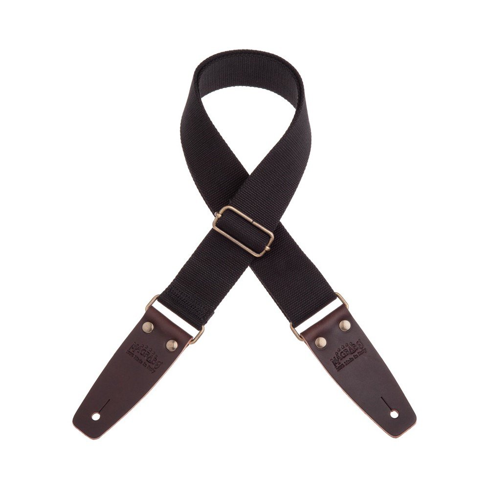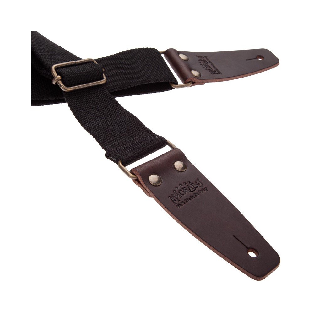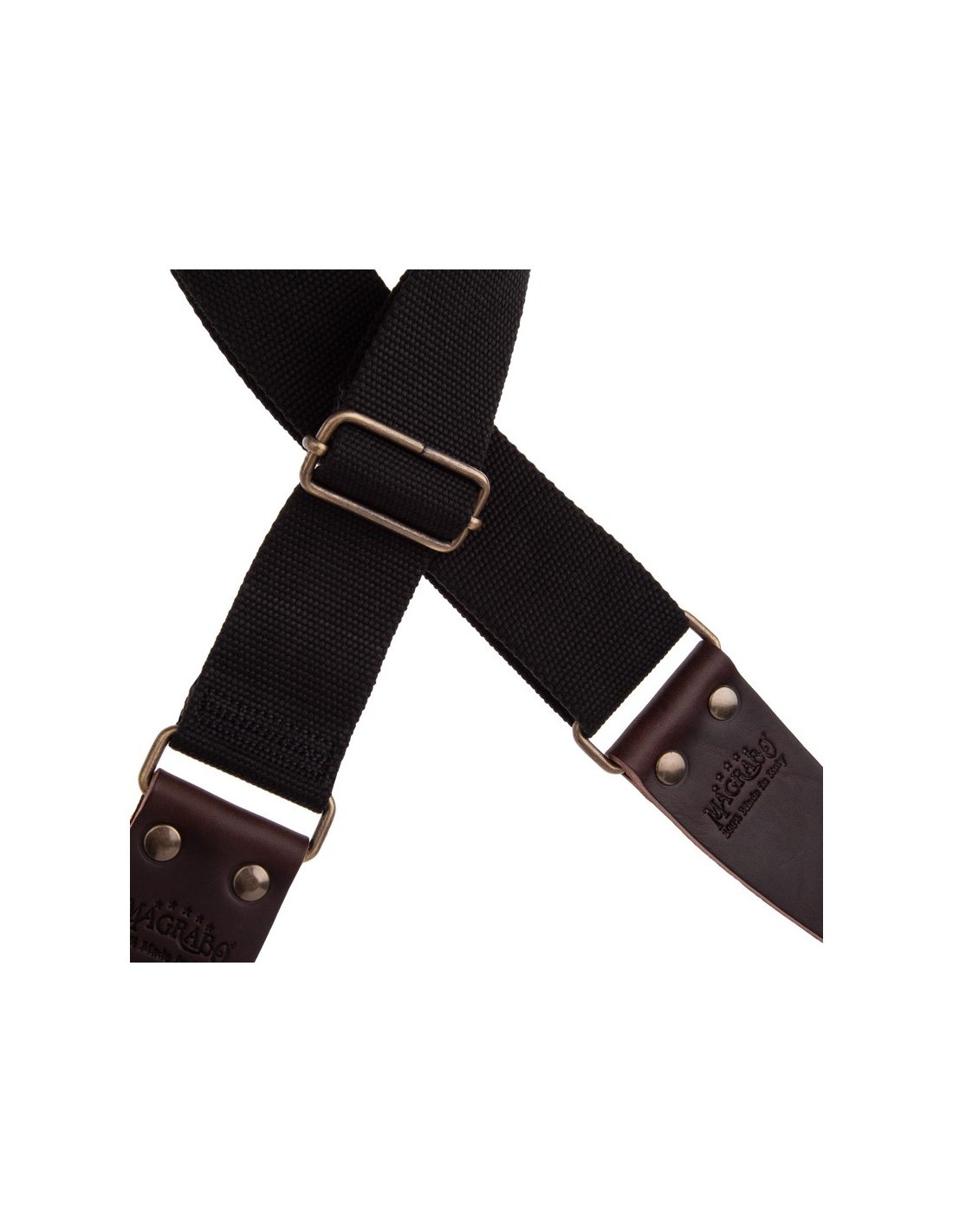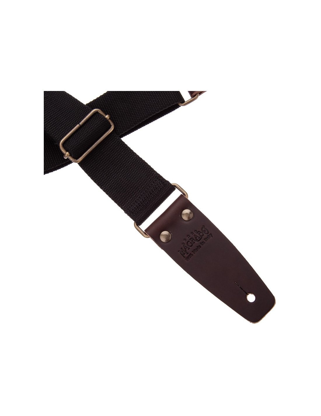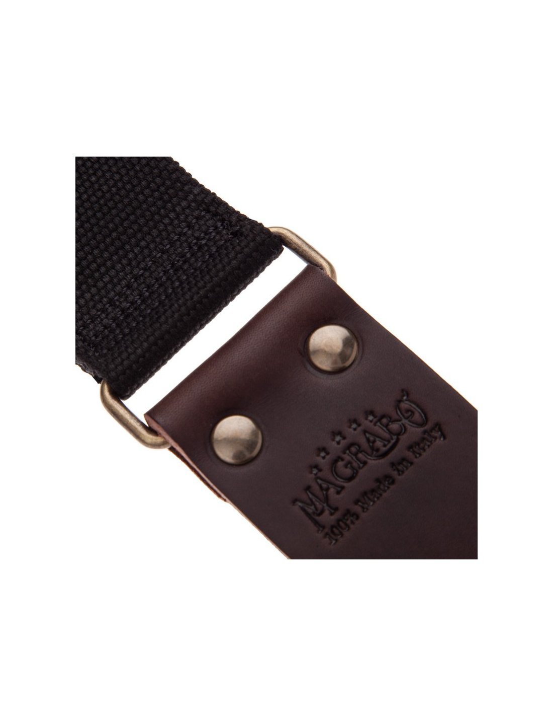 MAGRABO' STRIPE SC ENTRY NERO 5CM TERMINALI MARRONE SCURO FIBBIA OTTONE ANTICO. Tracolla per chitarra e basso elettrico realizzata in nastro di vero cotone di alta qualità 100% Made in Italy, terminali Vera pelle di alta qualità color nero, senza cuciture, fibbia di ottone antico, larghezza 5 cm e lunghezza regolabile da 88 a 150 cm.