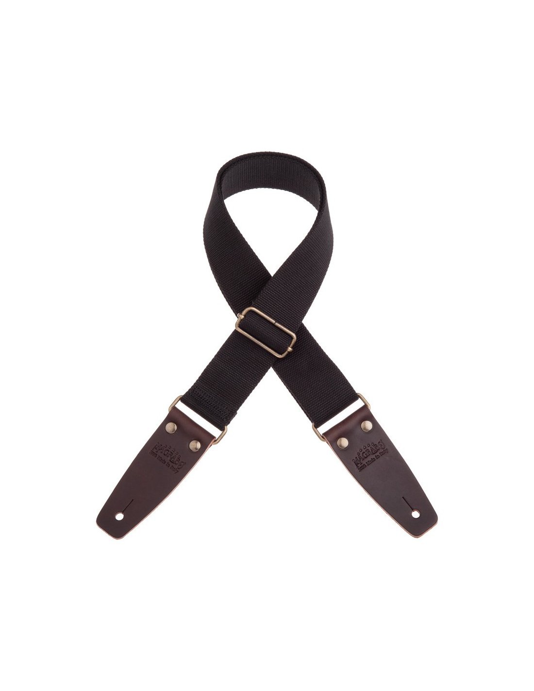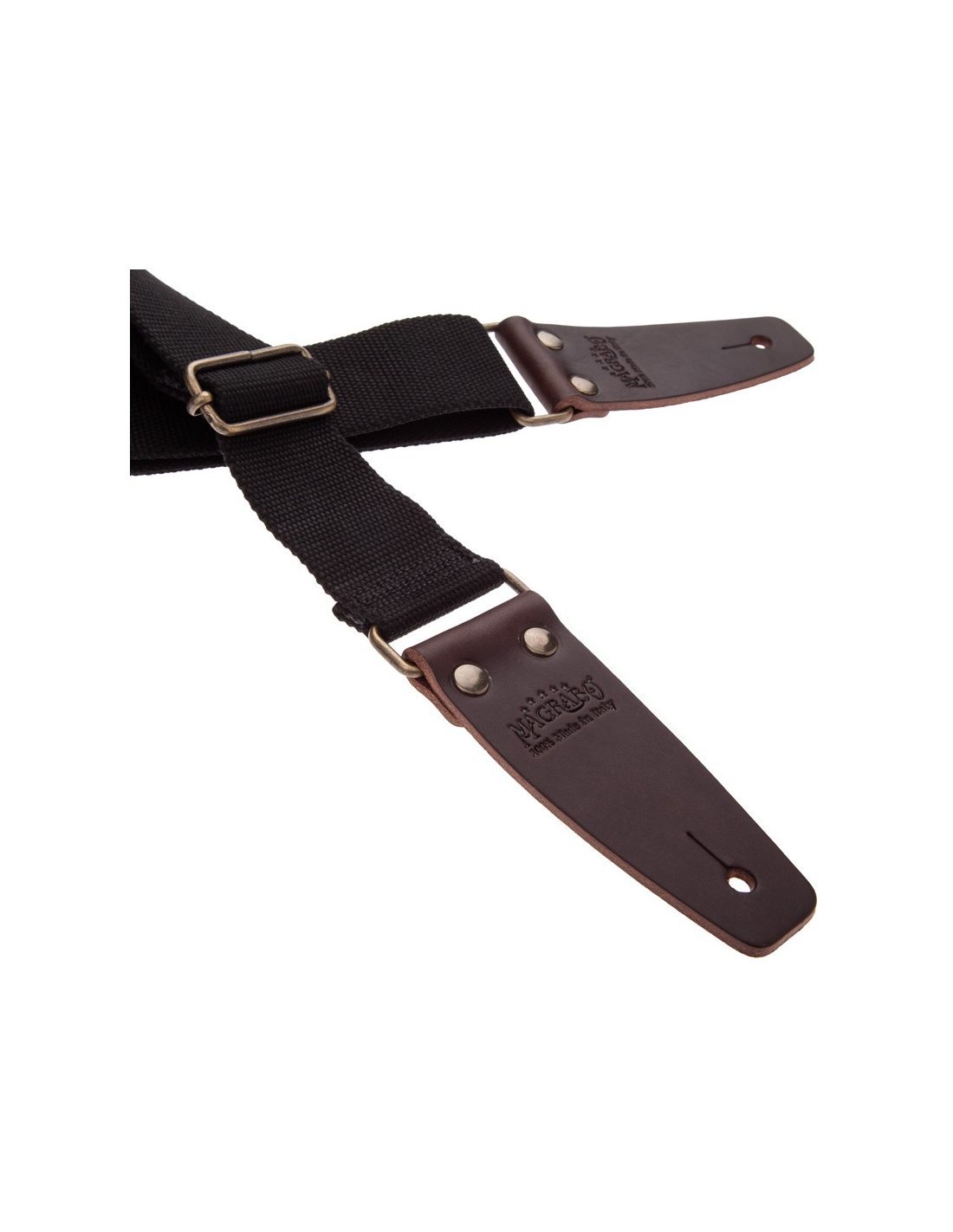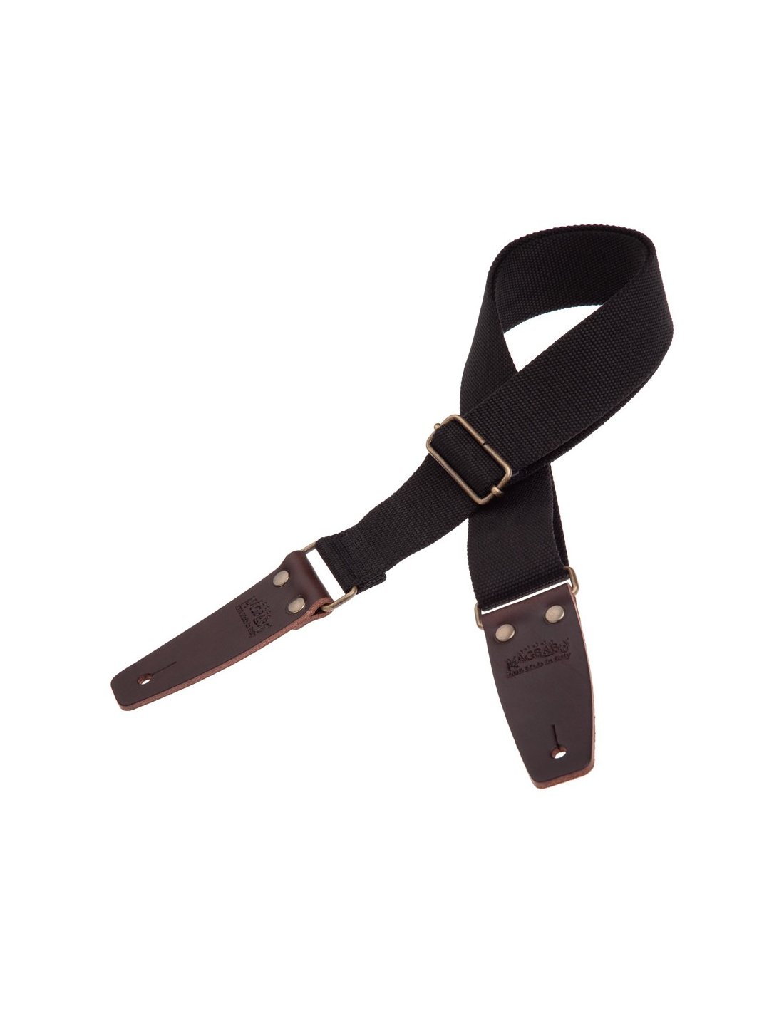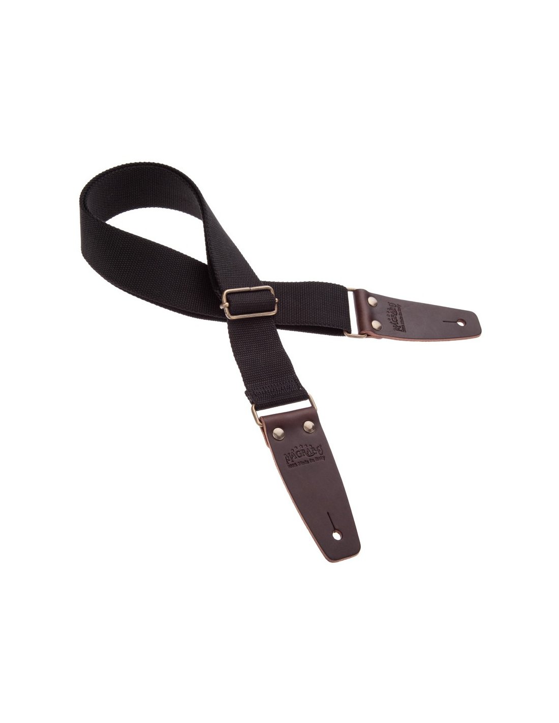 MAGRABO' STRIPE SC ENTRY NERO 5CM TERMINALI MARRONE SCURO FIBBIA OTTONE ANTICO. Tracolla per chitarra e basso elettrico realizzata in nastro di vero cotone di alta qualità 100% Made in Italy, terminali Vera pelle di alta qualità color nero, senza cuciture, fibbia di ottone antico, larghezza 5 cm e lunghezza regolabile da 88 a 150 cm.