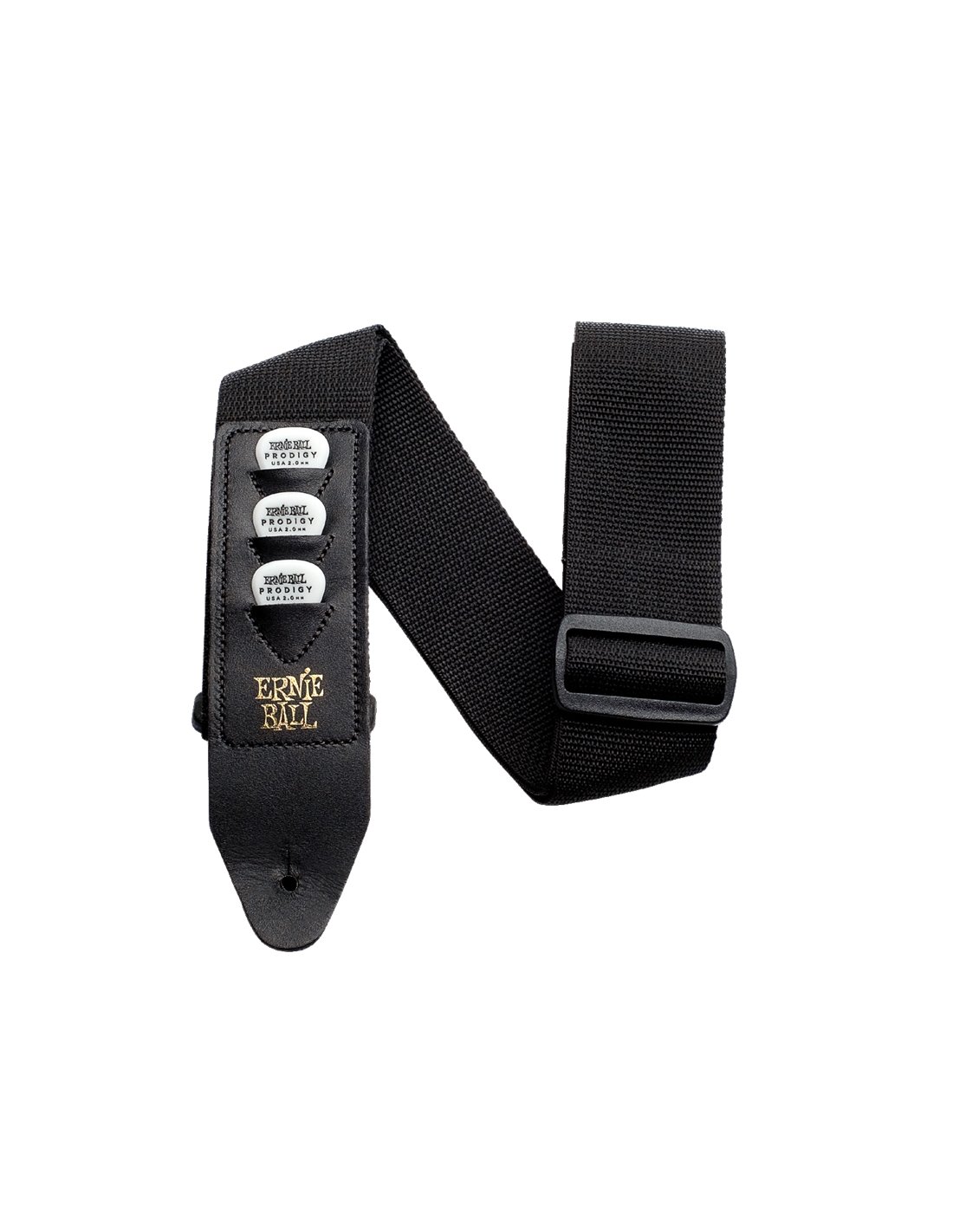 Die 4039 Pickholder Strap von Ernie Ball ist der Gitarren- und Bassgurt in der Farbe Schwarz, entworfen mit einem Lederende, das es dir ermöglicht, bis zu drei Plectren auf der Vorderseite des Gurtes zu platzieren.