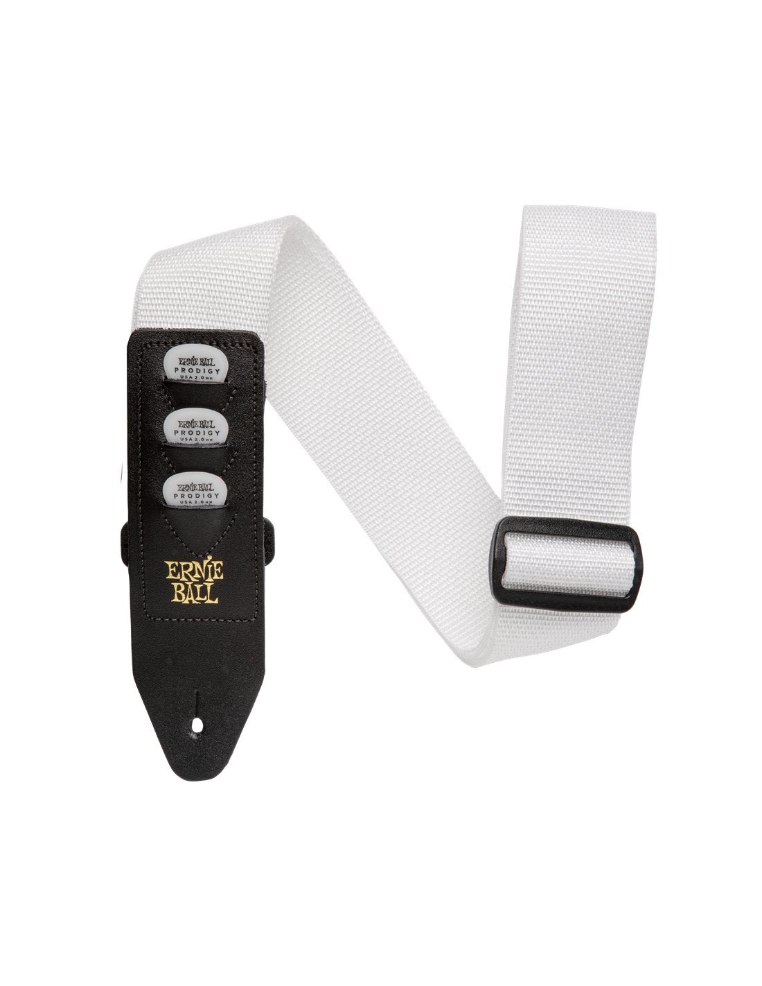 Die 4259 Pickholder Strap von Ernie Ball ist der Gitarren- und Bassgurt in der Farbe Weiß, entworfen mit einem Lederende, das es dir ermöglicht, bis zu drei Plectren auf der Vorderseite des Gurtes zu platzieren.
