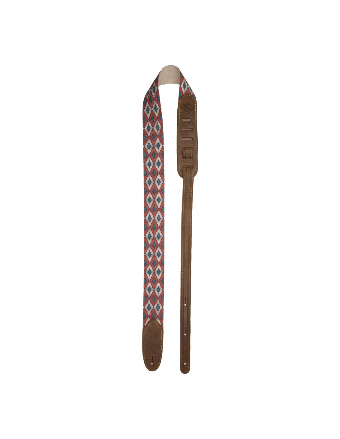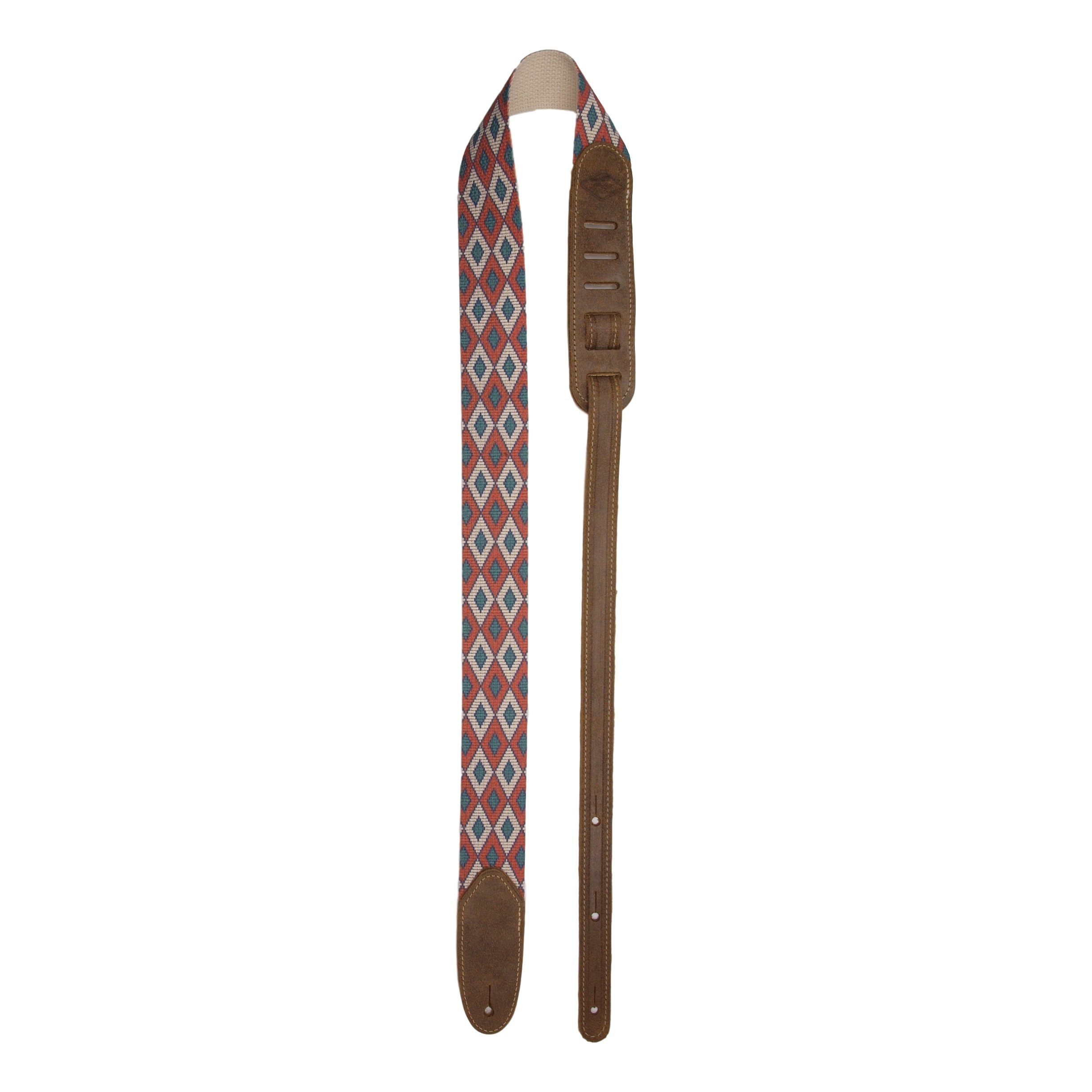 Gitarrengurt 2” aus Baumwolle mit gealterten Wildleder-Enden Gitarrengurt aus Baumwolle mit gealterten Wildleder-EndenDesign inspiriert von SouthwesternMERKMALEHAUPT Länge: Verstellbar von 44” bis 58”Breite: 2”Material: Bedruckte Baumwolle, gealterte Wildleder-EndenMuster: SW34