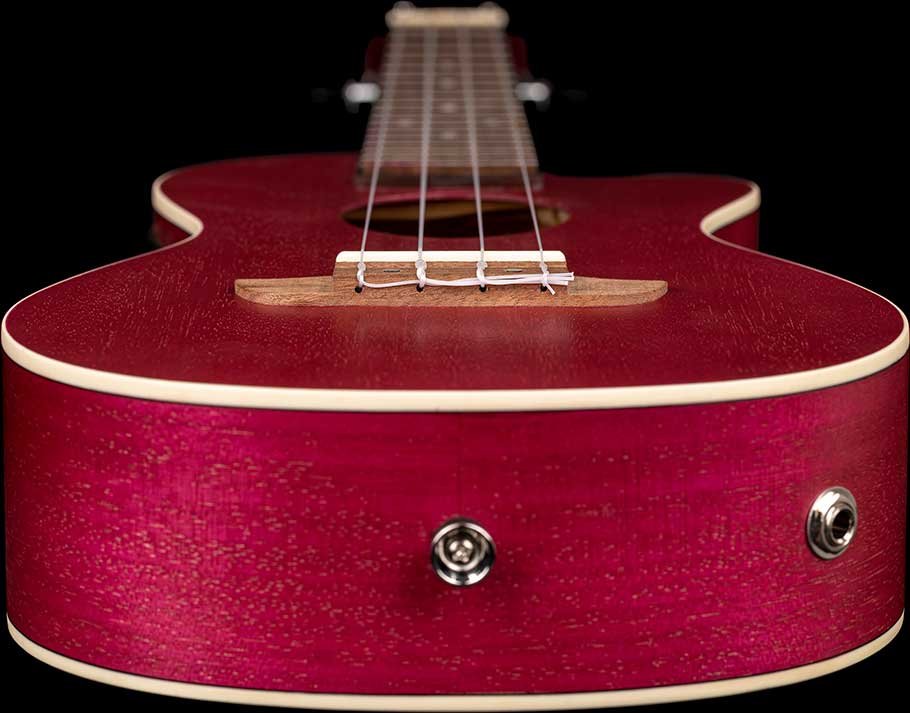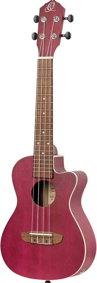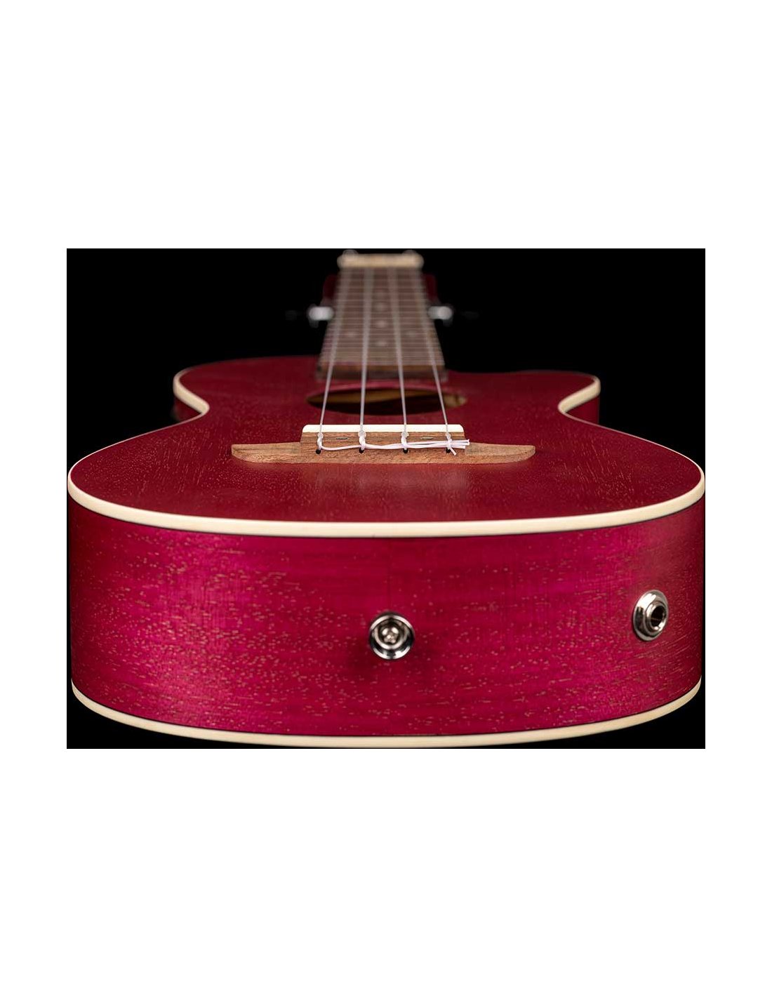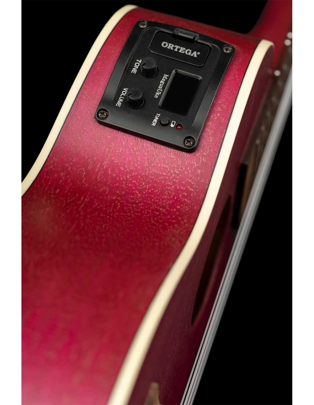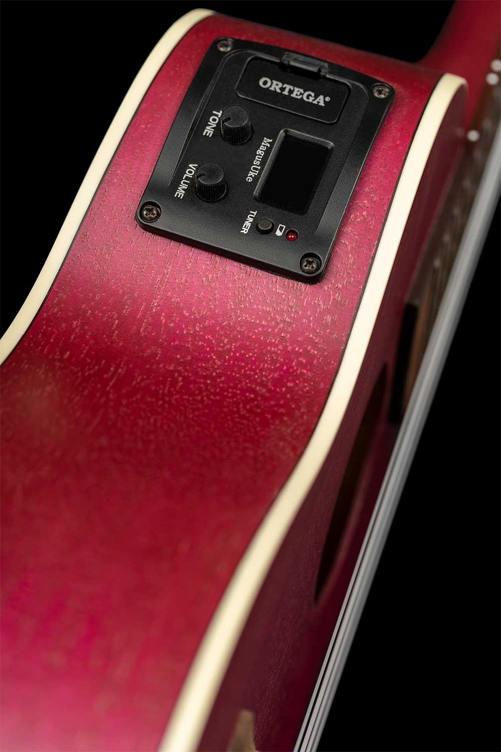 Ukulele-Konzert elektrifiziert Cutaway. Preamp Ortega MagusUke. Rubinfarbe.