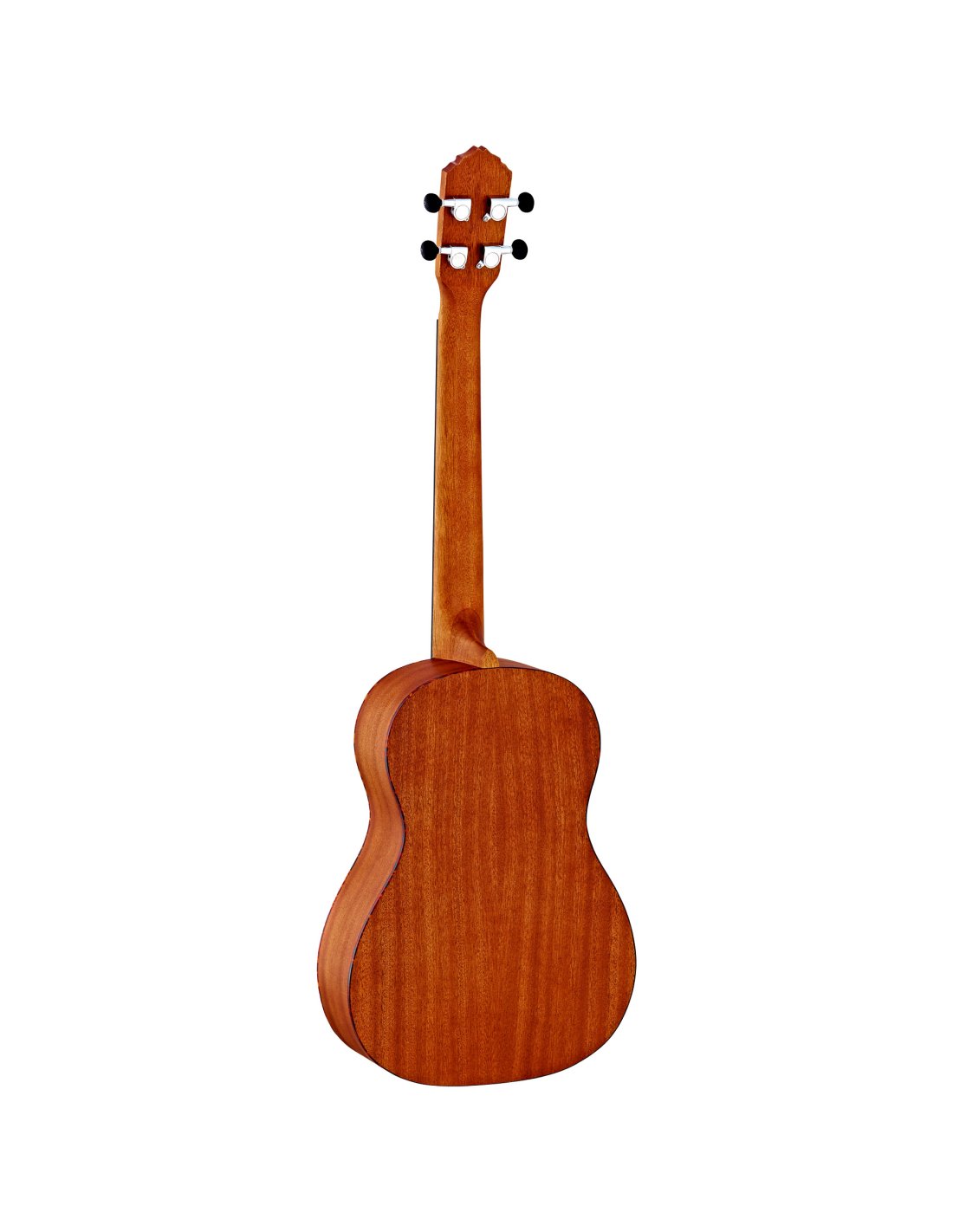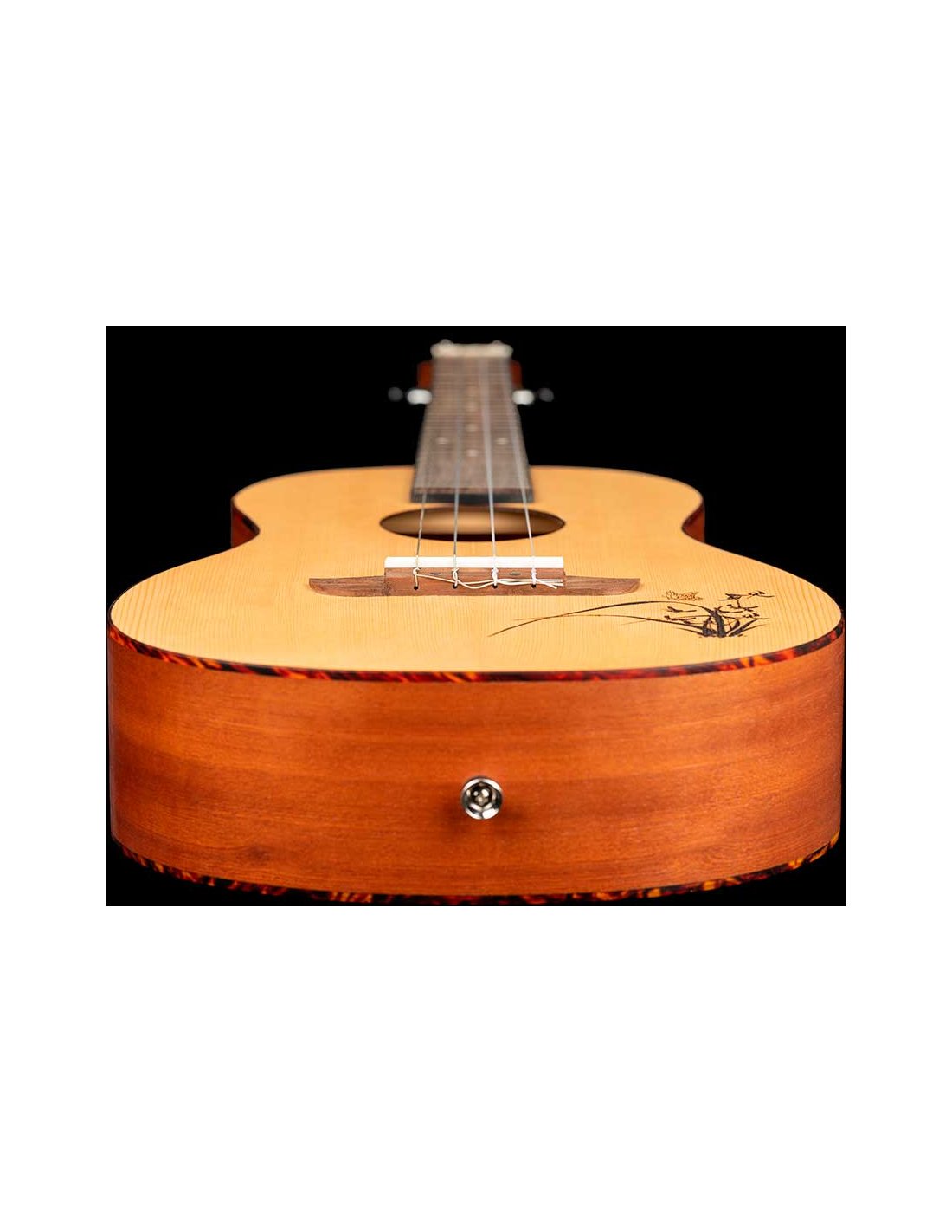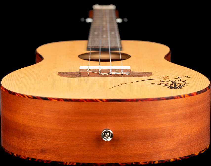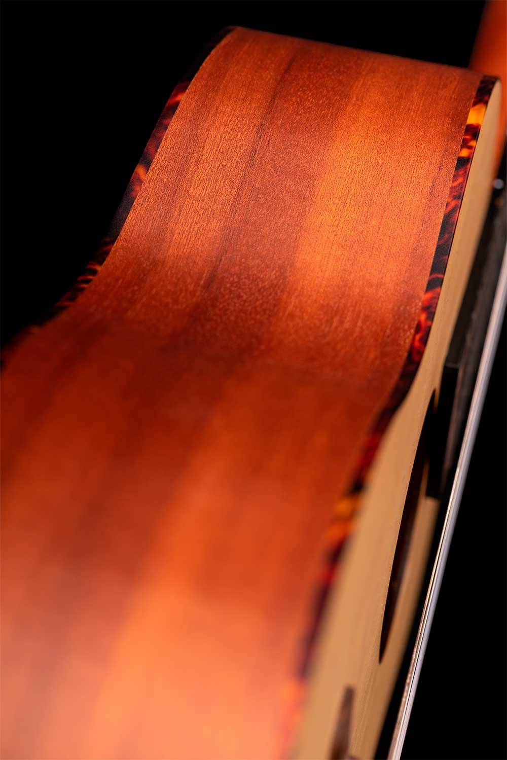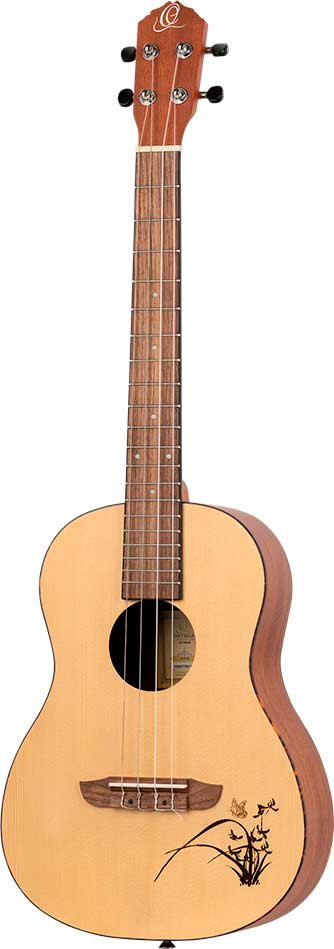 Bariton-Ukulele. Decke aus Fichte, Zargen und Boden aus Sapele. Hals aus Mahagoni, Sonokelin-Griffbrett. Druckguss