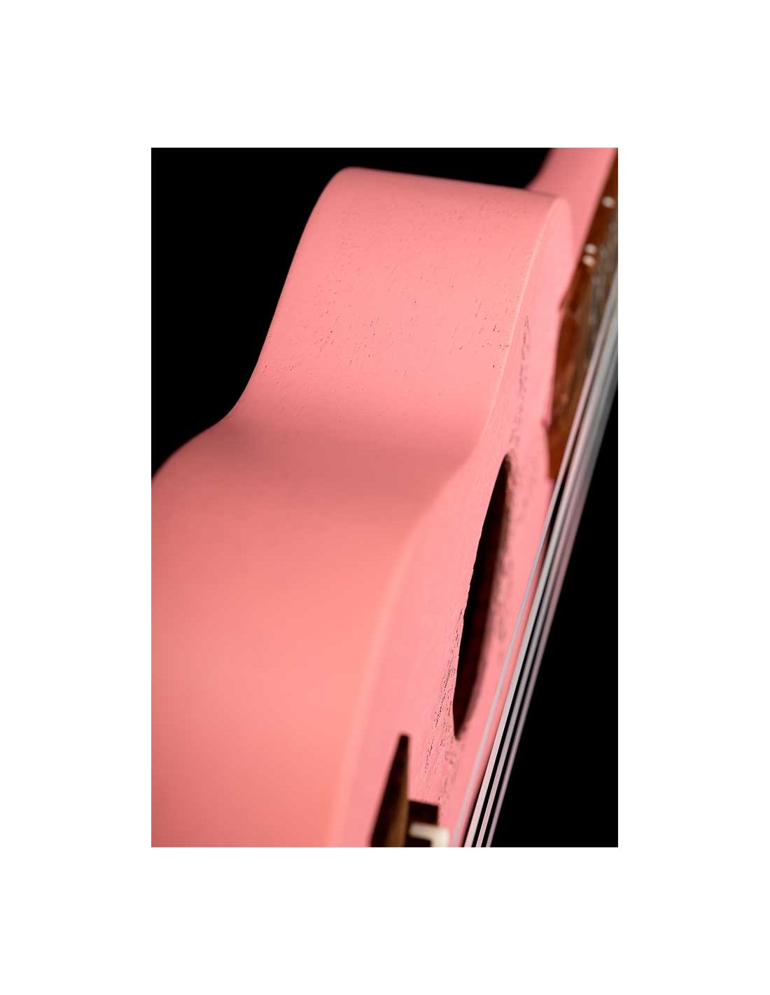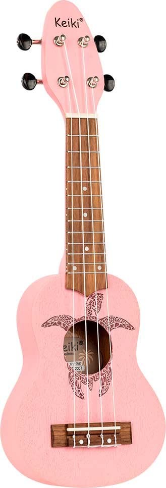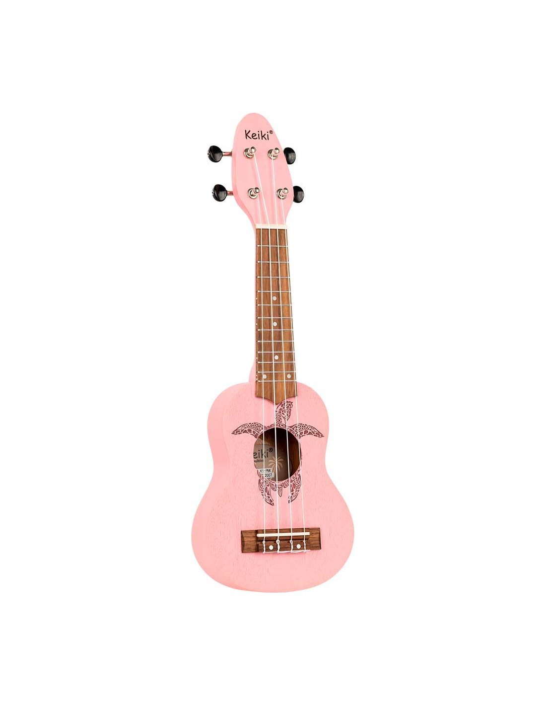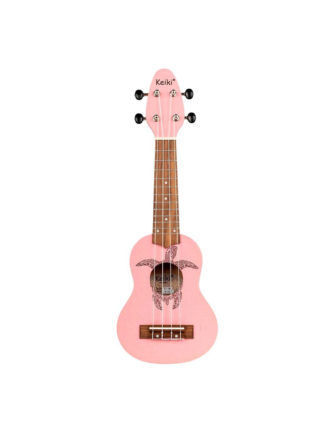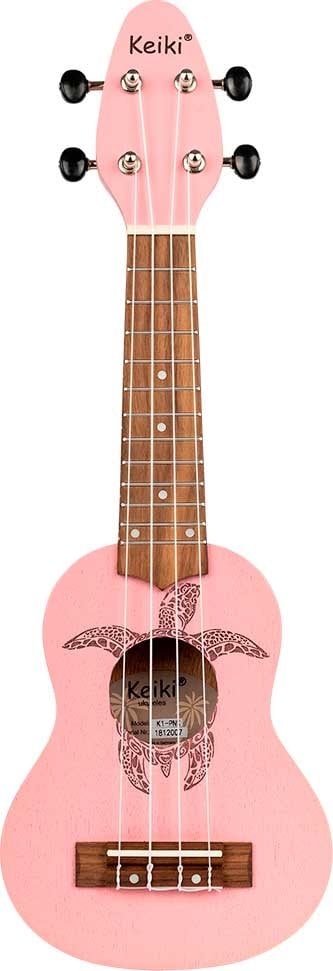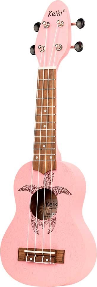 Ukulele Sopranino Keiki K1-MM. (kleiner als das Sopran, Maß 248mm). Satinierte Rosafinish. Korpus und Hals aus Okume, Griffbrett und Steg aus Nussbaum. Decke aus Okume mit Lasergravur einer Schildkröte. Schwarze verchromte Mechaniken. Ausgestattet mit Ortega UWNY--4-SO Saiten für Standard-Sopran.