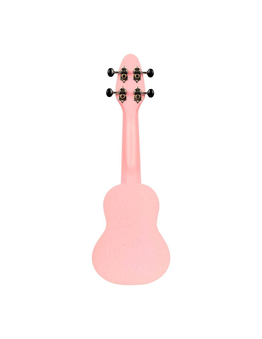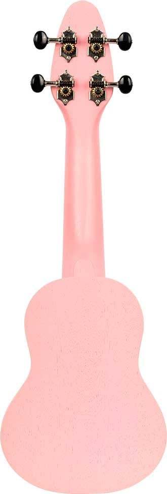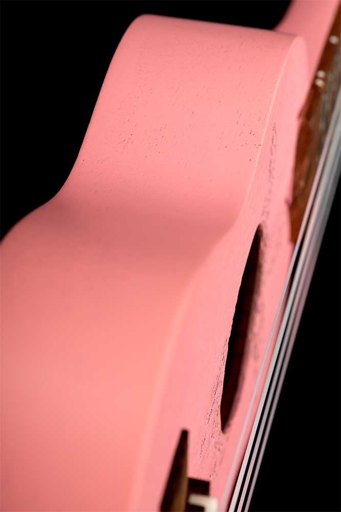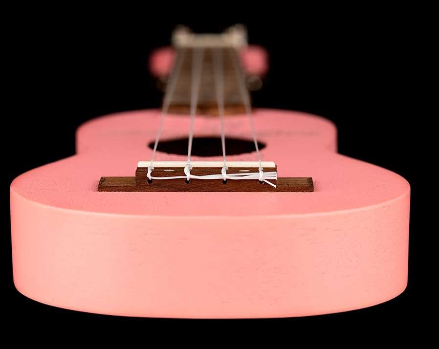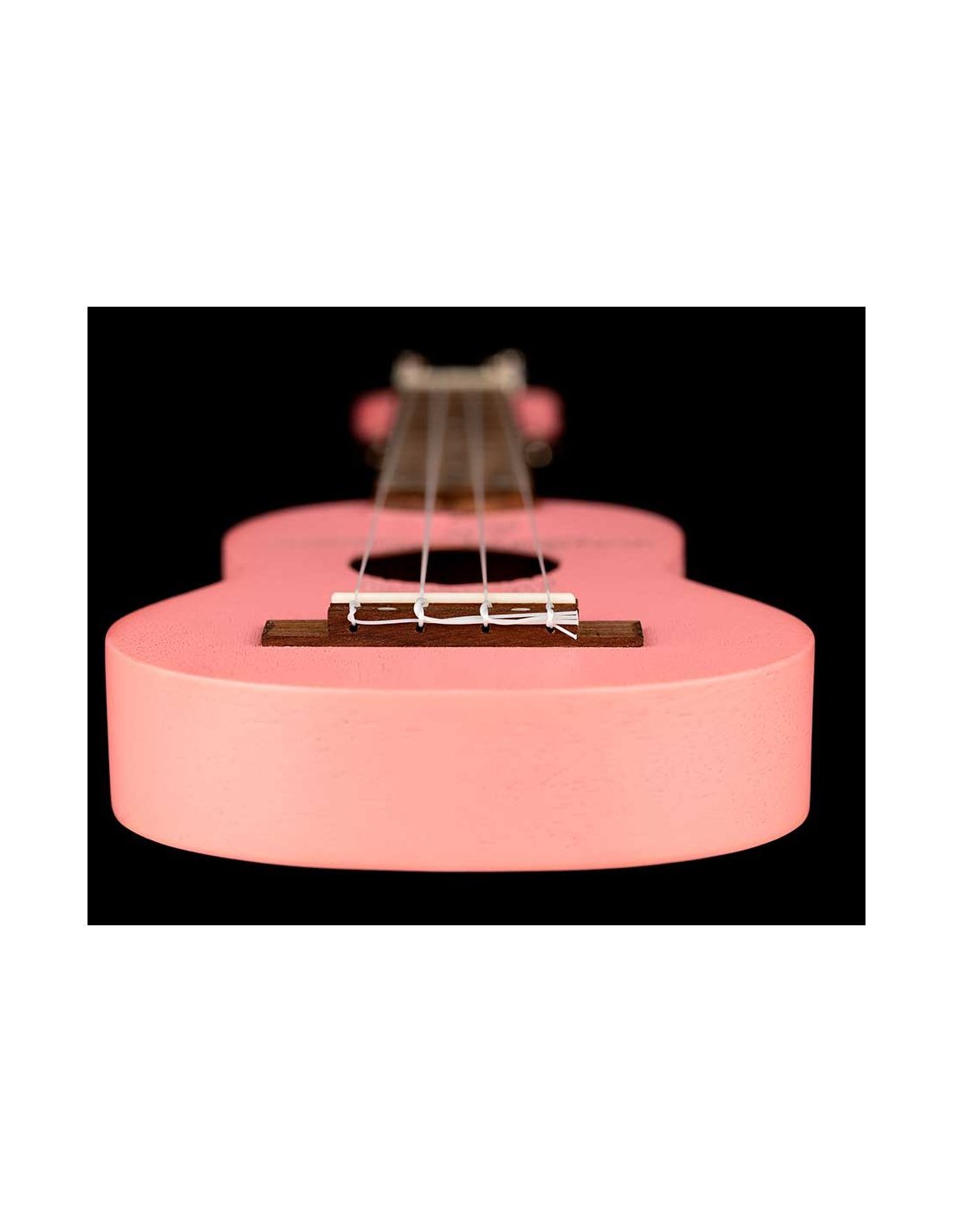 Ukulele Sopranino Keiki K1-MM. (kleiner als das Sopran, Maß 248mm). Satinierte Rosafinish. Korpus und Hals aus Okume, Griffbrett und Steg aus Nussbaum. Decke aus Okume mit Lasergravur einer Schildkröte. Schwarze verchromte Mechaniken. Ausgestattet mit Ortega UWNY--4-SO Saiten für Standard-Sopran.