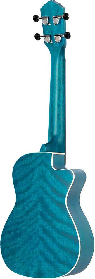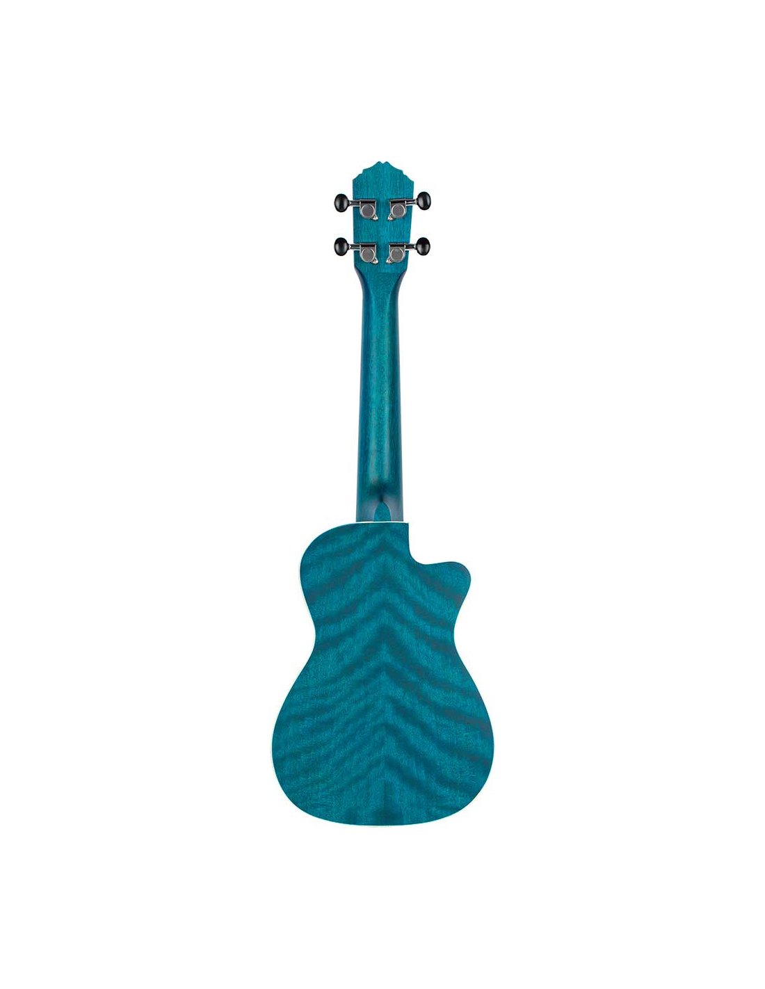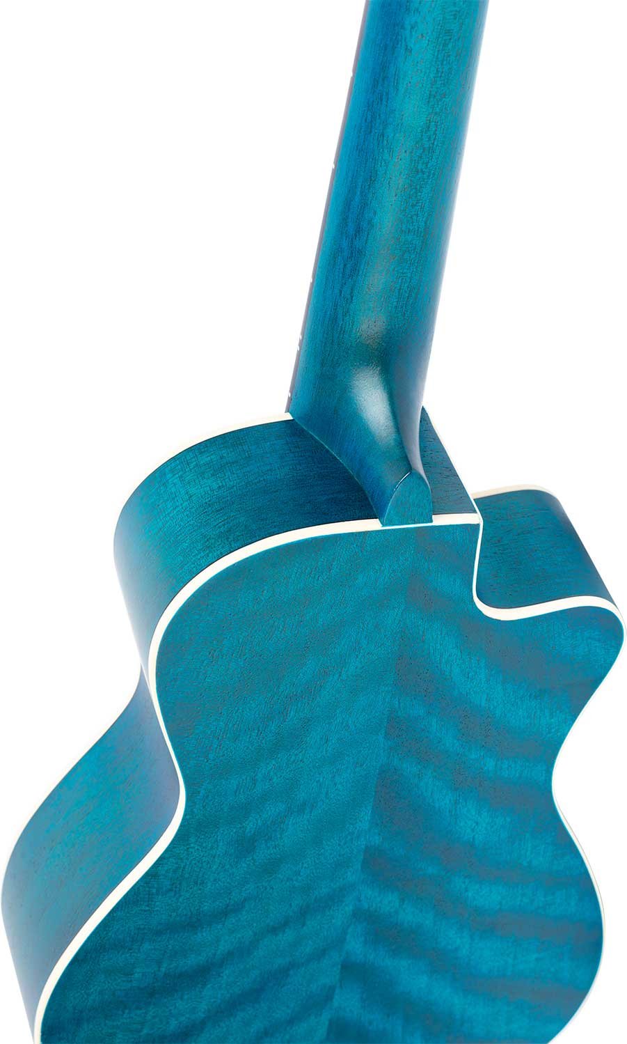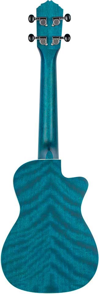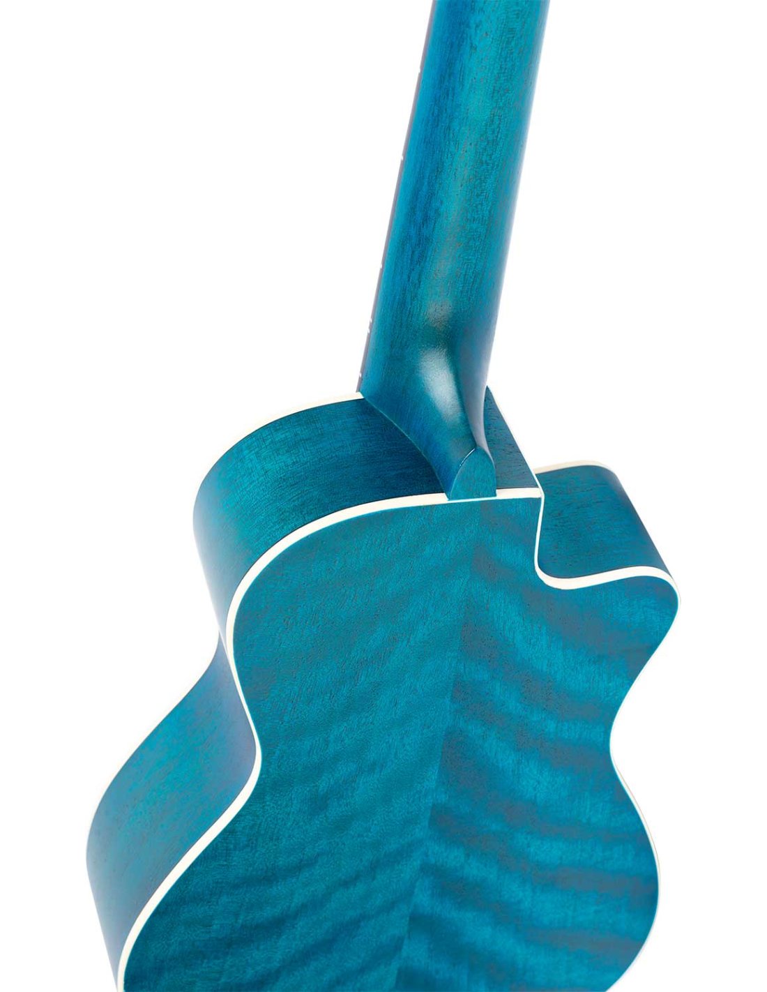 Ukulele-Konzert mit elektrifiziertem Cutaway für MANCINI. Decke, Zargen und Boden aus Okume. Hals aus Mahagoni mit Griffbrett aus Sonokelin. Satinierte blaue Oberfläche.