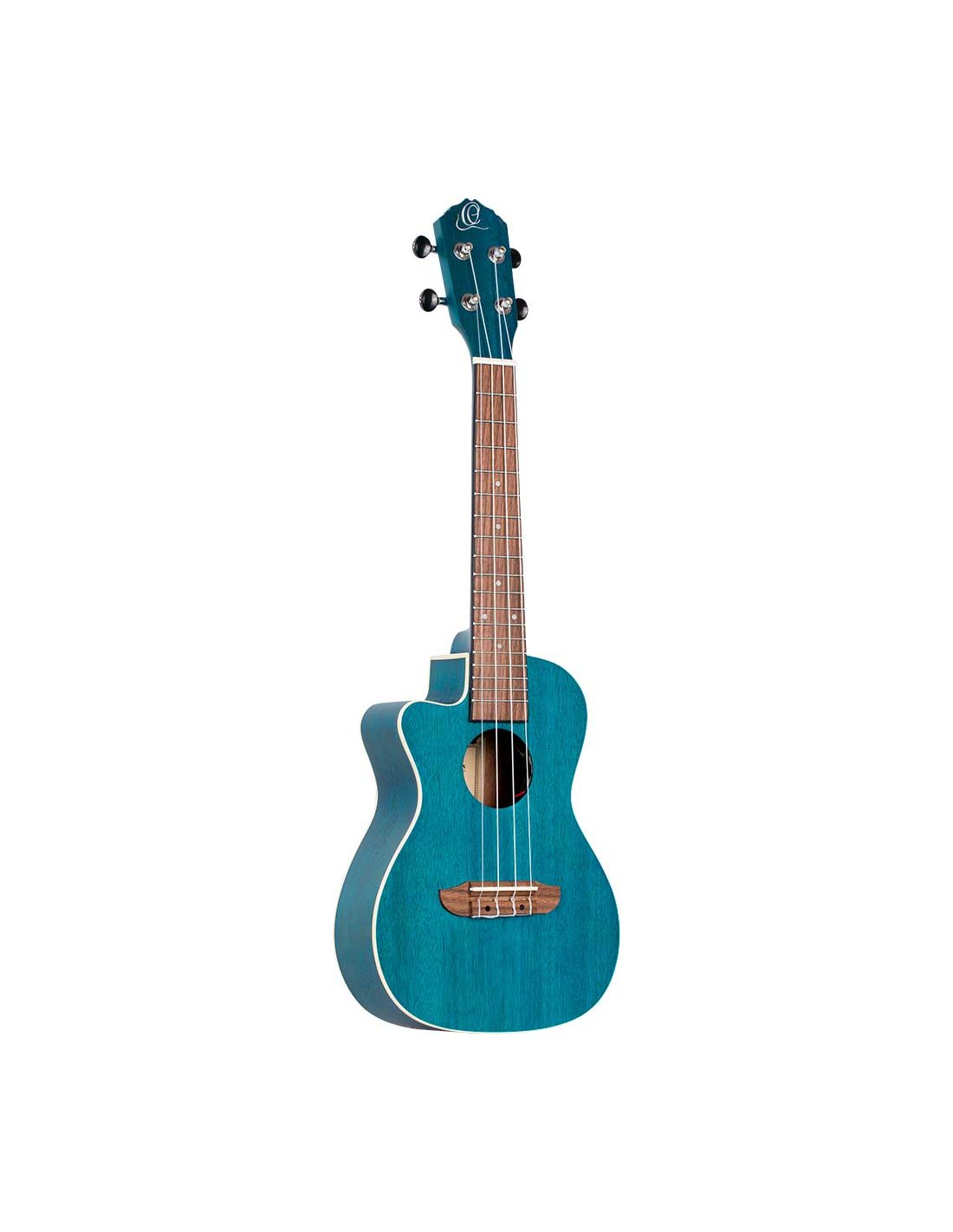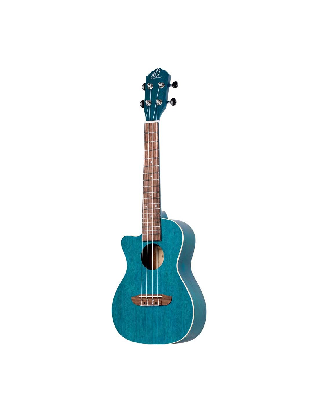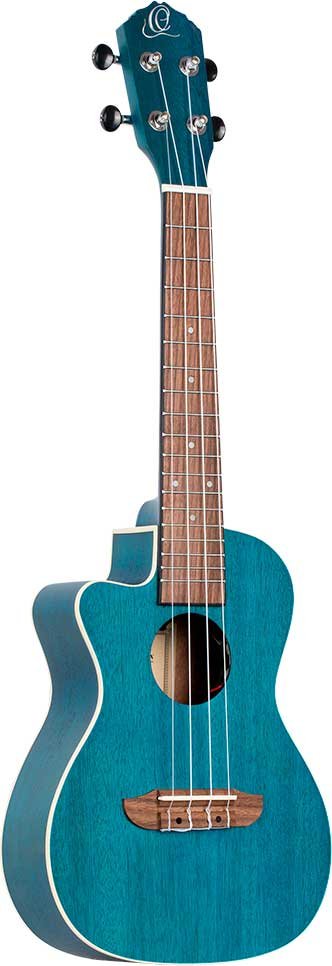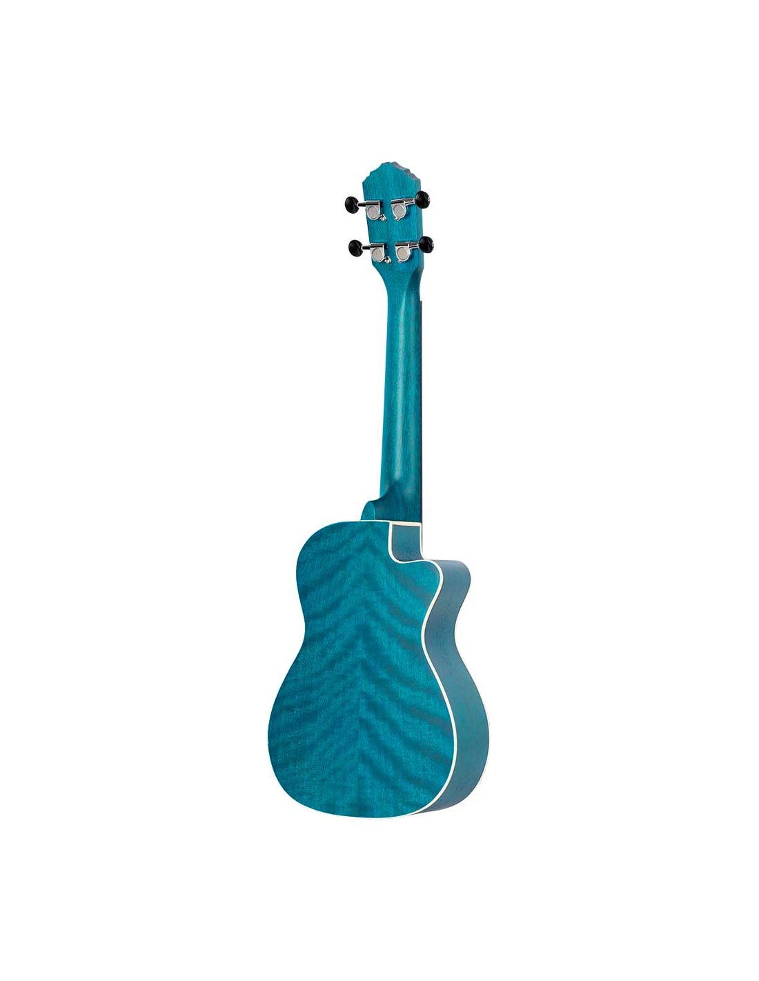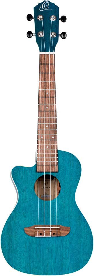 Ukulele-Konzert mit elektrifiziertem Cutaway für MANCINI. Decke, Zargen und Boden aus Okume. Hals aus Mahagoni mit Griffbrett aus Sonokelin. Satinierte blaue Oberfläche.