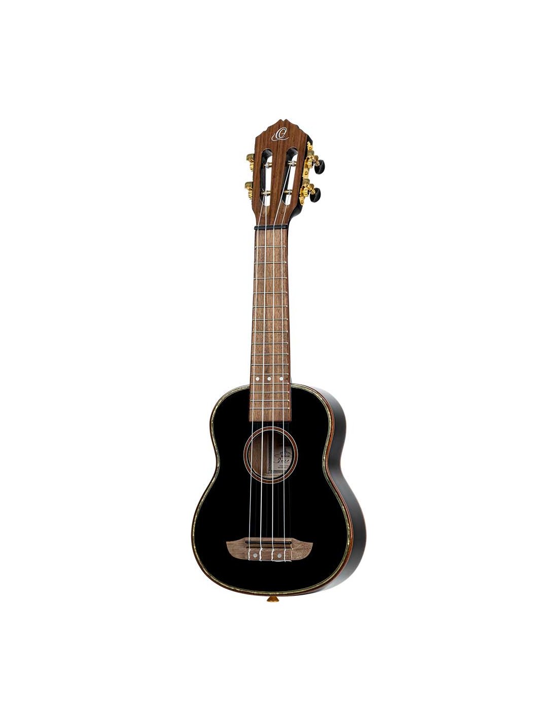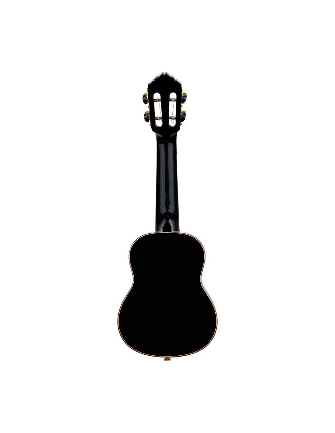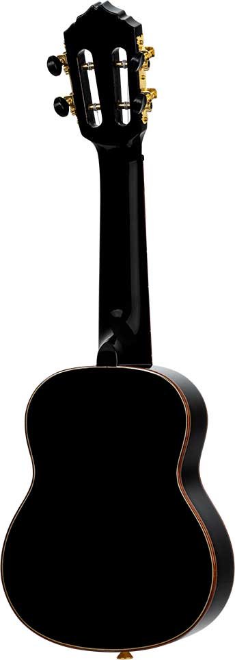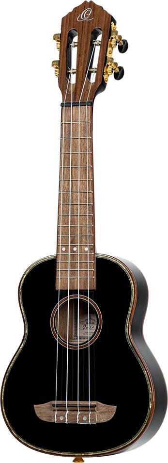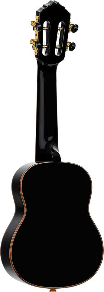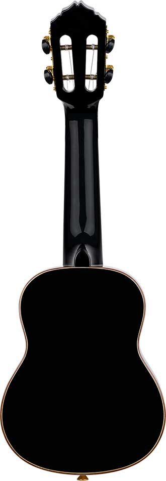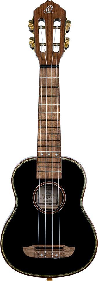 Die Ukeeles der Onyx-Serie sind wunderschöne Instrumente mit einem Korpus aus Mahagoni und einem Hals, einer glänzenden schwarzen Oberfläche, einer Decke aus Walnuss, einem Griffbrett und einem Steg sowie einem Schallloch. Sie sind in Sopran-, Konzert- oder Tenorgröße erhältlich.