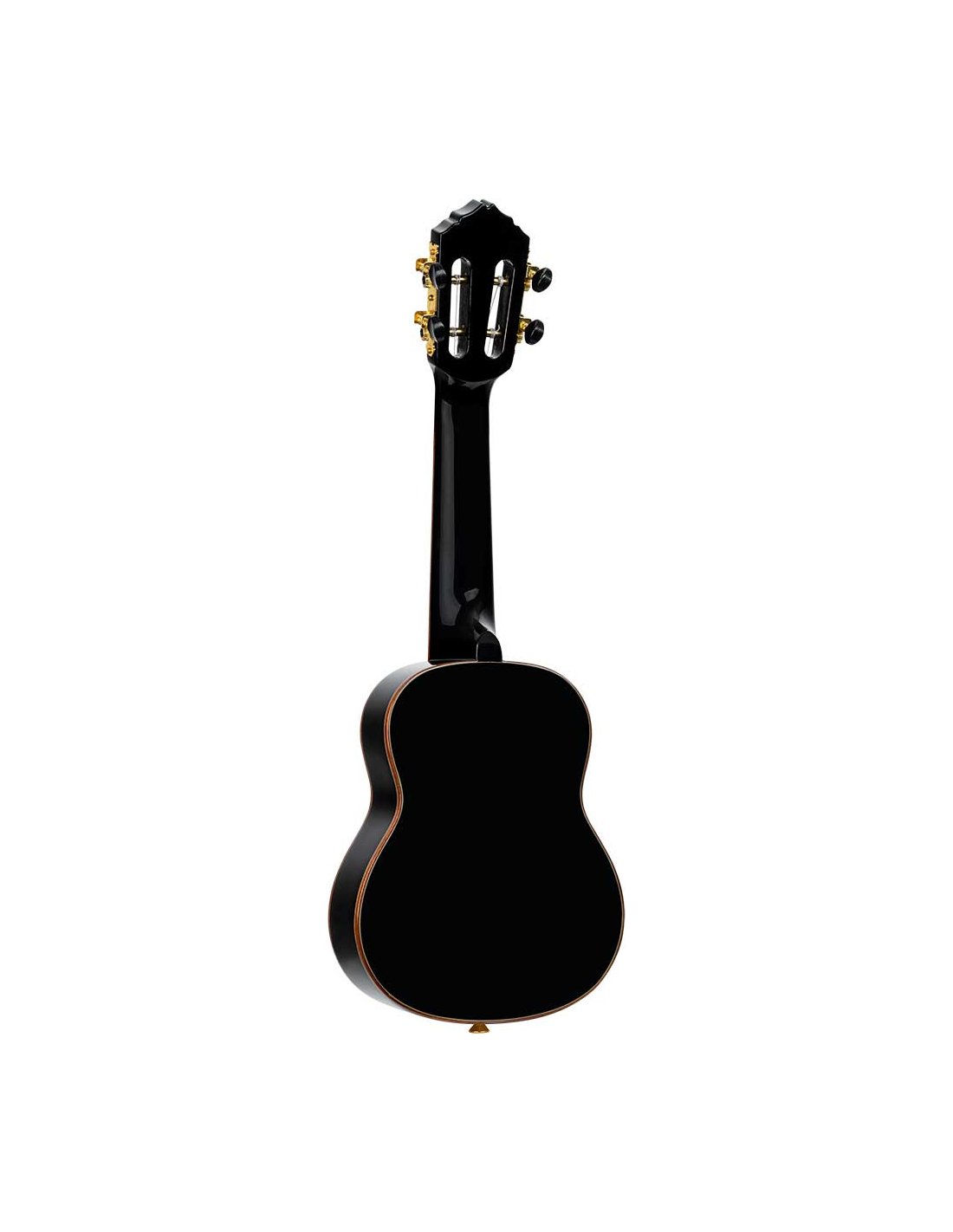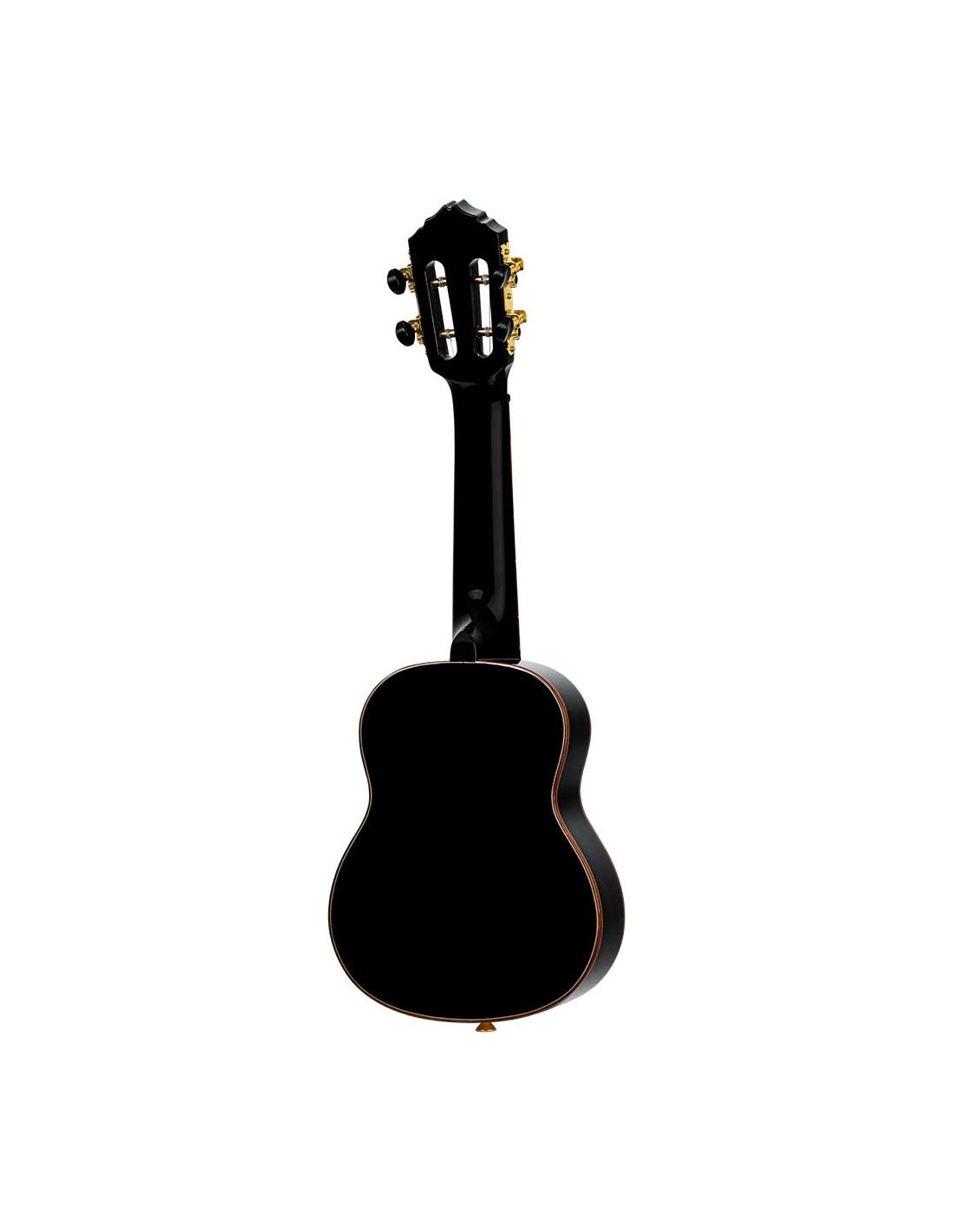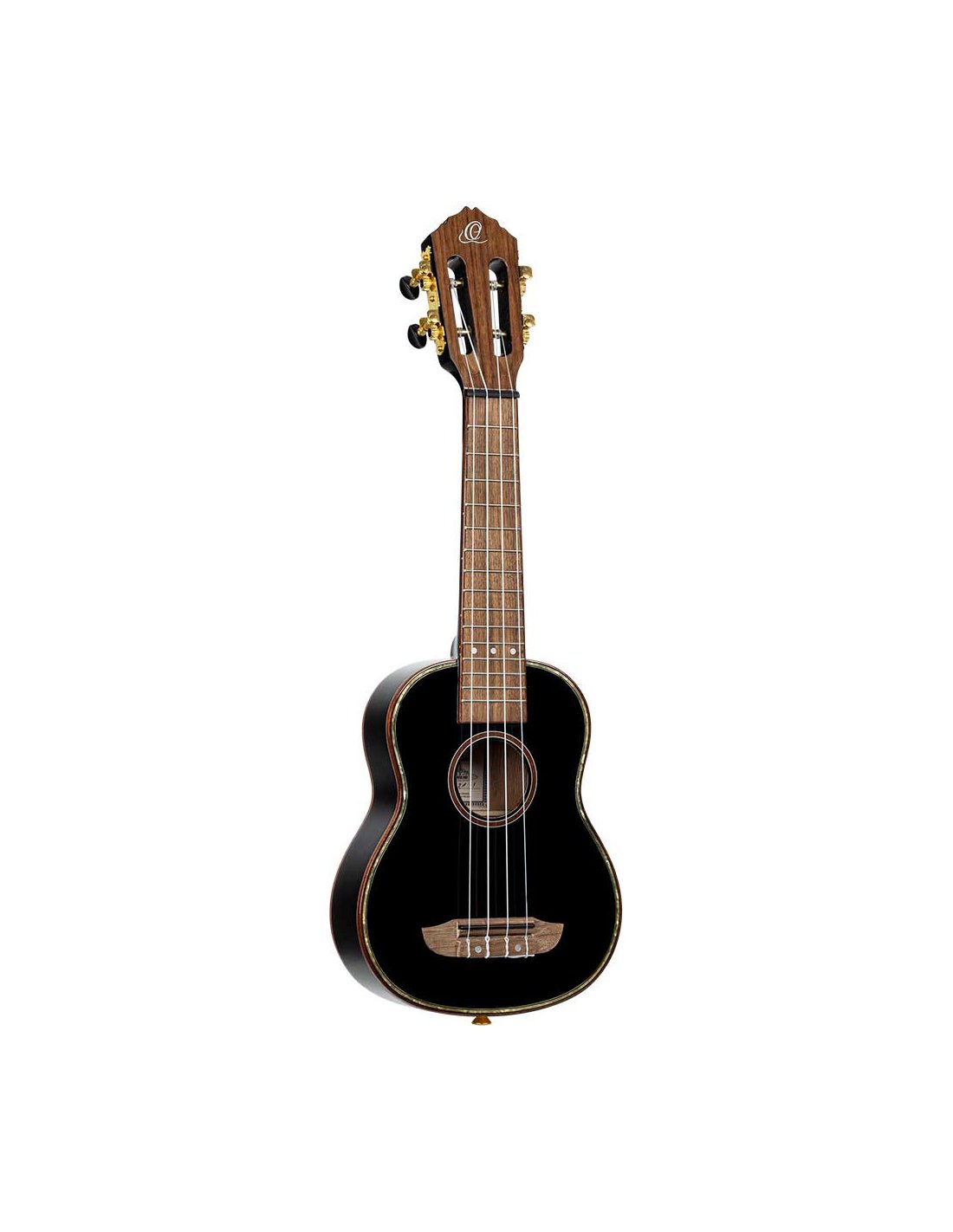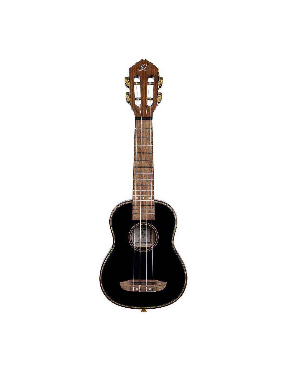 Die Ukeeles der Onyx-Serie sind wunderschöne Instrumente mit einem Korpus aus Mahagoni und einem Hals, einer glänzenden schwarzen Oberfläche, einer Decke aus Walnuss, einem Griffbrett und einem Steg sowie einem Schallloch. Sie sind in Sopran-, Konzert- oder Tenorgröße erhältlich.