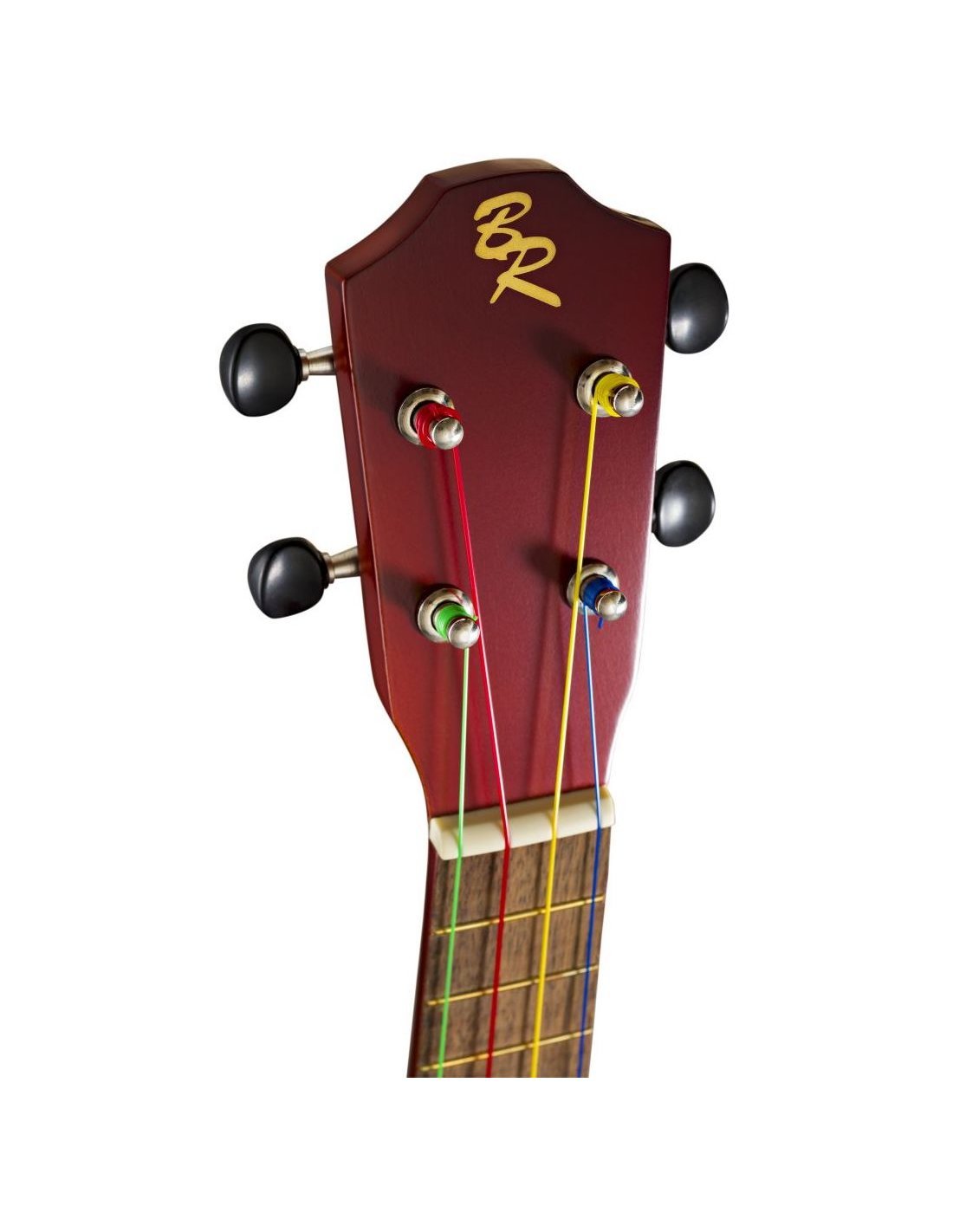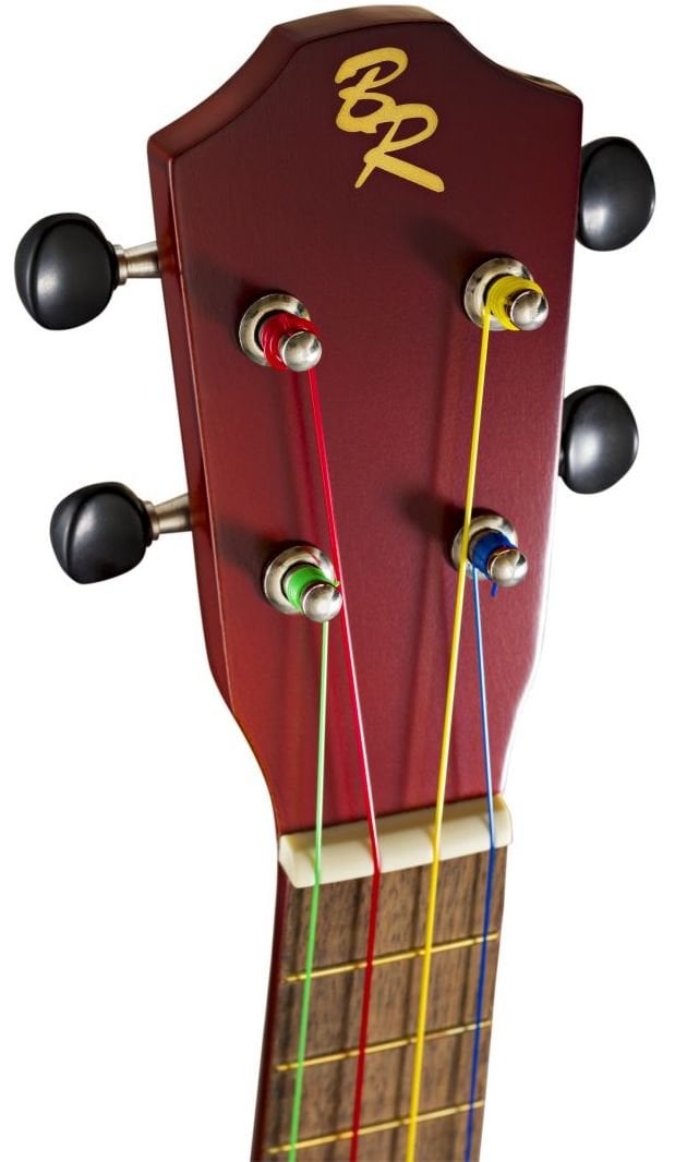 BATON ROUGE UR1-S BRAUN UKULELE SOPRANO ist ein Ukulele im Soprano-Format mit einem Korpus aus Lindenholz, einem Hals aus Okoume, einem 12-Bund-Griffbrett und einer Brücke aus Walnuss, offenen Mechaniken im Gitarrenstil mit schwarzen Knöpfen, einer Mensur von 340 mm, einem Sattel von 35 mm, und vorinstallierten Aquila-Saiten in Boomwhackers-Farben: G = grün, C = rot, E = gelb, A = blau