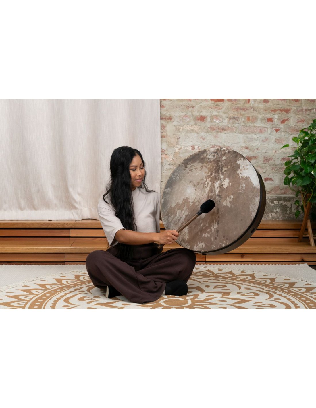 Die rituellen Trommeln Meinl Sonic Energy garantieren eine bemerkenswerte Resonanz, die die Sinne während der Klangbäder oder musikalischen Sitzungen einbezieht. Die angeborene Wärme und der tiefe Klangreichtum verwandeln jeden Schlag in ein hypnotisches Erlebnis, das von rhythmischen Grooves bis hin zu herzähnlichen Schlägen reicht. Entfessle deine Kreativität und forme deine einzigartigen Rhythmen mit dem mitgelieferten Schlägel, während du das fesselnde Potenzial dieser Trommeln erkundest. Hinweis: Unsere Rahmentrommeln sind natürliche Produkte, daher ist jedes Instrument einzigartig und kann unterschiedliche Hauttexturen aufweisen. Kreuzgeknüpfter Schnur für einen perfekten Halt, tiefe und warme Töne, perfekt für Klangbad-Sitzungen. Größe 22'' x 3,5'', 55,9 cm x 8,9 cm SE2024