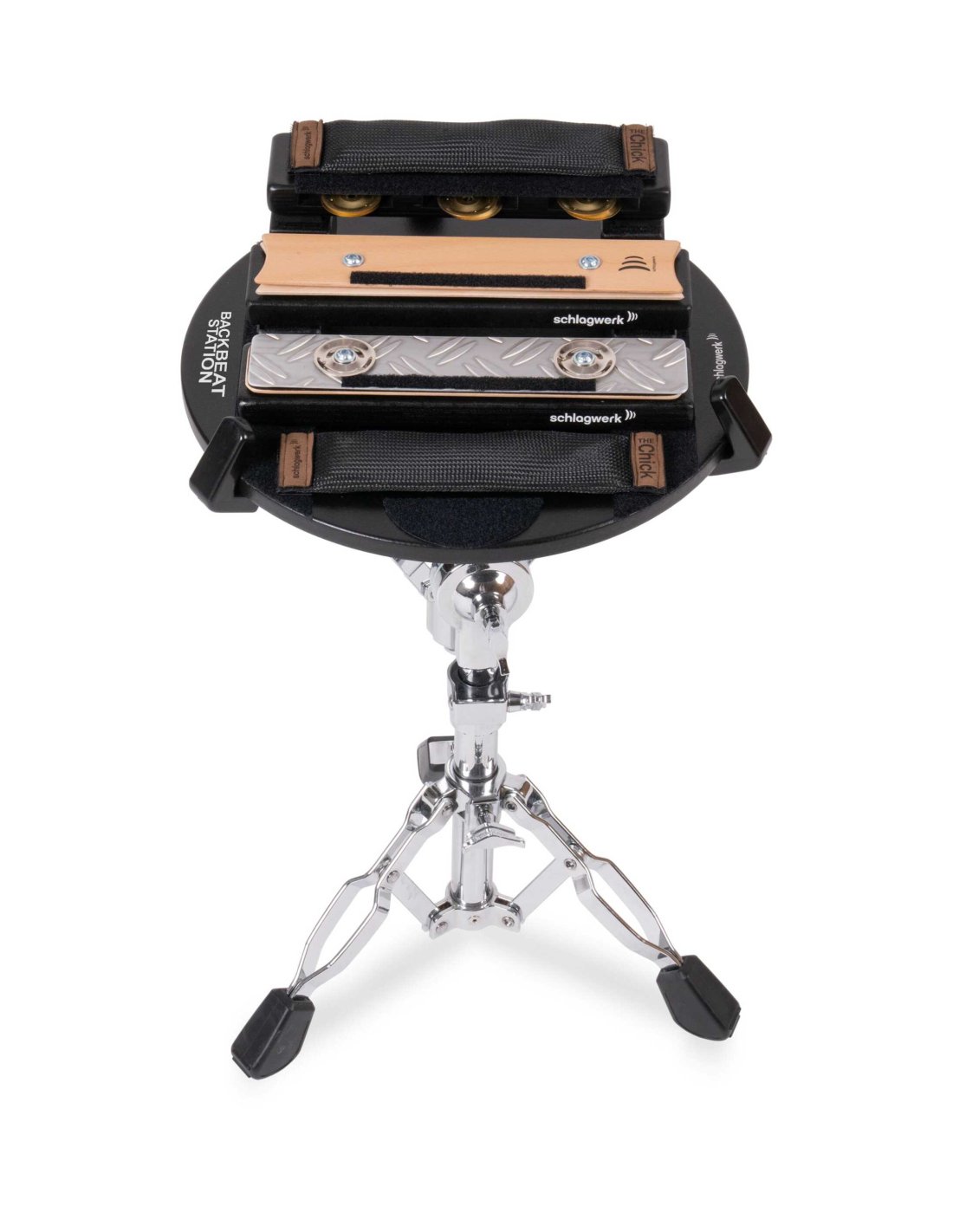 Entwickelt für Schlagzeuger und Percussionisten, bietet die Backbeat Station die neuesten Klangeffekte von Schlagwerk - 4 vorinstallierte Effekte - beinhaltet: runde Basis mit Klettverschluss, Abstandshalter 2 Paare 20x40x60mm + 2 Paare 40x40x60mm, 4 Klangeffekte (1x TheChick, 1x DynaCrasher, 1x AluCrasher, 1x JingleChick Brass)