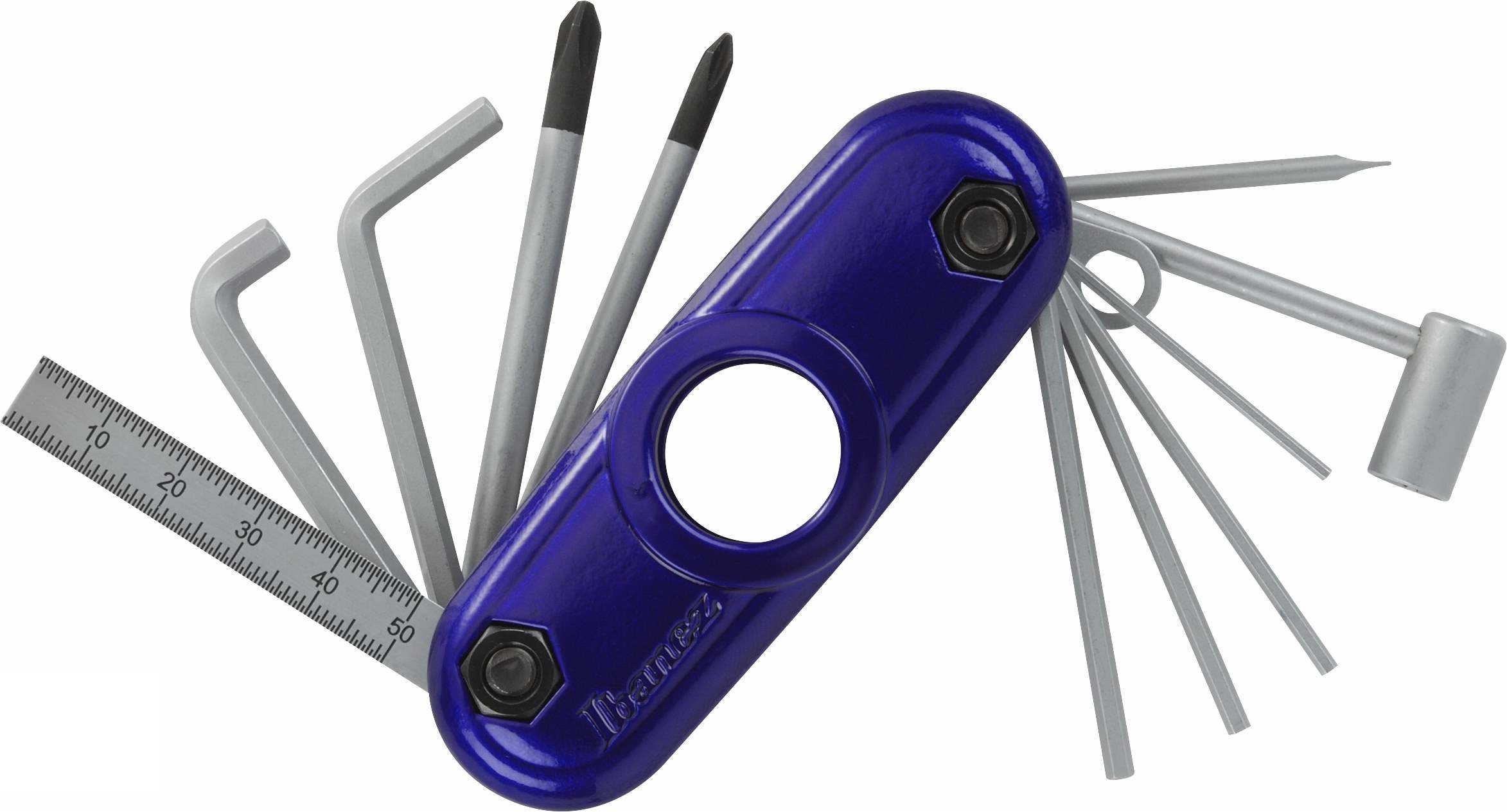 IBANEZ MTZ11-JB MULTITOOL ist ein Multitool-Kit für Gitarre und Bass, das 11 Schnellzugriffs-Multifunktionswerkzeuge umfasst, darunter Inbusschlüssel, Rohrschlüssel, Kreuz- und Schlitzschraubendreher, Maßstab,