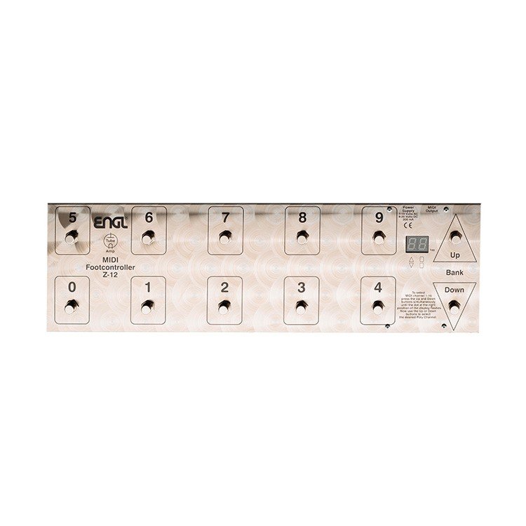 Z12 MIDI FOOT CONTROLLER - Fußcontroller - Ideal für E606SE (Ironball Special Edition), E610 MK2 (Savage 120 MK2), E630 MK2 (Savage 60 MK2), E642 MK2 (Invader 100 MK2), E656 (Steve Morse Signature Head), E365 (Sovereign Combo), E570 (Preamp 19" Special Edition), E580 (Preamp 19" Midi Tube), E640 (Invader 150), E642 MK1 (Invader MK1 100) und E670 (Special Edition) - Gehäuse aus Stahl - 12 Fußschalter mit LED-Anzeigen - Alphanumerisches LED-Display - 128 abrufbare Speicher - MIDI-Kabel - Betrieben mit MIDI Phantom Power - Abmessungen: 50x15x5 cm - Gewicht: 2,8 kg.