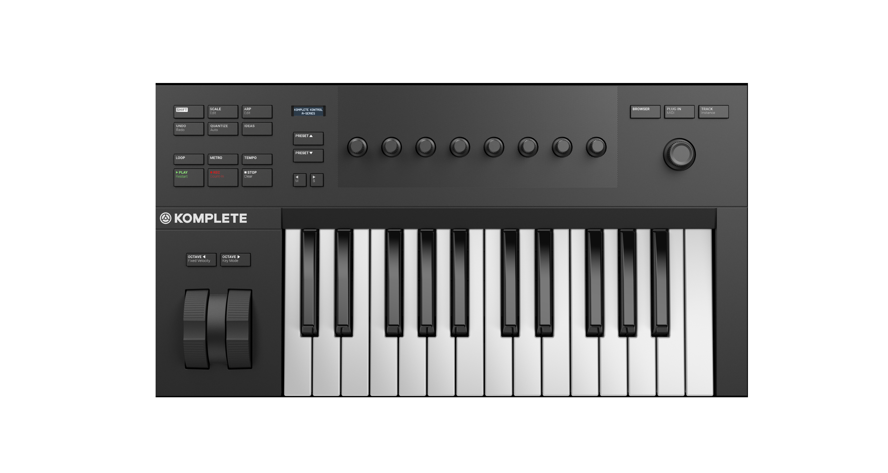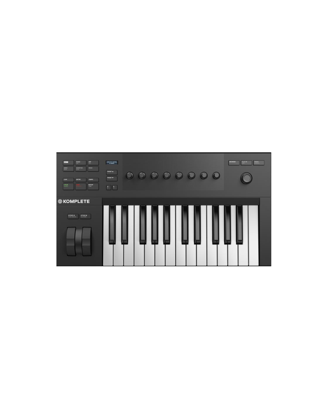 The Komplete Kontrol A25 is a MIDI keyboard from Native Instruments with 25 keys. It is equipped with 8 touch-sensitive control knobs, 2 pitch bend and modulation wheels, OLED display and pre-mapped control for Komplete instruments and effects and Native Kontrol Standard plugins