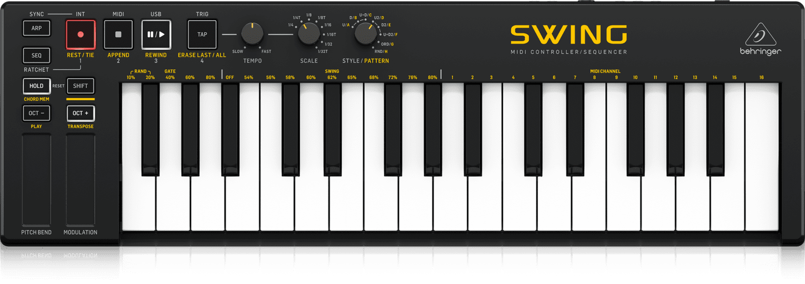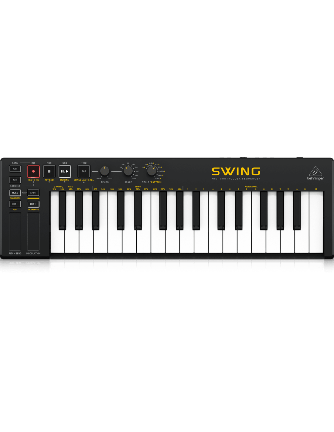 BEHRINGER SWING is a 32-key MIDI/USB controller with a 64-step, 8-voice sequencer and tactile pitch and modulation controls. It has Chord play mode that allows you to play a 16-note chord with a single key, arpeggiator with 8 simultaneous voices per step and 8 styles, Record, Play and Stop performance controls, Shift function to select the Midi channel, gate time and swing. It features CV/Gate and Sync connectors for controlling synthesizers and controllers, USB port, MIDI