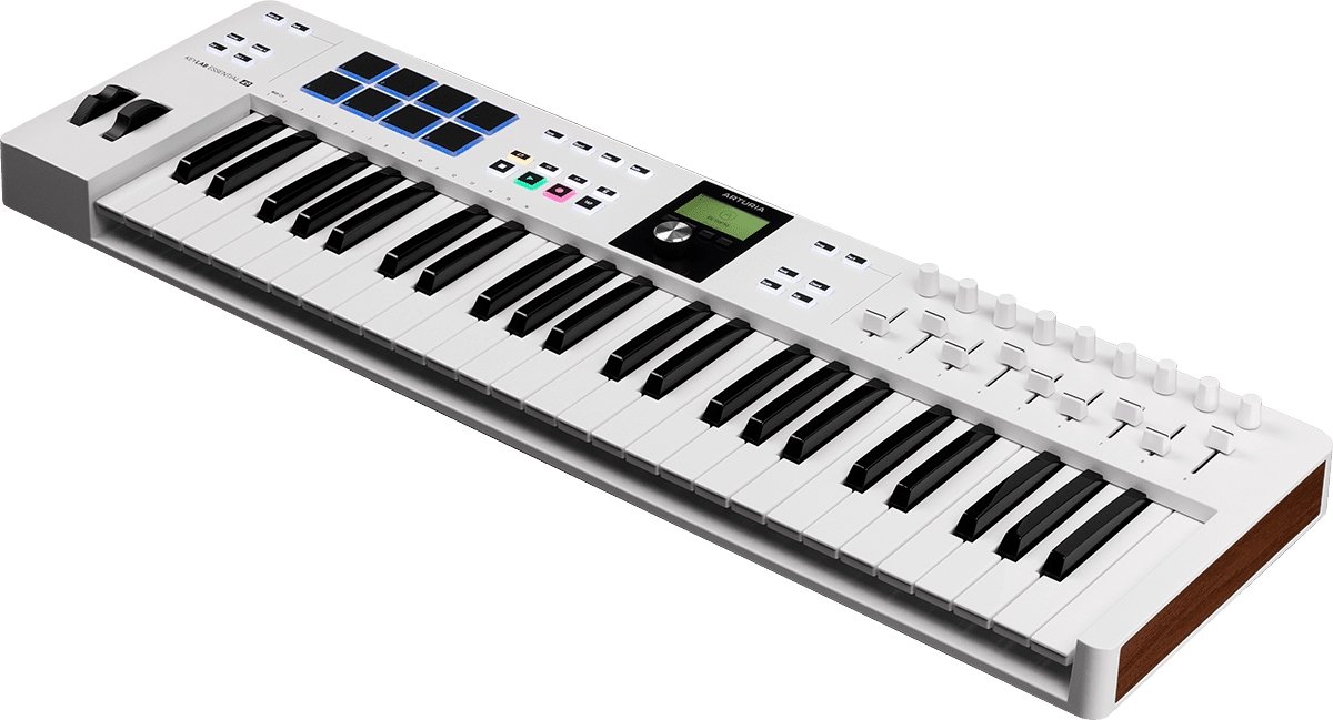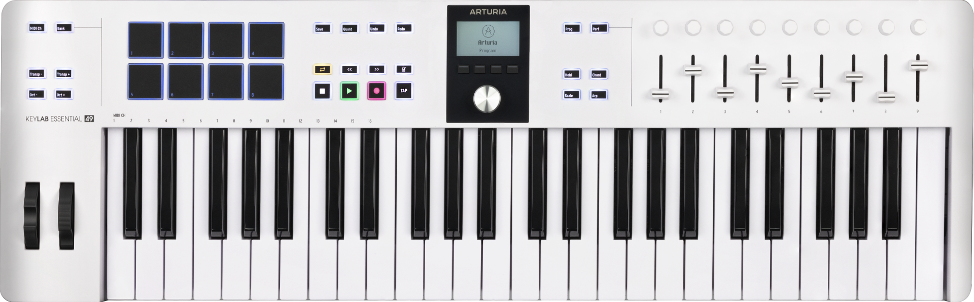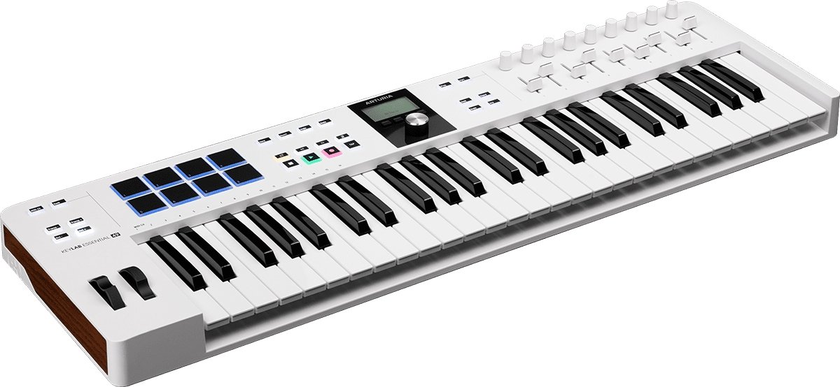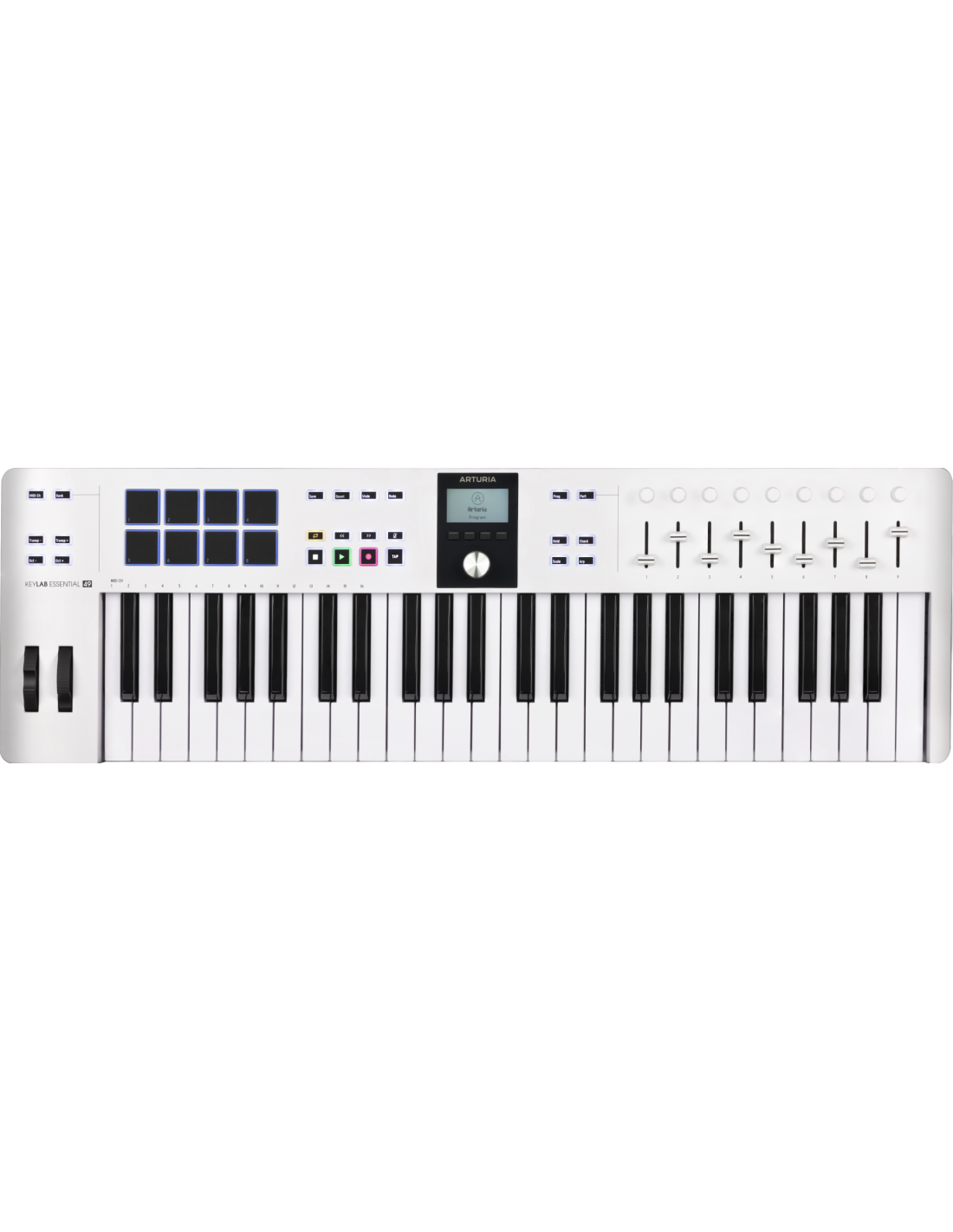 The Keylab 49 Essential MK3 White is an Arturia MIDI keyboard in white color, with 49 keys. It is equipped with 8 backlit pads, 9 faders and rotary controls, DAW command center and transport section, 2.5-inch LCD screen and 2 pitch bend and modulation wheels