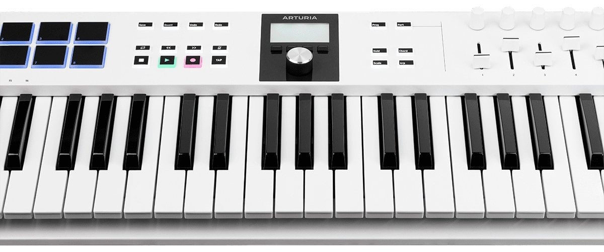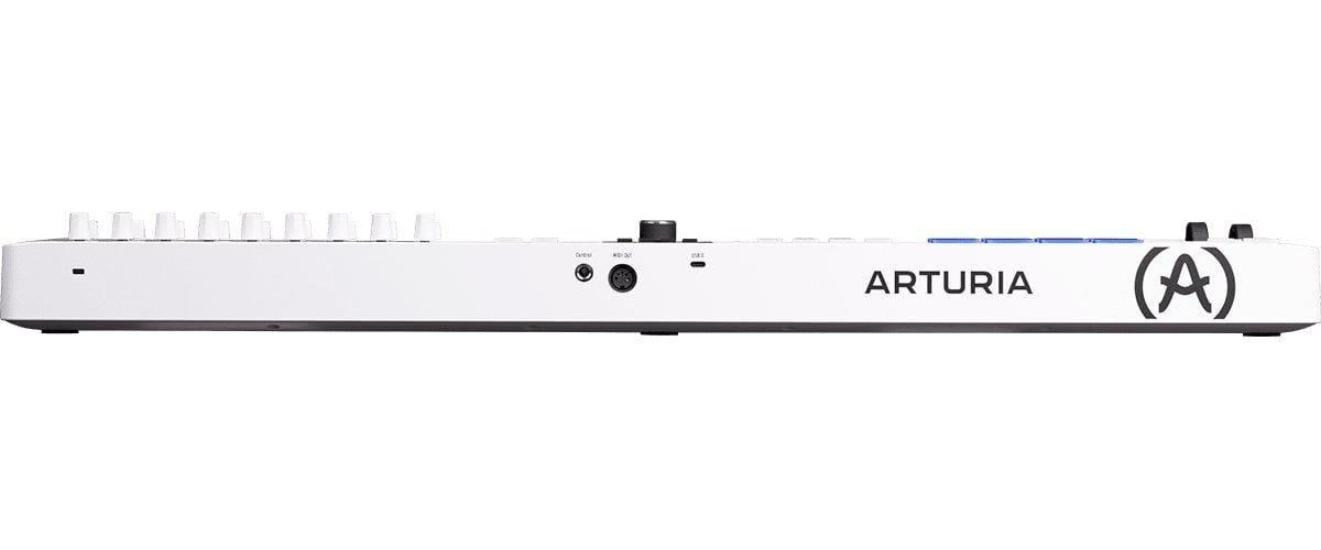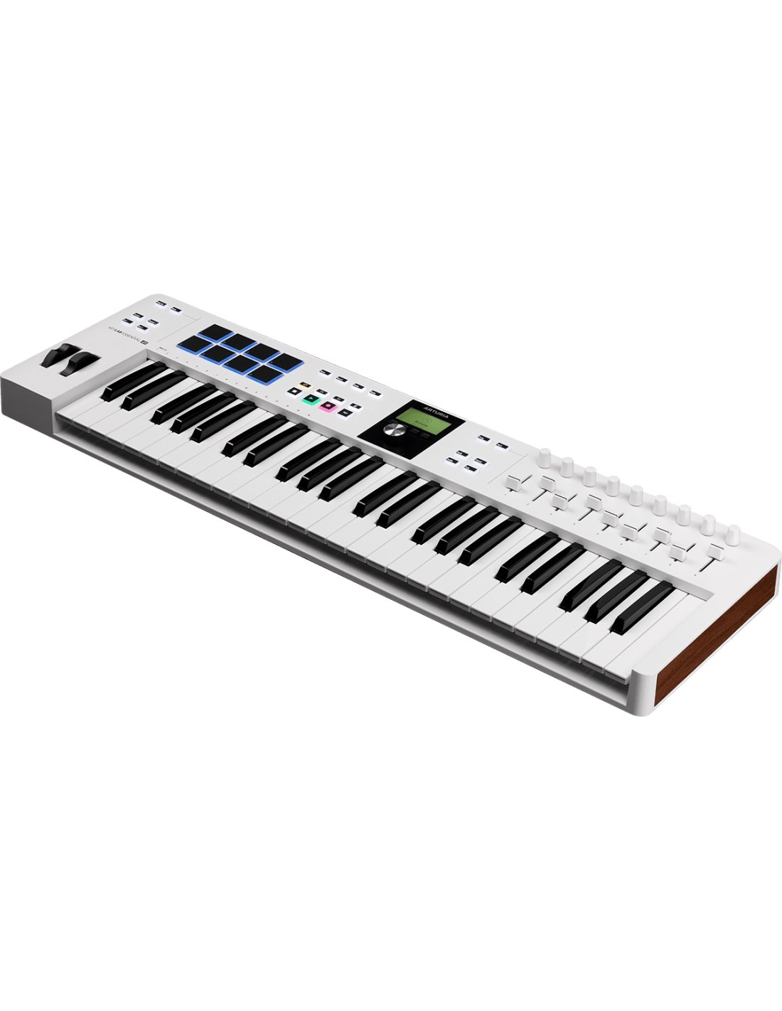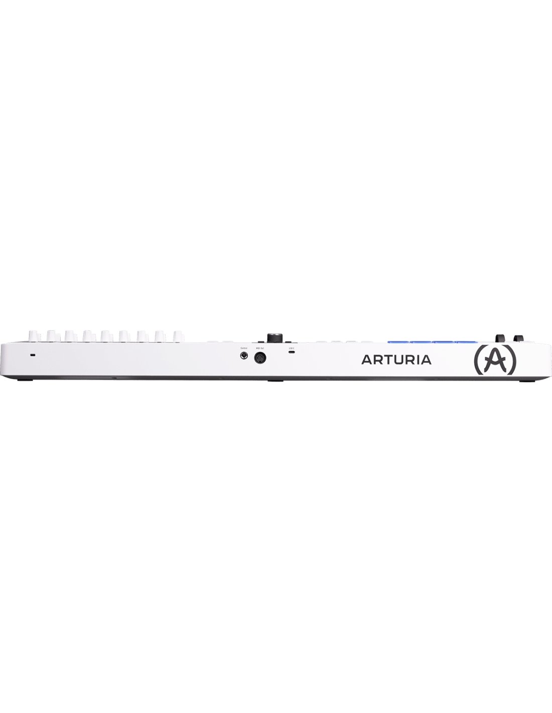 The Keylab 49 Essential MK3 White is an Arturia MIDI keyboard in white color, with 49 keys. It is equipped with 8 backlit pads, 9 faders and rotary controls, DAW command center and transport section, 2.5-inch LCD screen and 2 pitch bend and modulation wheels