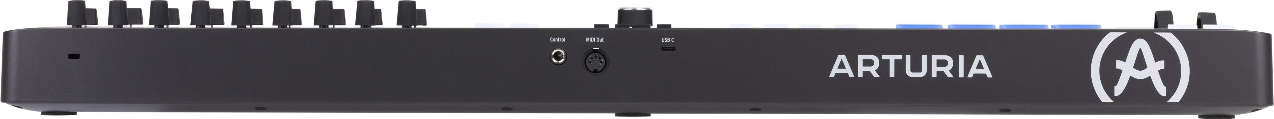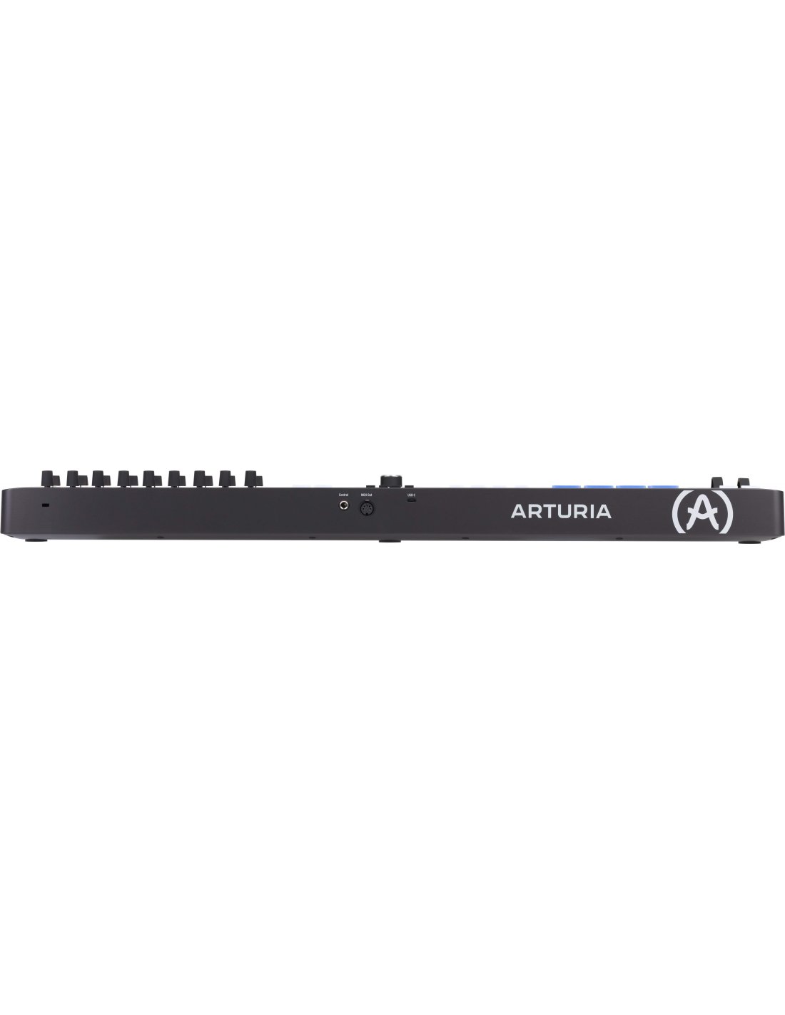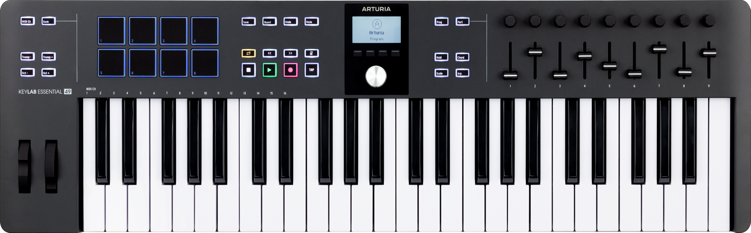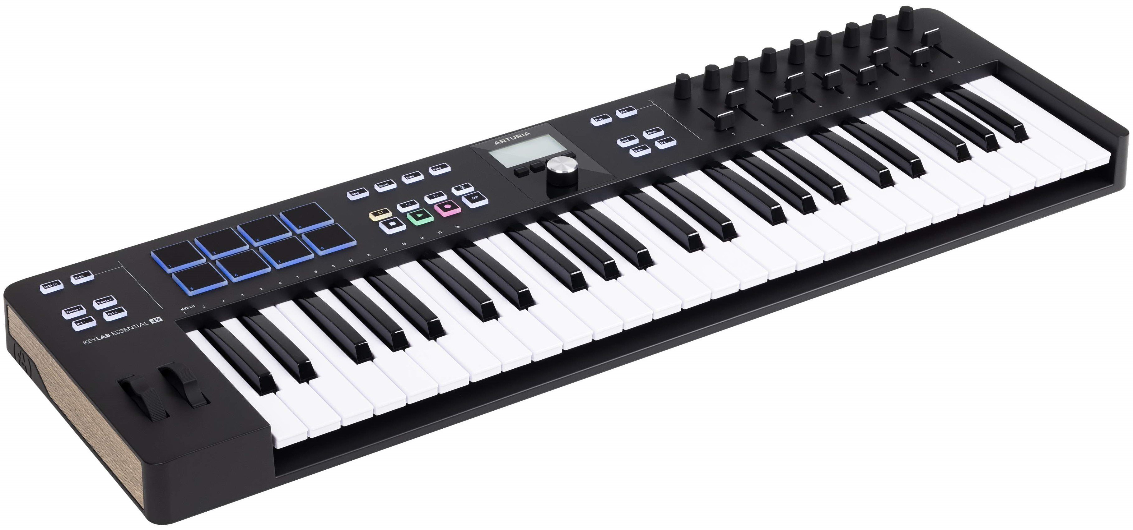 The Keylab 49 Essential MK3 Black is an Arturia MIDI keyboard in black color, with 49 keys. It is equipped with 8 backlit pads, 9 faders and rotary controls, DAW command center and transport section, 2.5-inch LCD screen and 2 pitch bend and modulation wheels