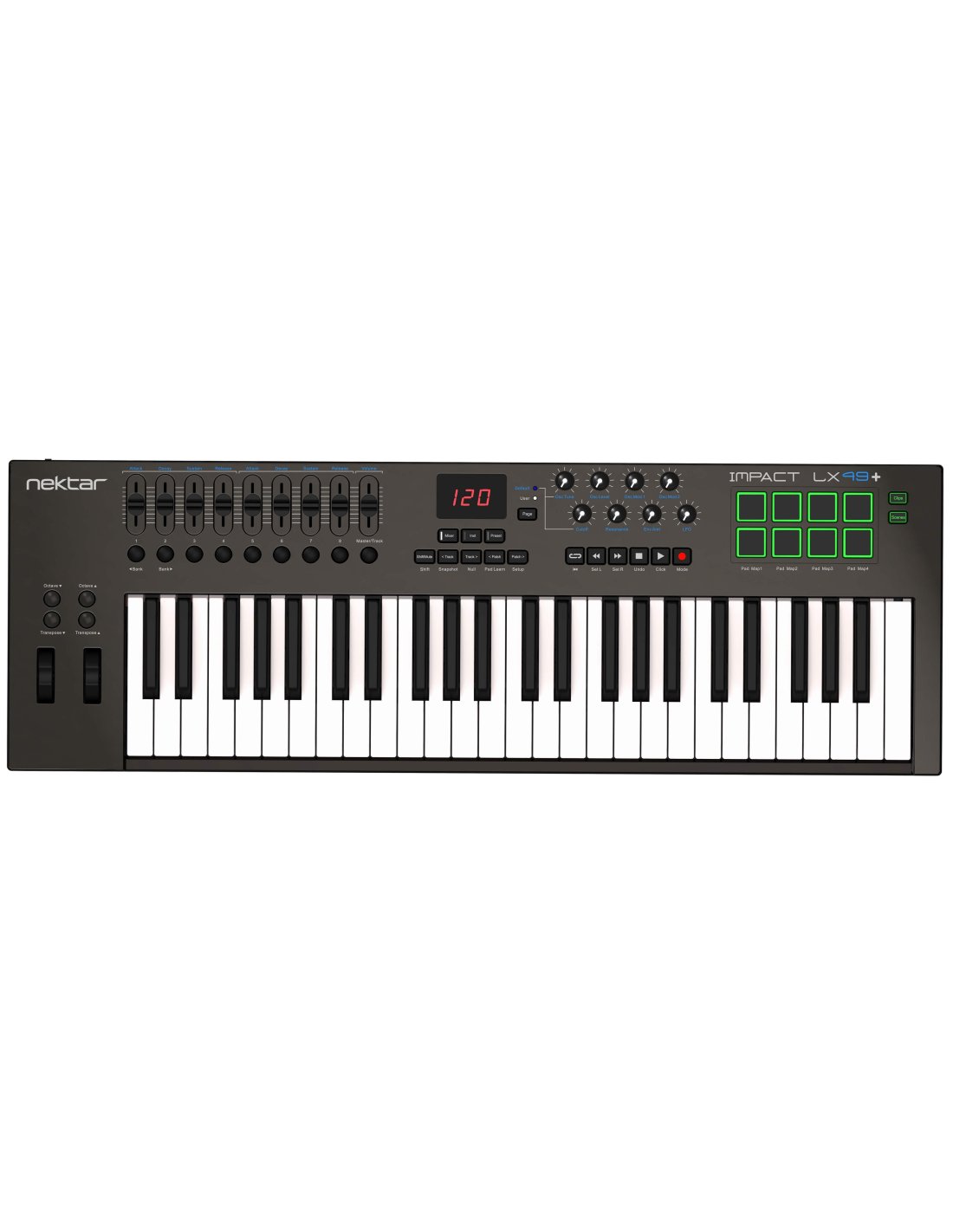 The Impact LX49+ is a Nektar MIDI keyboard with 49 keys. It is equipped with 8 velocity-sensitive LED backlit pads, 8 faders and 8 assignable knobs, octave and transpose up/down buttons, transport controls for integration with the main DAWs and 2 pitch bend and modulation wheels