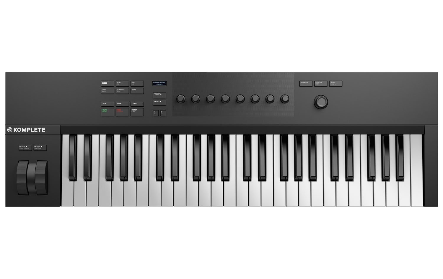 The Komplete Kontrol A49 is a MIDI keyboard from Native Instruments with 49 keys. It is equipped with 8 touch-sensitive control knobs, 2 pitch bend and modulation wheels, OLED display and pre-mapped control for Komplete instruments and effects and Native Kontrol Standard plugins