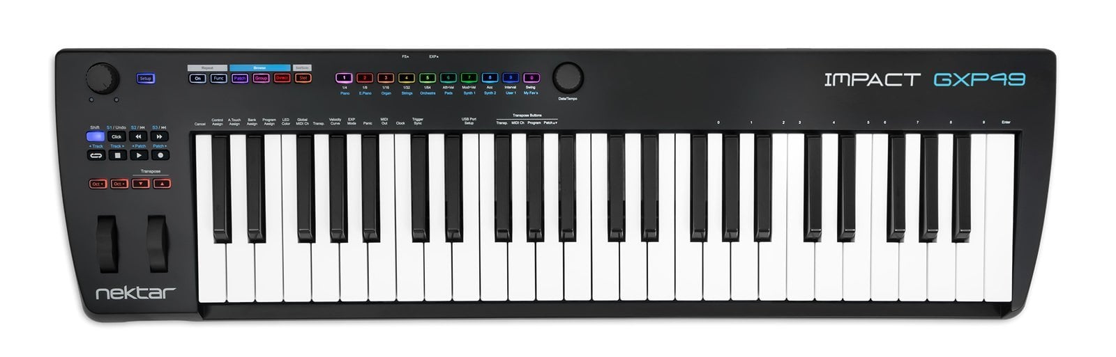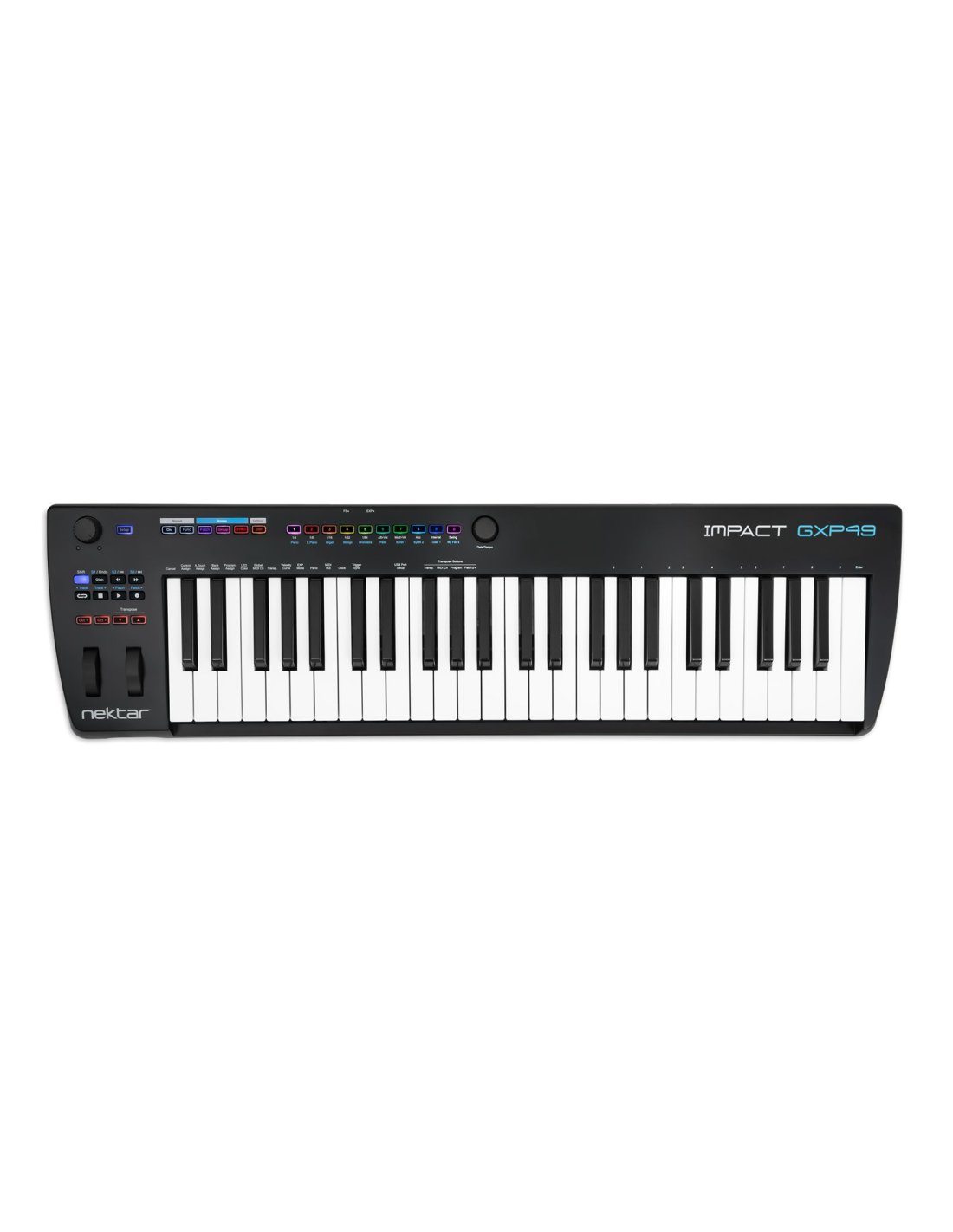 The Impact GXP49 is a Nektar MIDI keyboard with 49 keys. It is equipped with 14 LED-backlit buttons, 7 buttons for controlling DAW functions, a Key Repeat motor for creating rhythmic elements and 2 assignable pitch bend and modulation wheels