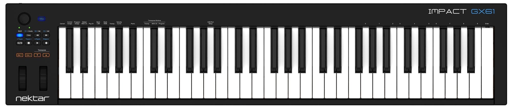 The Impact GX61 is a Nektar MIDI keyboard with 61 keys. It is equipped with LED-backlit octave buttons, 7 buttons for controlling essential DAW functions and 2 assignable pitch bend and modulation wheels