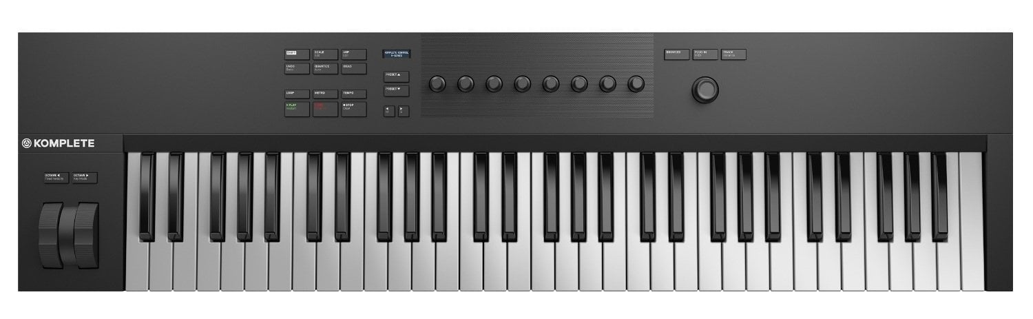The Komplete Kontrol A61 is a MIDI keyboard from Native Instruments with 61 keys. It is equipped with 8 touch-sensitive control knobs, 2 pitch bend and modulation wheels, OLED display and pre-mapped control for Komplete instruments and effects and Native Kontrol Standard plugins