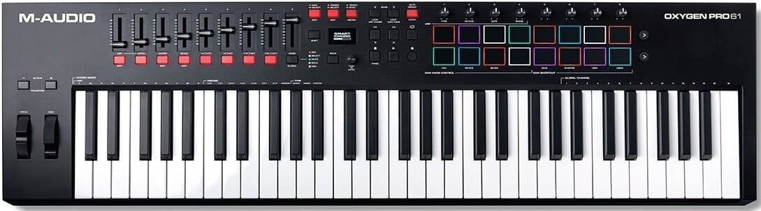 The Oxygen Pro 61 is an M-Audio MIDI keyboard with 61 keys. It is equipped with 16 backlit pads sensitive to dynamics, semi-weighted with aftertouch, 8 knobs, buttons and 9 assignable faders for controlling virtual instruments and DAWs, OLED displays and 2 pitch bend and