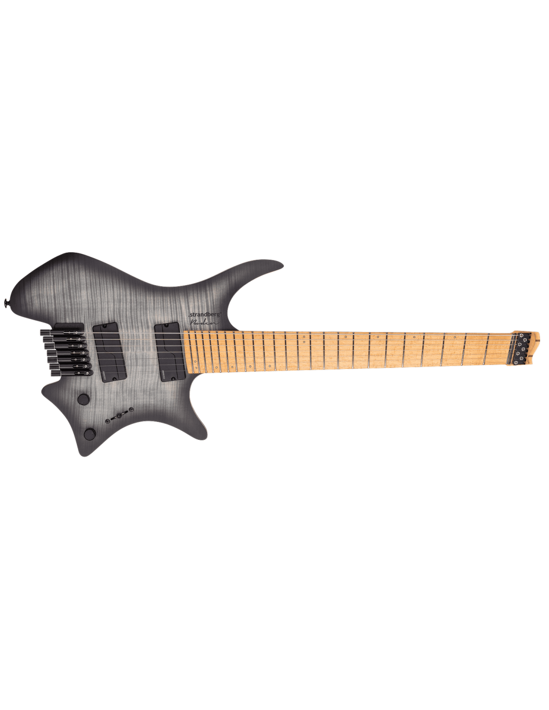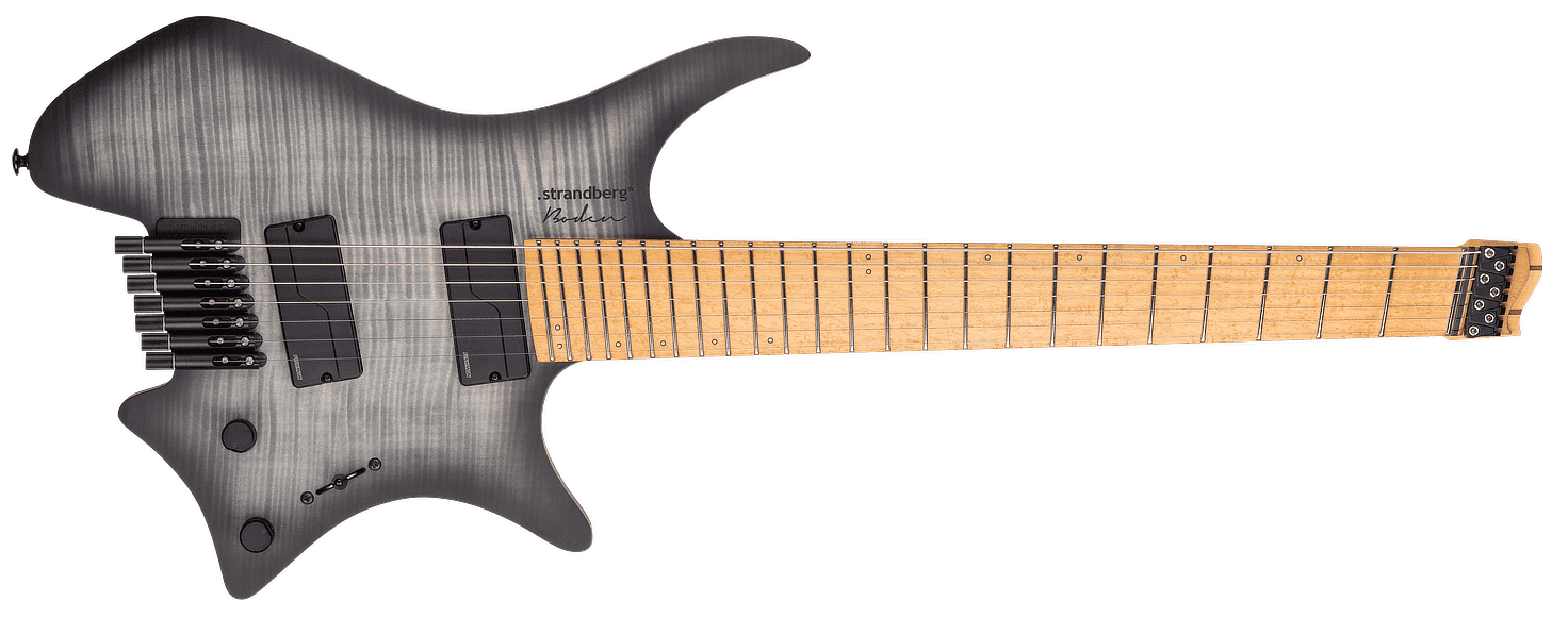 STRANDBERG BODEN ORIGINAL NX 7 headless headless electric guitar color Charcoal black. Technical features include chambered swamp ash body, solid maple top, EndurNeck profile handle in Quartersawn maple reinforced with carbon fiber, 20" radius fingerboard in Birdseye maple with 24 Jescar 51100 Fretwire frets, fixed Strandberg EGS Rev7 bridge and string lock, active Fishman Fluence Modern Alnico pickups on the neck and Fishman Fluence Modern Ceramica on the bridge. Includes D'Addario NYXL 095-64 strings, Venture gigbag and Multitool kit