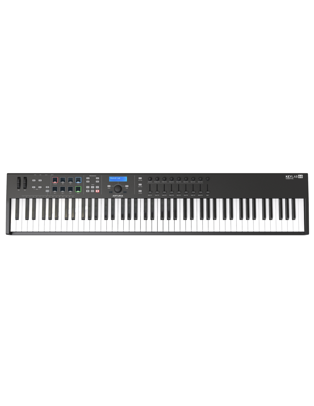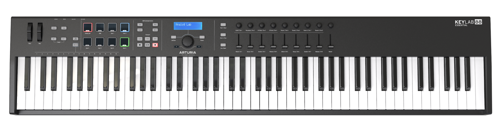 The Keylab 88 Essential Black edition is an Arturia MIDI keyboard in black color, with 88 keys. It is equipped with 8 backlit pads, 9 faders and rotary controls, DAW command center and transport section, LCD screen and 2 pitch bend and modulation wheels