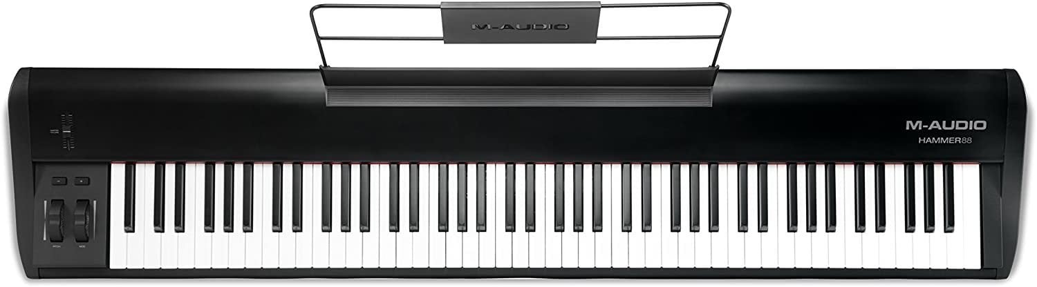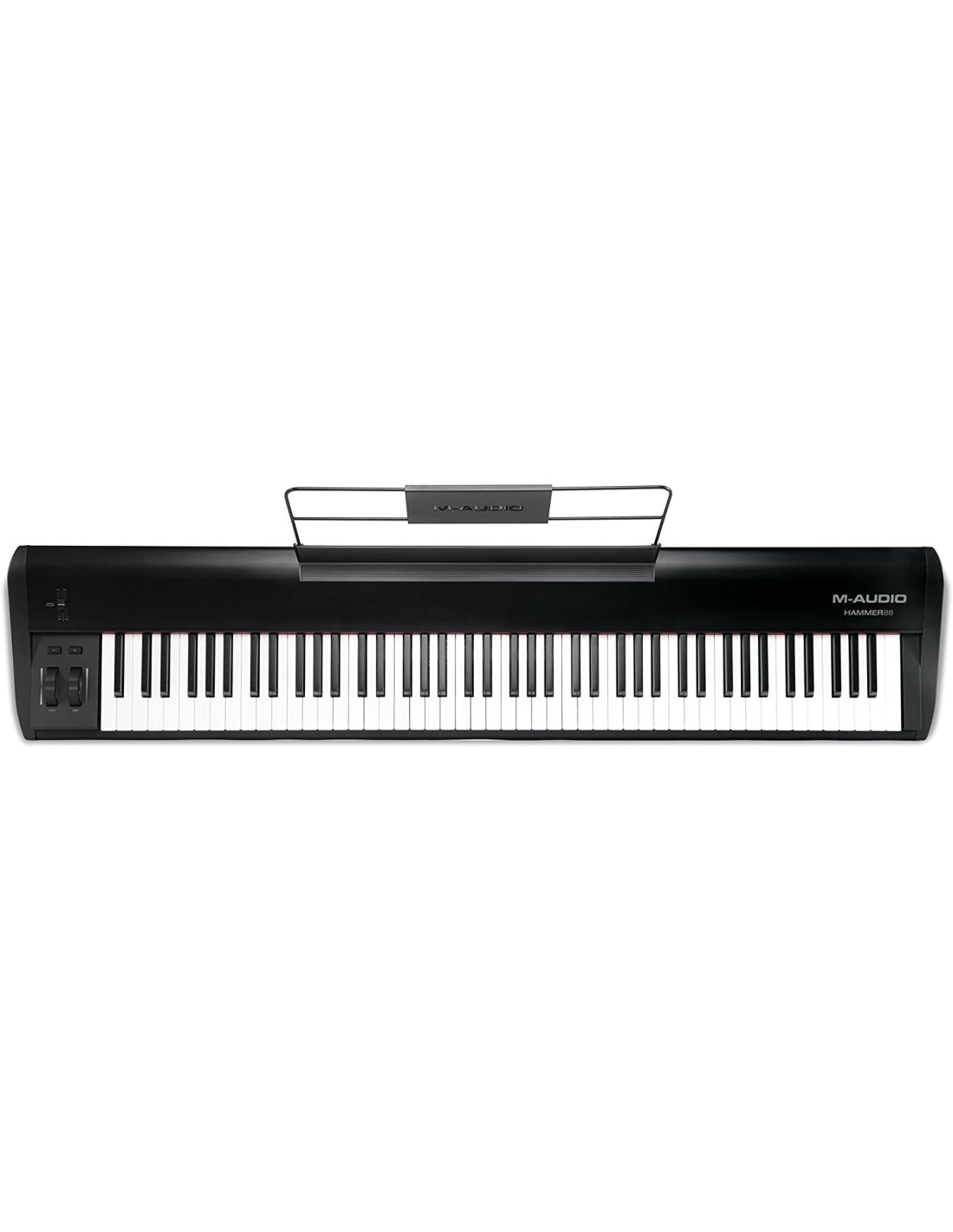 The Hammer 88 Pro is an M-Audio MIDI keyboard with 88 weighted keys. It is equipped with hammer action mechanics with assignable aftertouch, 16 backlit pads sensitive to dynamics, 8 knobs, 8 buttons and 9 faders for controlling virtual instruments and DAW, 2 pitch bend and modulation wheels