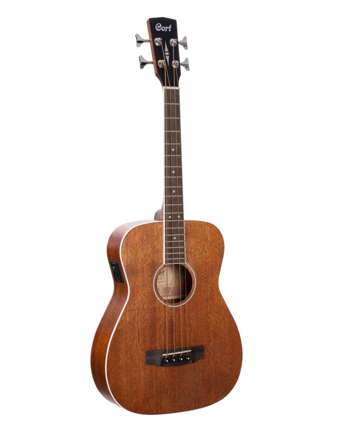 4-string Electrified Acoustic Bass Guitar. Construction: Dovetail neck joint 12th fret. Scale: 24.75 (628 mm). Sound Box: Concert. Back and Sides: Laminated mahogany. Binding: White. Top: Laminated mahogany. Handle: Mahogany Keyboard: Lauro. Nut: 43 mm (1 11/16"). Keys: 18. Keyboard inlay: Dot. Mechanics: Cort. Bridge: Lauro. Electronics: Fishman Presys II - Sonicore pickup. Finish: OP - Open Pore. Strings: D'Addario PBB170
