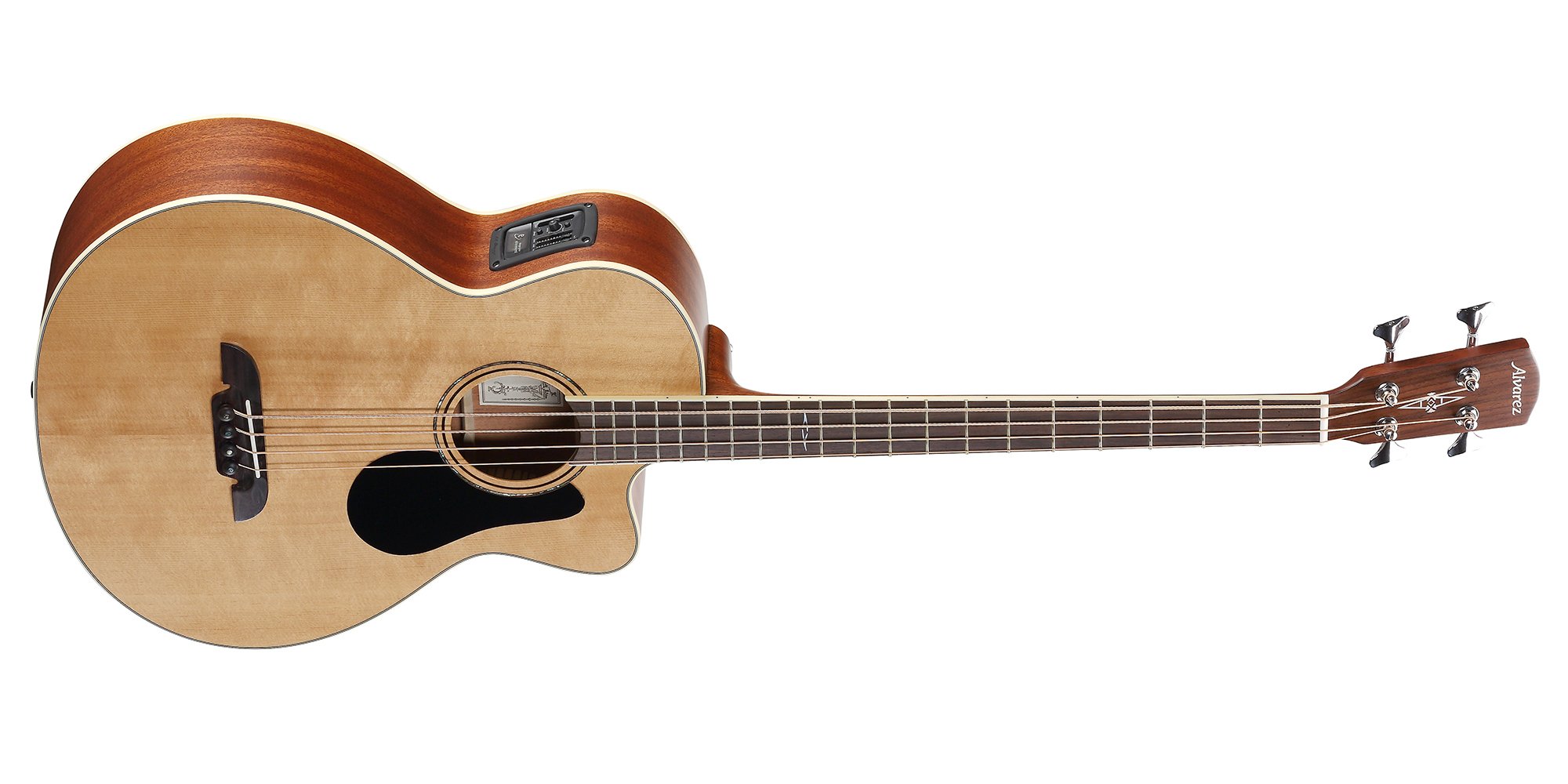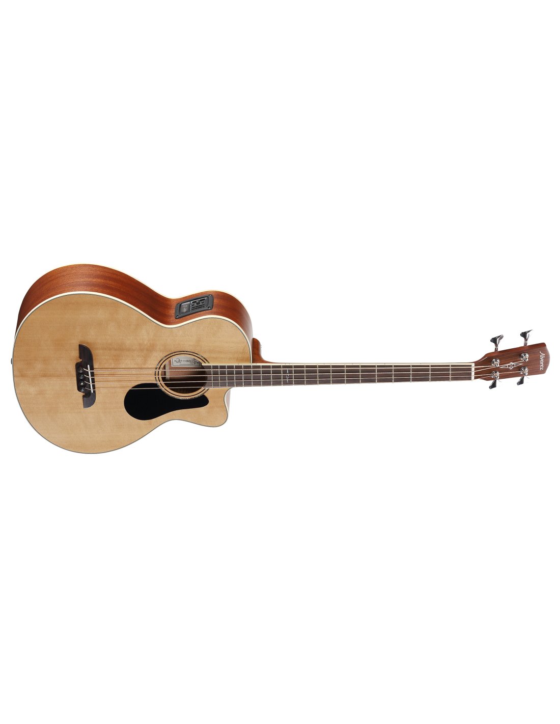 Alvarez AB60CE Acoustic Bass Guitar color NATURAL. The Alvarez AB60CE is a 4-string electrified acoustic bass guitar. Technical features include mahogany back and sides, sitka spruce top, mahogany neck, wooden paddle/Indian Laurel fingerboard, missing shoulder, LR Baggs StagePro