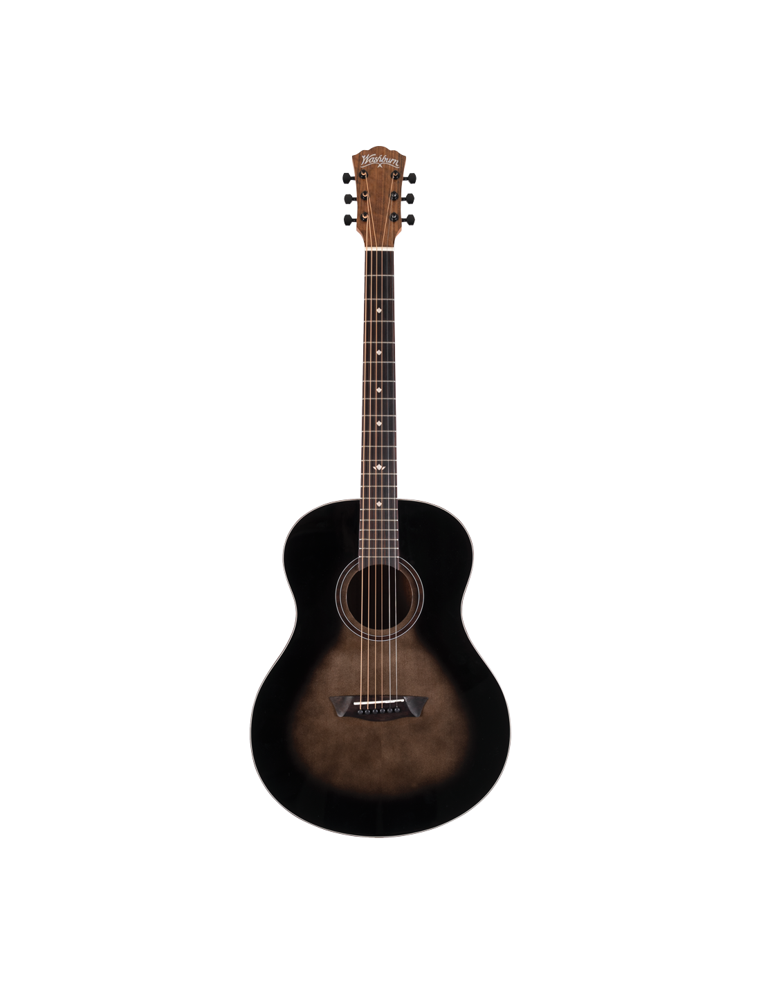 Studio Body Acoustic Guitar, Selected Spruce Top, Selected Figured Walnut Back and Bands, Charcoal Burst Color The Novo S9 acoustic guitar features an attractive selected spruce top with glossy Charcoal Burst finish and figured walnut back and sides. The Studio body shape is incredibly comfortable and maintains a sound quality normally associated with larger body sizes. The Novo S9 keeps the scale at 25.5” and the modern “C” profile of the satin Okoume handle is easy and comfortable in the hands. A subtle but beautiful 12th fret Lotus inlay adorns the ebony fretboard, and the black and white binding contributes to the elegant and striking look of this superb little instrument. Specifications Shape: Studio Body Top: Selected Spruce Back/Strips: Selected Walnut Figured Handle: OkoumeKeyboard: Ebony Rosette: Washburn Bella Tone Reinforcement: Scalloped ReinforcementBridge: Ebony Inlays: Dots/Lotus 12thMechanics: Black Die-cast Number of Keys: 20 Keys Scale: 25.5 Color: Charcoal BurstFinish: Polished Strings: D'Addario EXP16