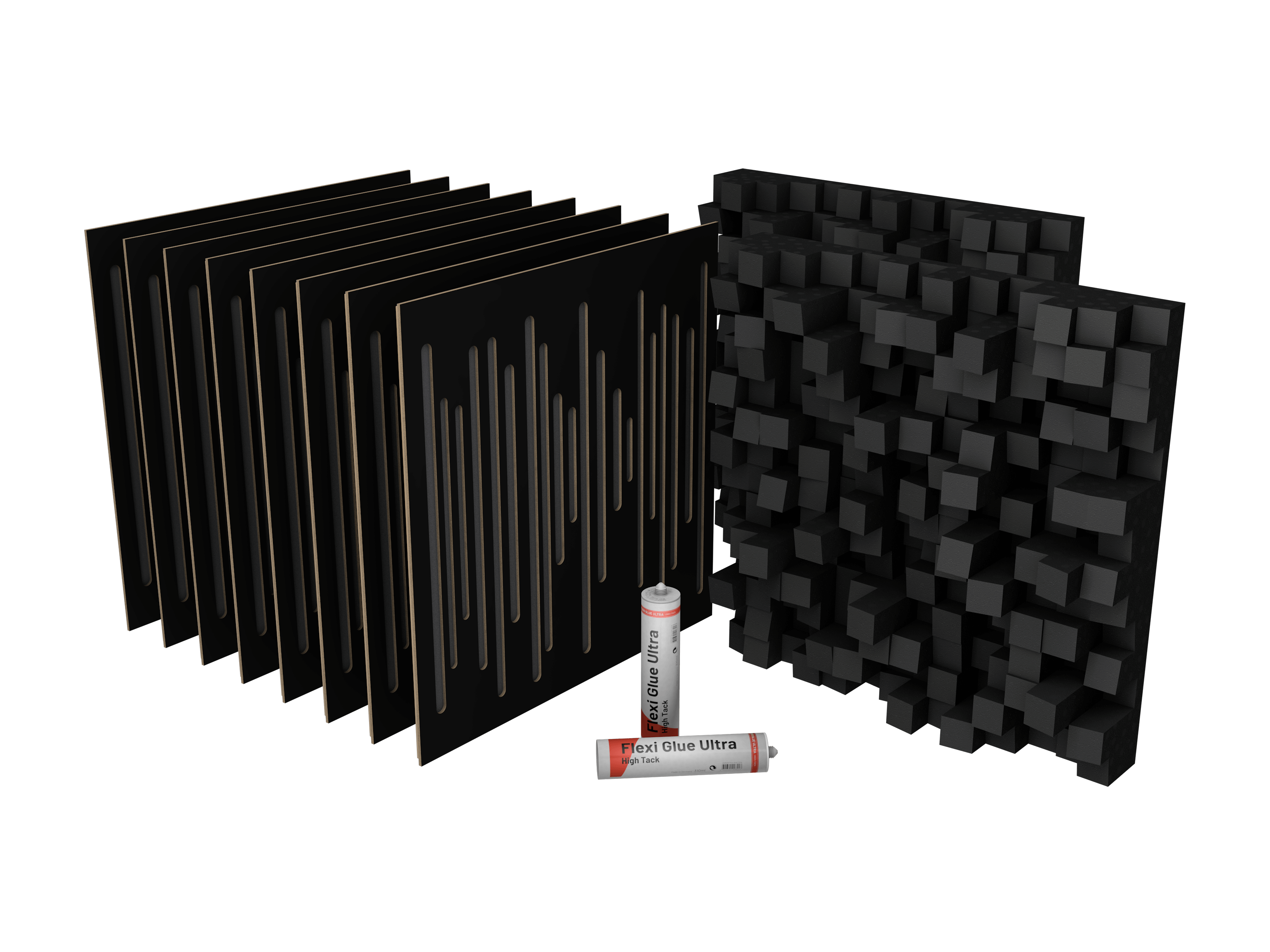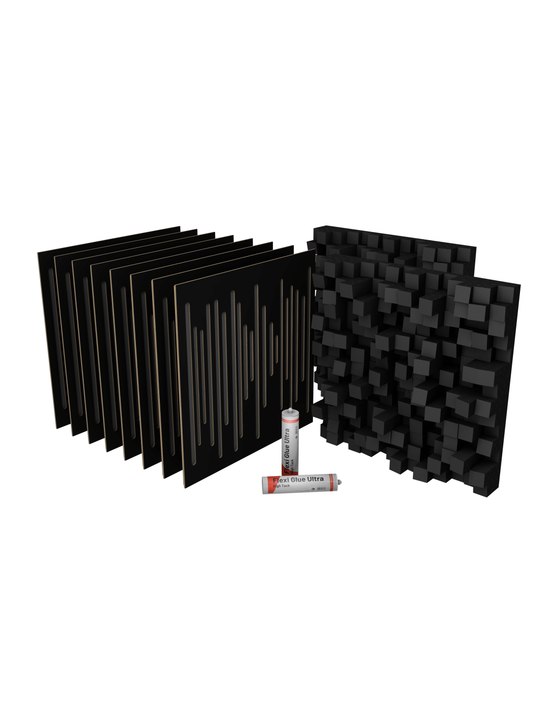 The Vicstudio Black Box is a Vicoustic acoustic control kit. It consists of 8 Wavewood Ultra Lite panels, 2 Multifuser DC3 panels and 2 tubes of Flexi Glue Ultra glue. The former are suitable for absorbing medium frequencies and can also be used as bass traps if installed at 45° in the corners of the room. Multifuser DC3 panels are ideal for sound diffusion and can be installed on the wall or ceiling, using the Flexi Glue Ultra glue or the VicFix fixing system
