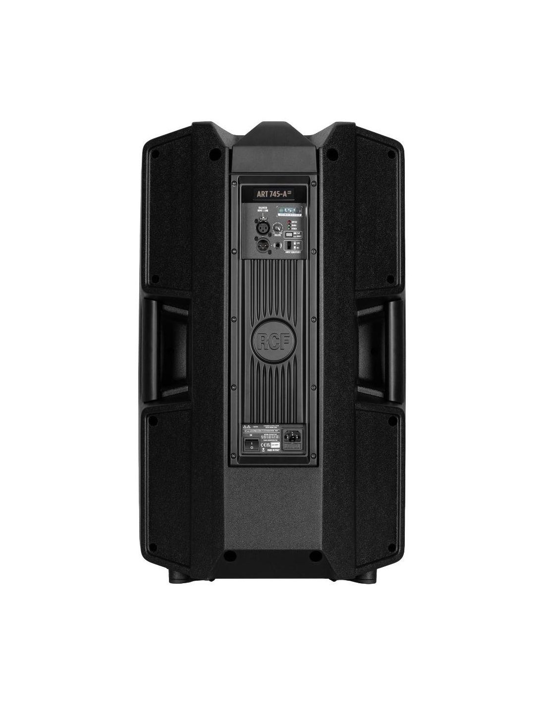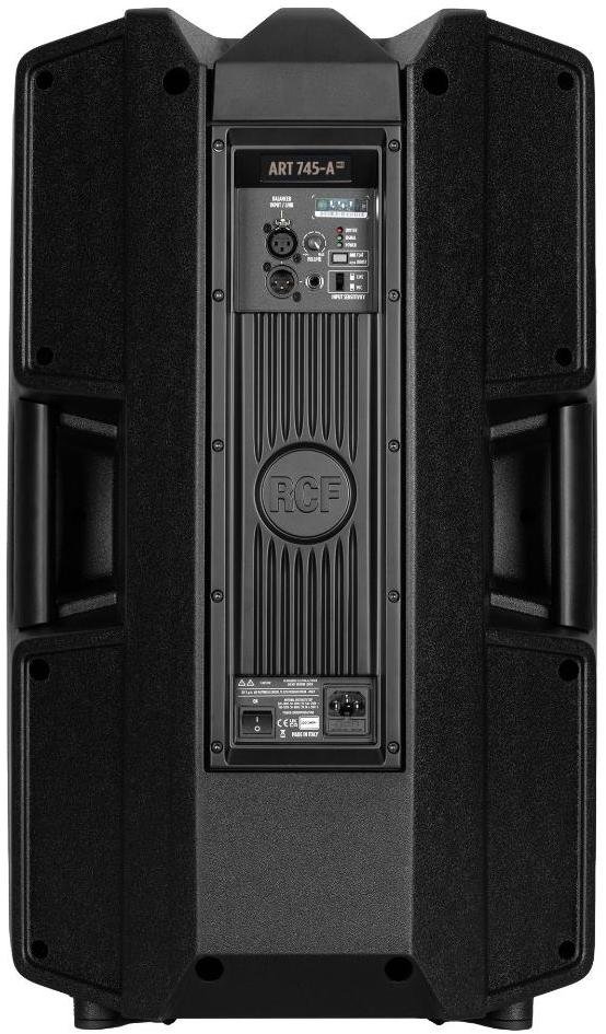 RCF ART 745-A MK5. Active speaker with 15" Neodymium speaker with wide excursion with 2.5" coil, 1" titanium compression tweeter with Mylar dome and 4" moving coil, 700W of RMS power in class D digital amplification, integrated DSP processing with selection of EQ Mode Flat/Boost through a dedicated button, Firphase technology for electronic phase management, Line/Mic input via XLR and 6.3 mm Jack with source selector, output volume control and Output Link via XLR