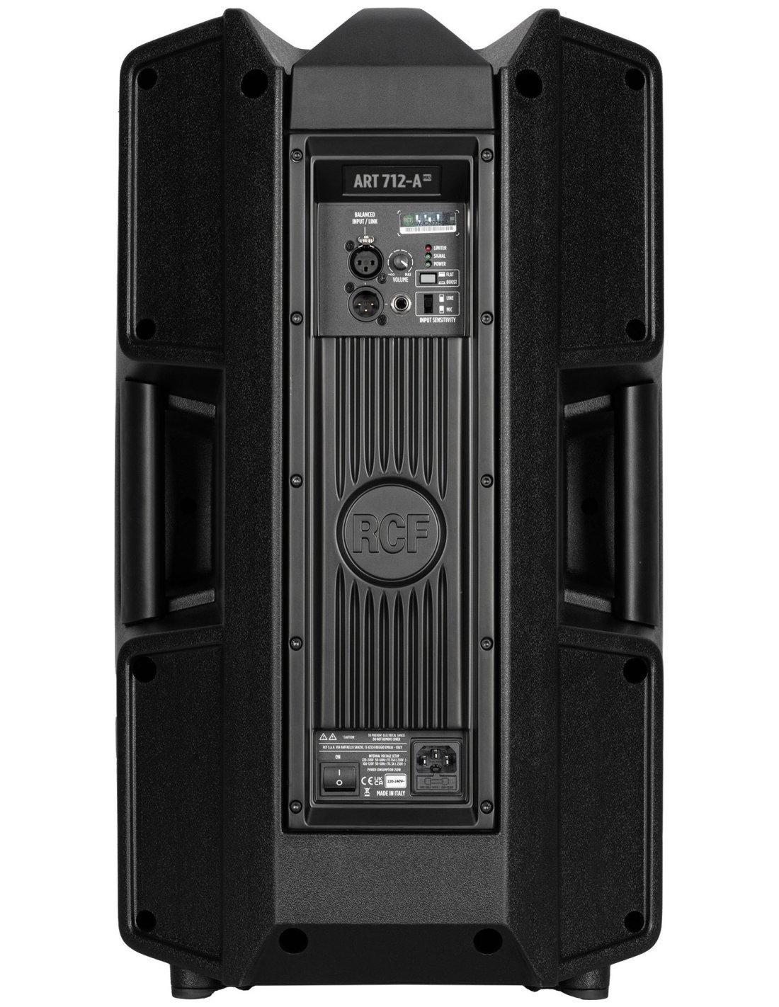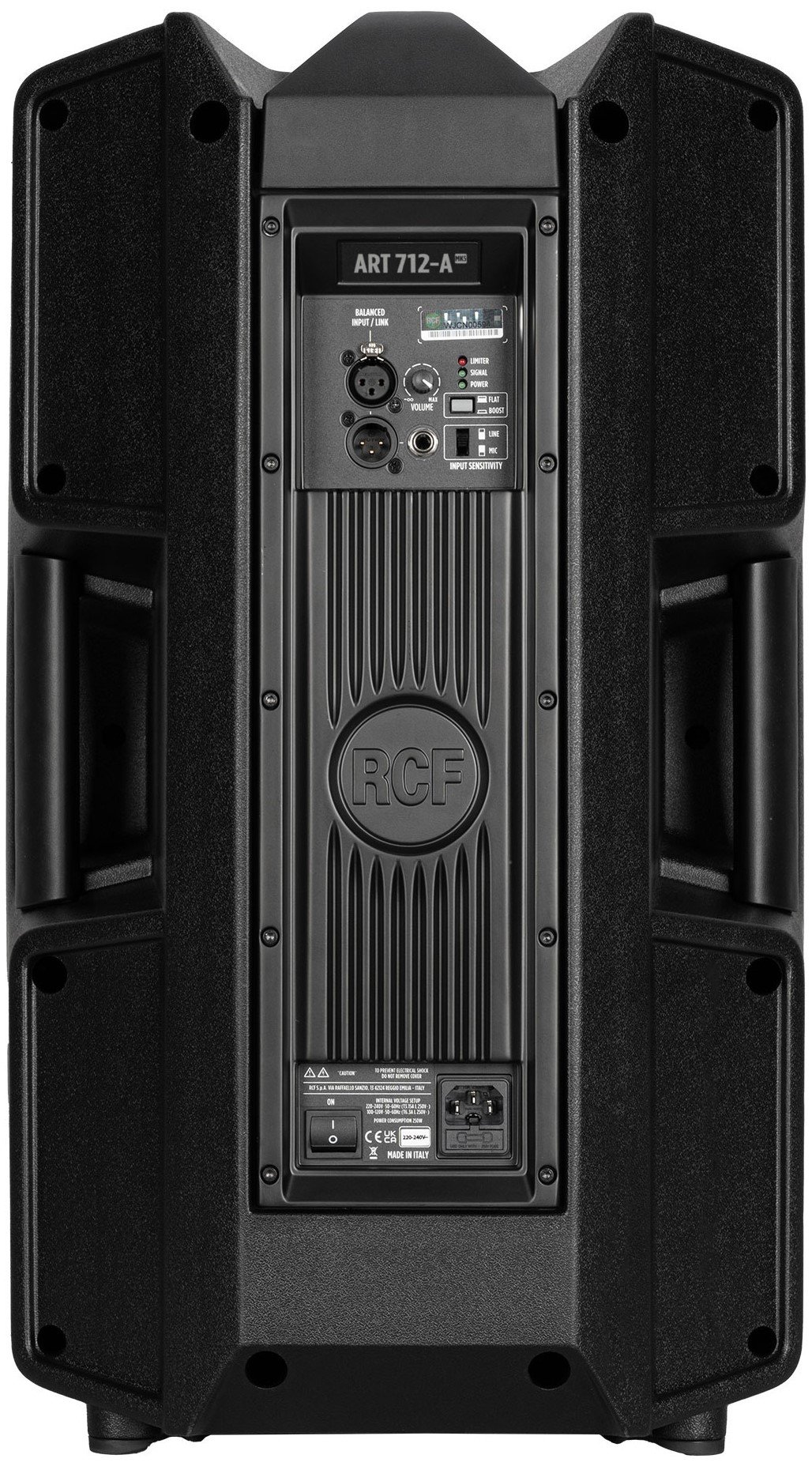 RCF ART 712-A MK5 is a 2-way biamplified active speaker with 12" speaker and 1400W Peak Class D power amplifier. Technical features include 12" Woofer, 1.75" compression driver, 2-channel ART 7 amplifiers with SMPS power section, 90° x 60° constant directivity horn, 129Db of maximum SPL, DSP processing with FIRPHASE technology, switch for XBOOST low frequency enhancer, integrated Limiter and Input Sensitivity Line/Mic selector. It has an XLR connector for balanced input with independent volume control, Link output via XLR and