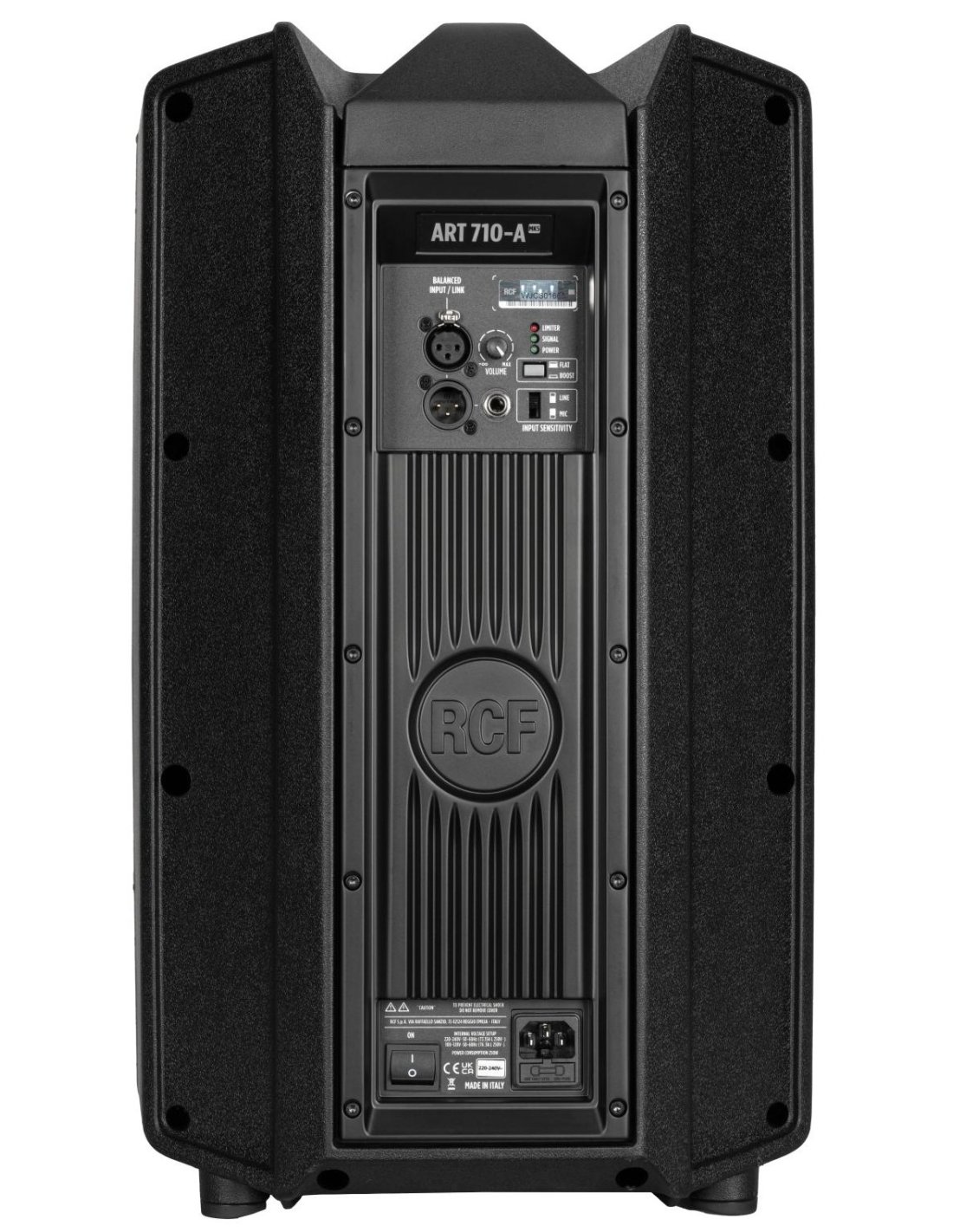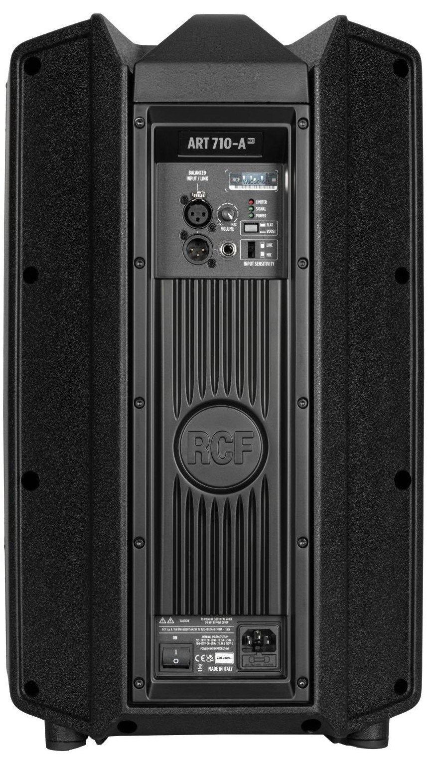 RCF ART 710-A MK5 is a 2-way biamplified active speaker with 10" speaker and 1400W Peak Class D power amplifier. Technical features include 10" Woofer, 1.75" compression driver, 2-channel ART 7 amplifiers with SMPS power section, 90° x 60° constant directivity horn, 129Db of maximum SPL, DSP processing with FIRPHASE technology, switch for XBOOST low frequency enhancer, integrated Limiter and Input Sensitivity Line/Mic selector. It has an XLR connector for balanced input with independent volume control, Link output via XLR and
