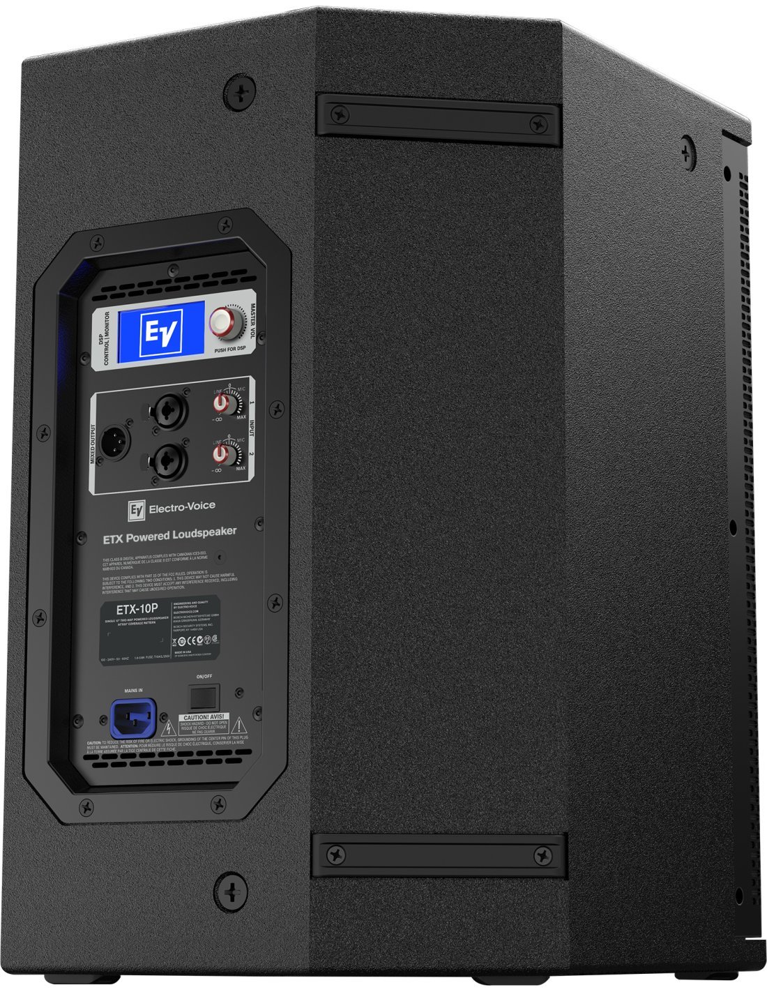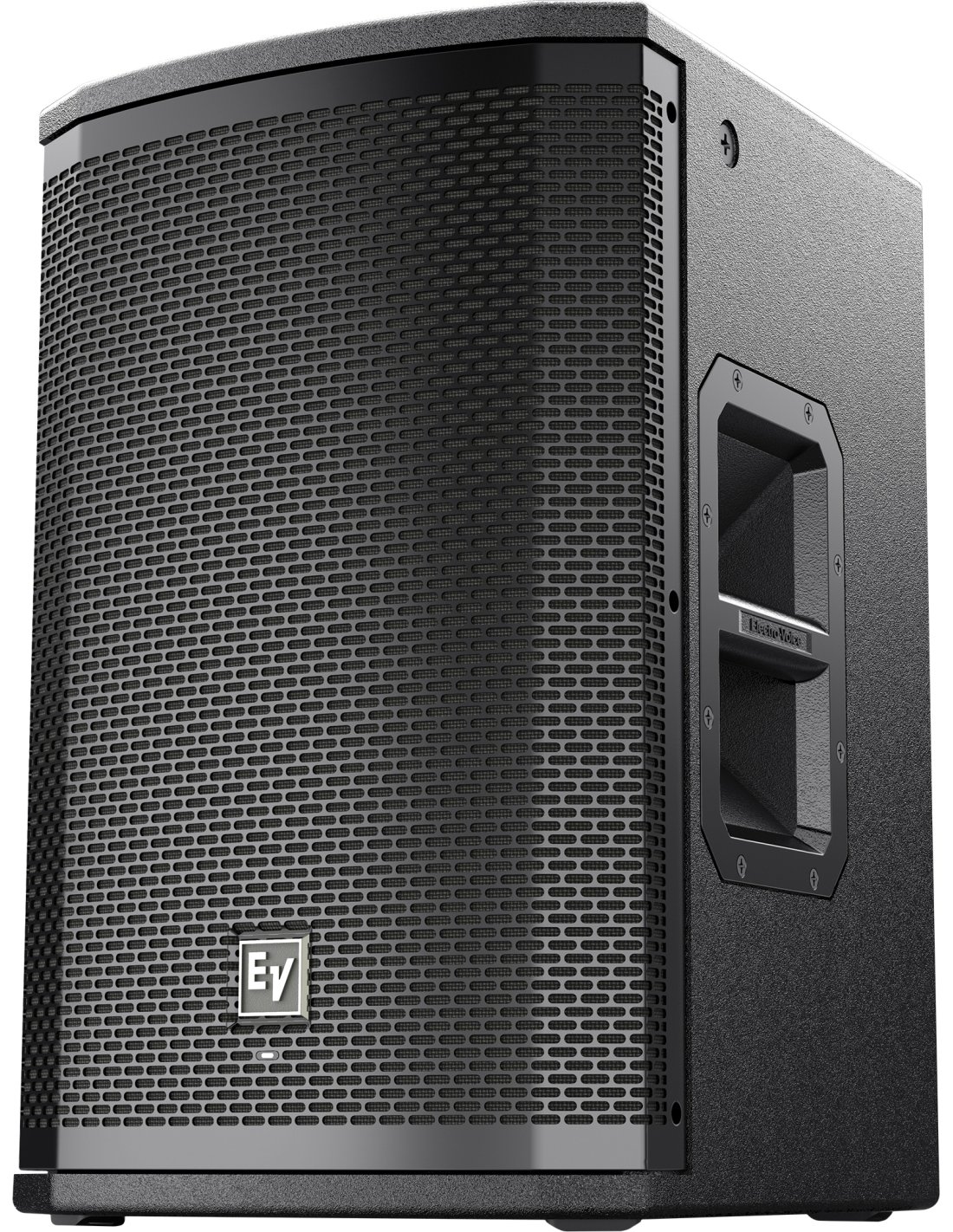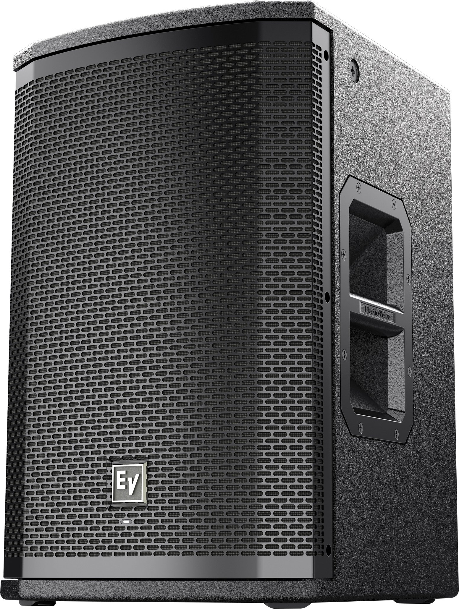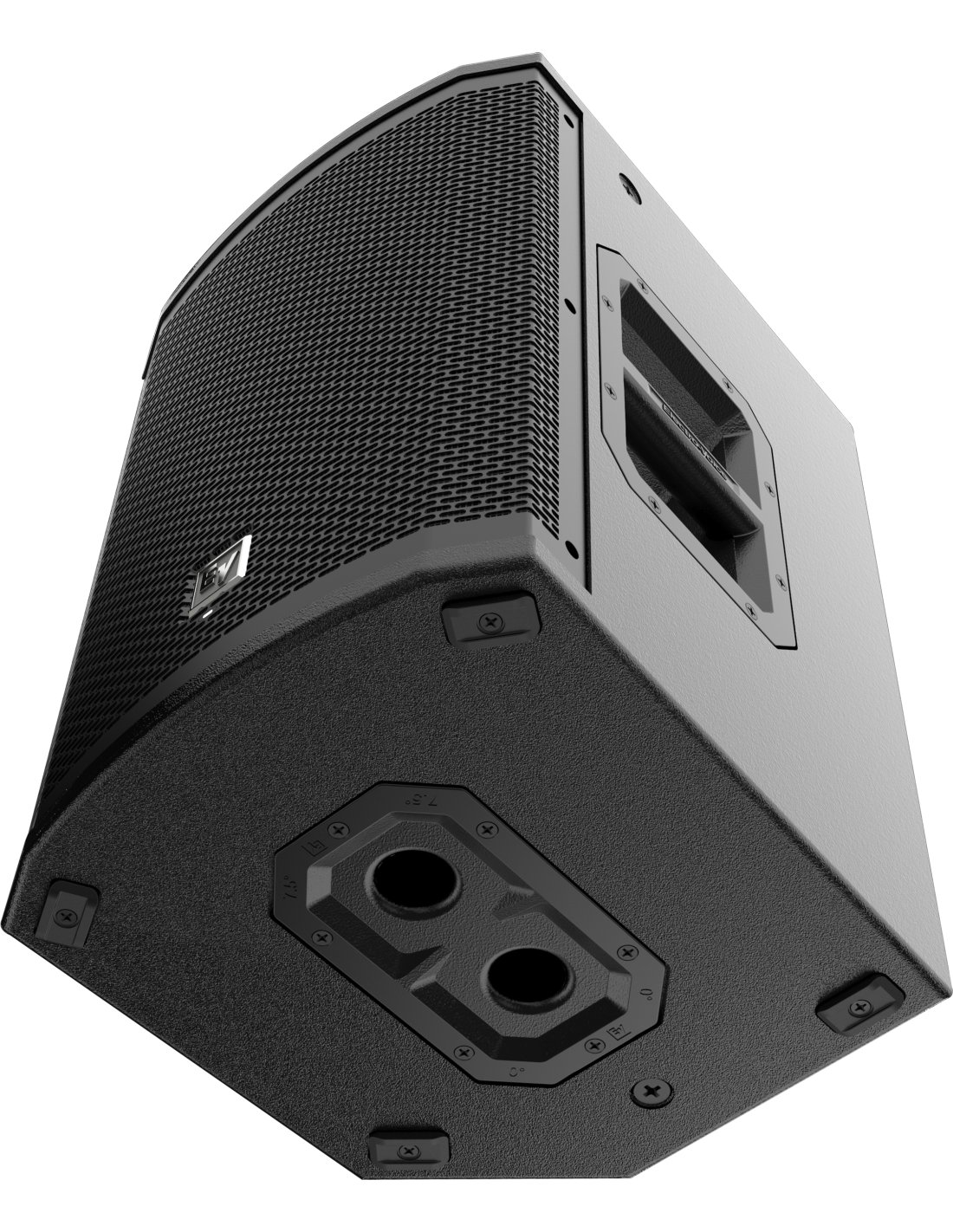 Full range self-powered 2-way system. Asymmetrically shaped furniture in 18 mm birch plywood, covered with EVCoat, black finish. Includes 1 carrying handle, tripod stand with 2 positions (0° and 7.5°) and 8 M10.LF anchor points: 1x speaker with 10' cone (SMX2100). HF: 1 x 1.25' titanium diaphragm motor (DH3-B). Built-in 1x 2,000W power module, DSP with LCD display and associated encoder, FIR-Drive processing, EQ preset for application mode and position, 3x PEQ, 0 - 343 m delay adjustable at 0.25 m intervals, adjustable Hi-Pass filter for combination with Sub. 2 inputs with XLR-Jack¼ 'Combo connectors, with independent level adjustment, 1 parallel output with the mix of inputs (XLR). -10dB response: 65Hz - 20kHz. Maximum SPL: 134 dB. Angle of coverage: H 90° x V 60°. Dimensions (HxWxD): 526 x 330 x 355 mm. Weight: 20.3 kg