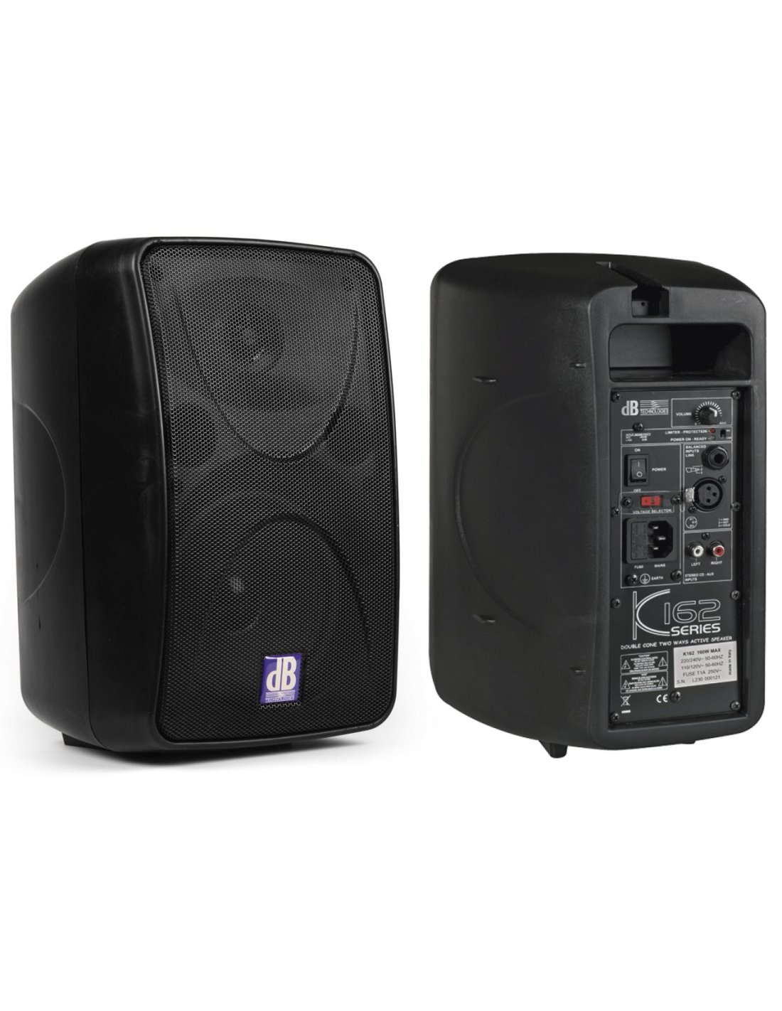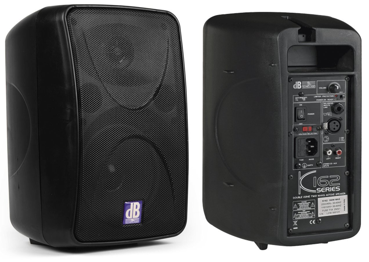 The K162 by dB Technologies is a 160 Watt 2-way active speaker with frequency response between 85 Hz and 19 kHz, maximum SPL 110 dB, volume control, LED indicator for Limiter/Protection and Power On/Ready, 1 XLR input, 1 6.3 mm Jack input and 1 RCA input.
