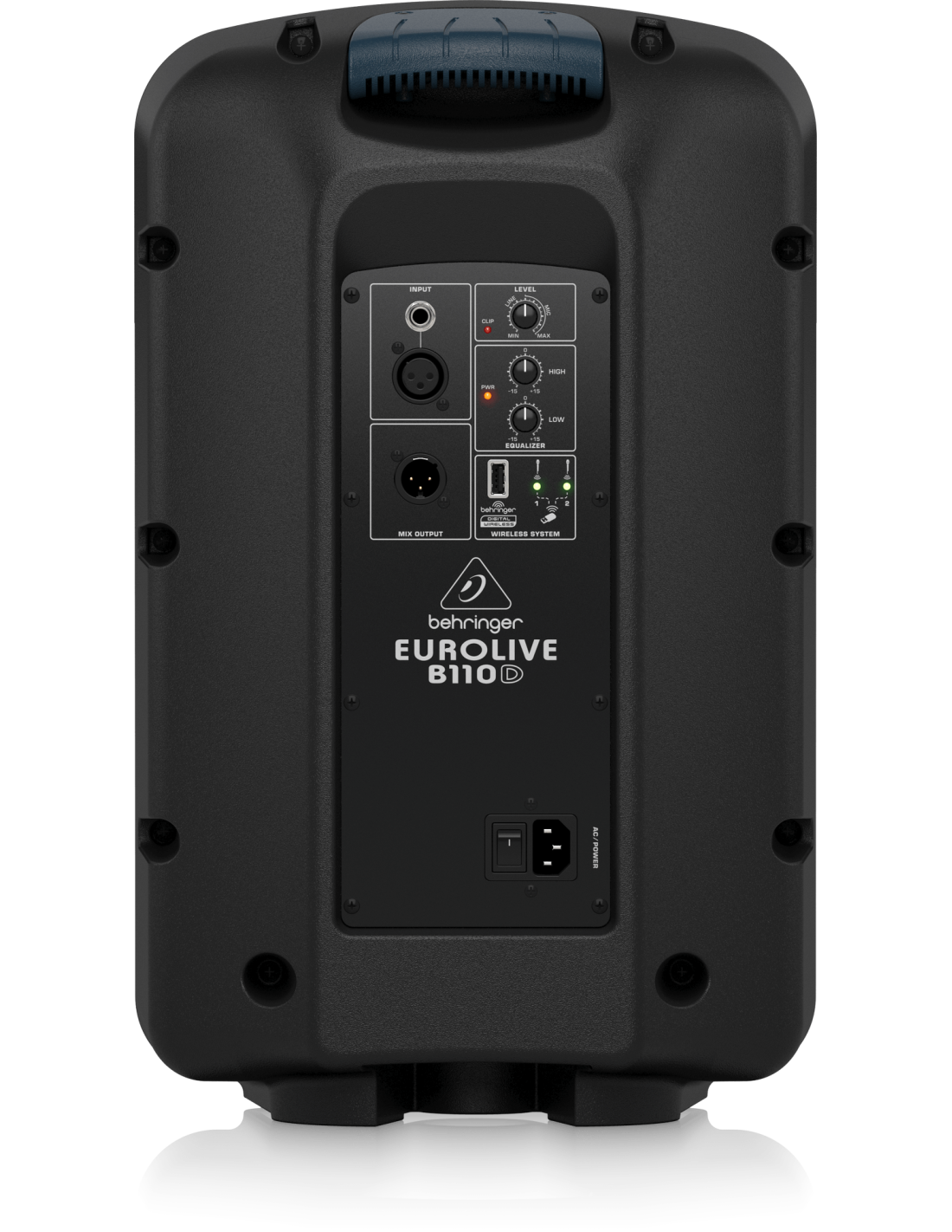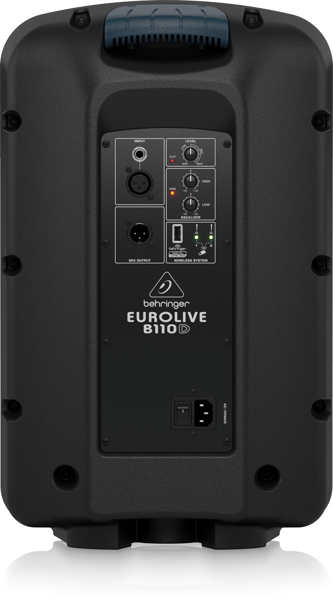 BEHRINGER B110D is a 2-way PA amplifier, with 300W of class D power and wireless functionality. Technical features include 10" long-excursion speakers, 1" compression tweeter, integrated 2-channel mixer with 2-band equalizer (High, Low), main level control, USB socket for pairing with wireless microphones, XLR and TRS input with additional XLR output for
