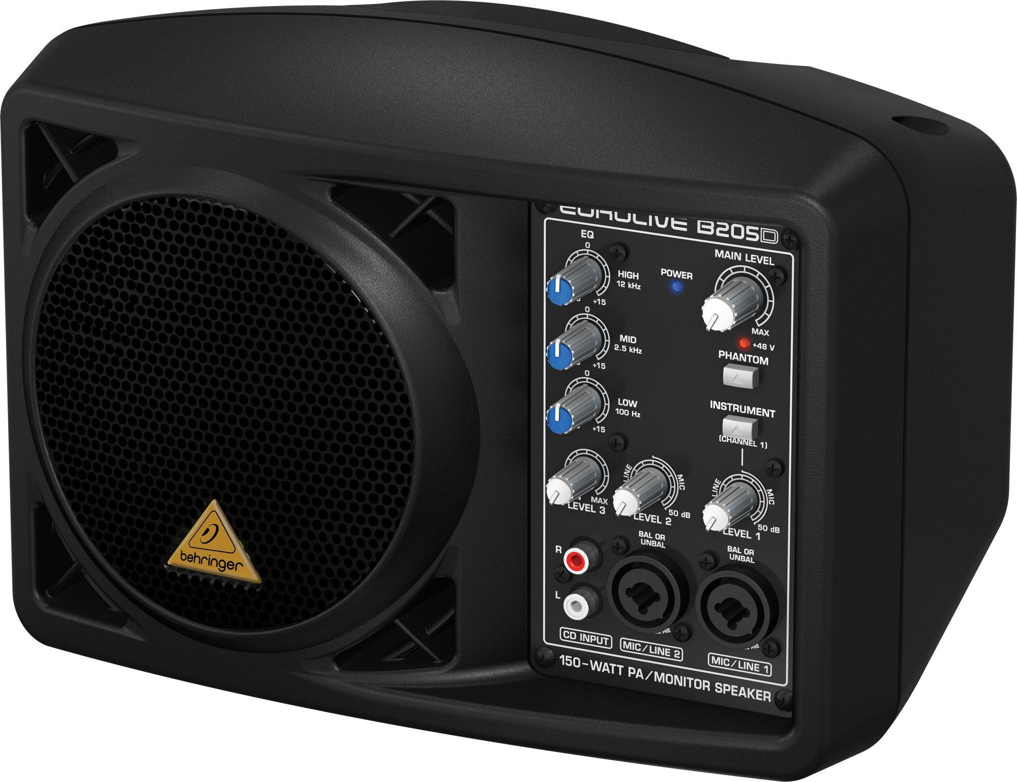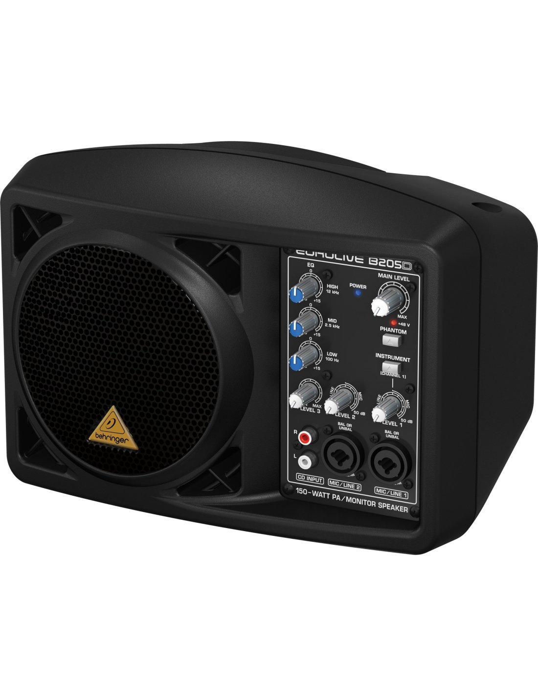 The B205D EUROLIVE is a Behringer active speaker with 150 Watt speaker, Class-D technology, controls on general volume, gain and 3-band EQ, 1 RCA input CD, 2 microphone inputs with preamp and Phantom Power, 1 instrument-ready input (without the need for a DI). The EUROLIVE B205D also has an integrated limiter, dedicated stereo input for keyboards, MP3 players, CDs, etc