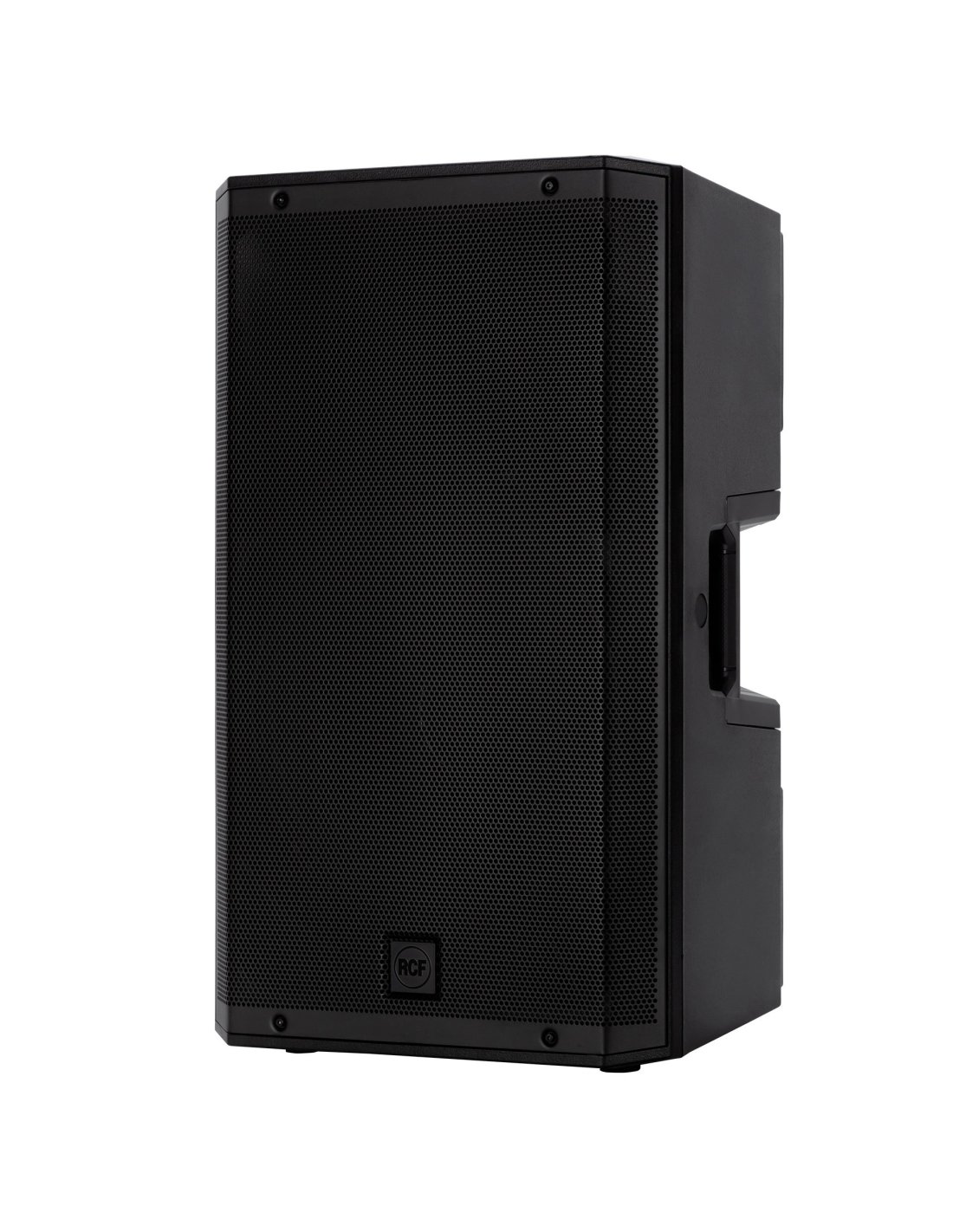 RCF ART 915-AX. Bi-amplified active speaker with Bluetooth implementation, Touchscreen color display for DSP management, remote control remote control, 15" wide-excursion speaker with 2.5" coil, 1" compression tweeter with Polyimide-Kapton dome and 1.75" coil, 2100W of peak power in class D digital amplification, integrated DSP processing with selection of EQ shelving presets for high and low bands, peak of the MID band on IN and 4 Full Parametric, 1 High Shelving and HPF 24 dB/Oct on amplifier and output Main, compressors on the MIC/LINE CH1 and CH2 inputs, Firphase technology for electronic phase management, Bass Motion Control for managing the woofer excursion, 2 Line/Mic inputs via XLR/TRS combo with source selector, output volume control and Output Link via XLR