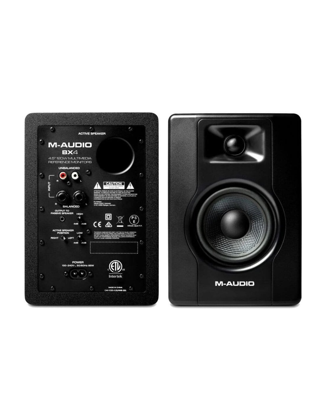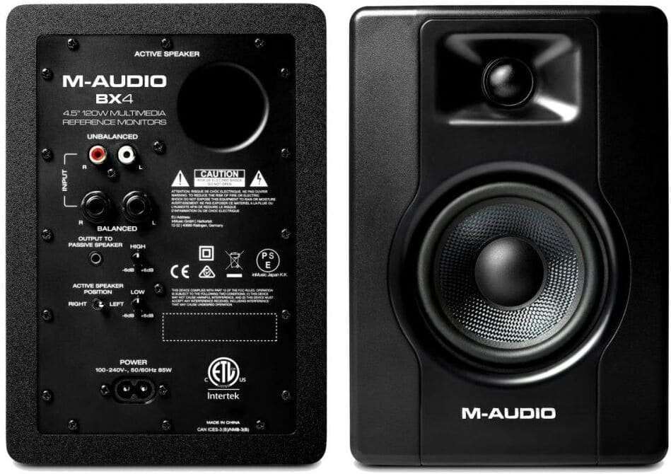M-AUDIO BX4. Pair of desktop monitors for multimedia content with 120W of power, acoustically inert MDF cabinet with bass reflex, 4.3" black Kevlar low frequency driver with 1" silk dome tweeter. On the back panel of the active speaker there are L/R balanced inputs via 6.3 mm jack and unbalanced via RCA, stereo aux via 3.5 mm jack, High-EQ and Low-EQ controls, a switch to select the position of the active speaker left/RIGHT. MPC Beats software