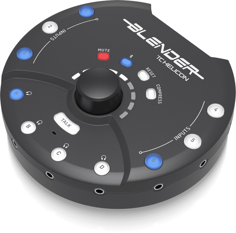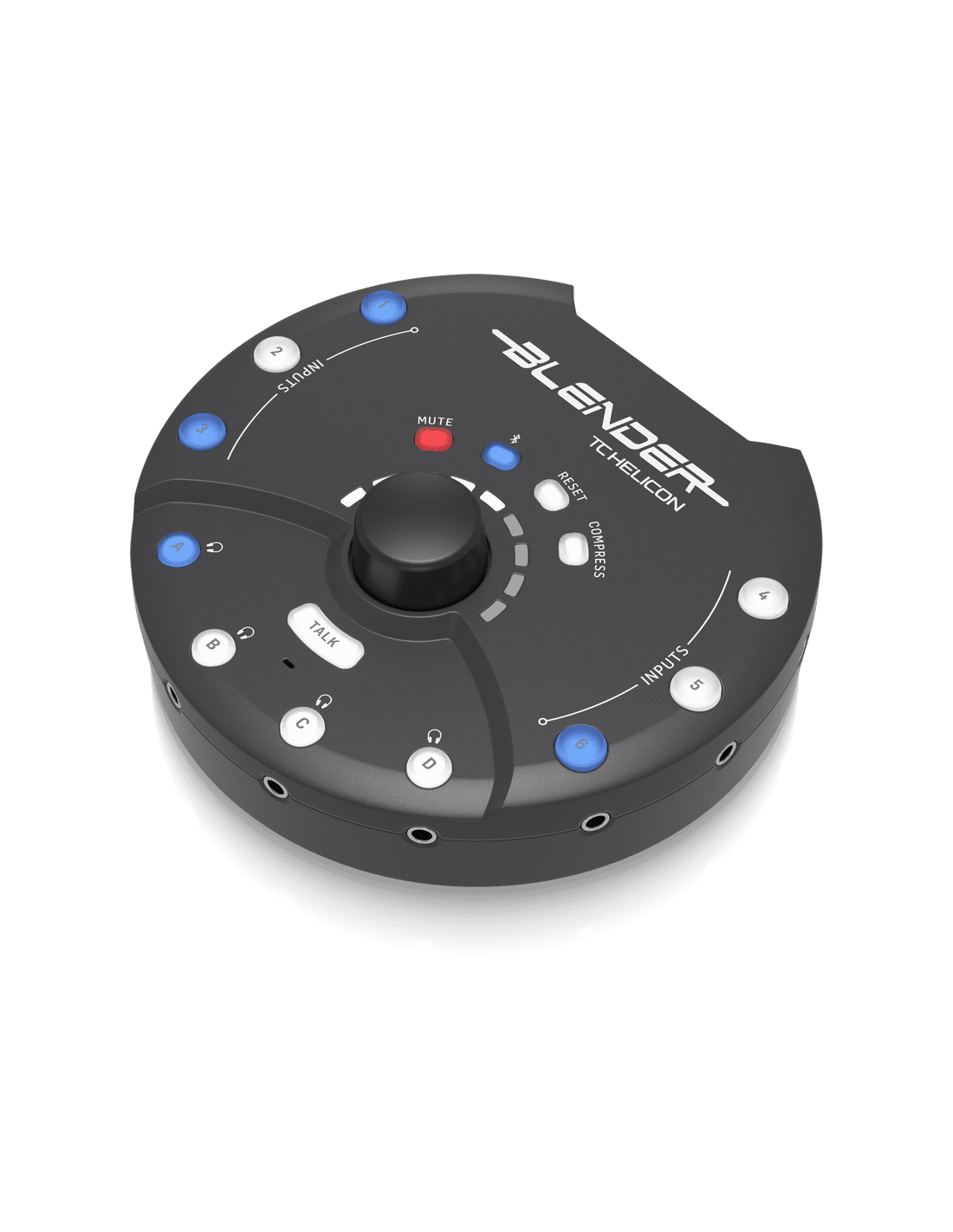 TC Helicon Blender is a portable mixer with USB audio interface and remote controller. It is equipped with 12 inputs and 8 outputs including 4 headphone outputs that allow individual adjustment of levels and 6 stereo inputs to connect more musical devices such as synthesizers, drum machines and more. Blutooth connectivity allows you to control the mixer from a mobile device through the dedicated Blender application. It's ideal for jamming, streaming, podcasts and content creation.