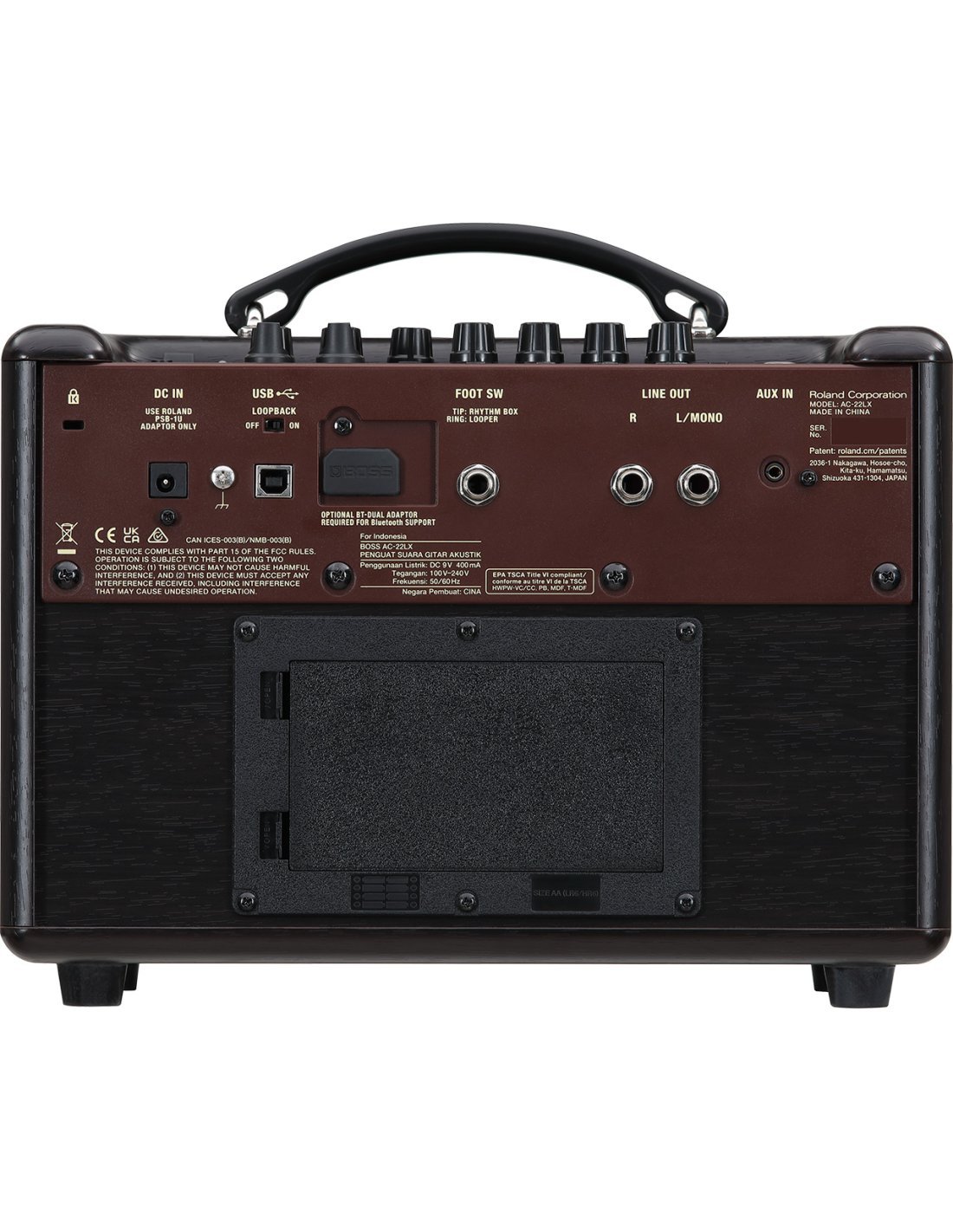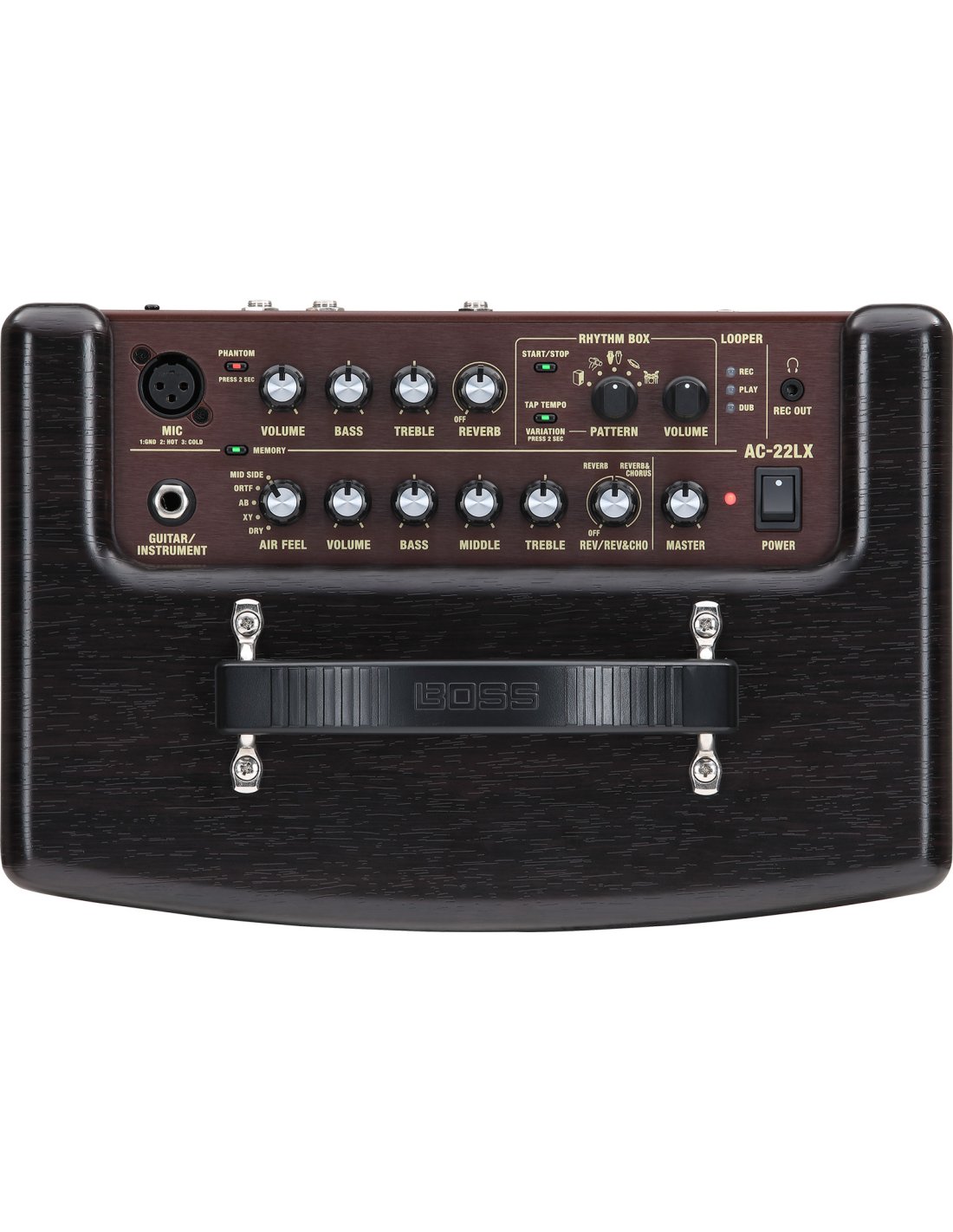 BOSS AC-22 LX. Immersive stereo amplifier for acoustic guitars, vocals and acoustic instruments equipped with pickups, with 2x5W of power and 2 channels. The technical features include 2 5W double-cone speakers, 5-position Air Feel function (Dry, XY, AB, ORTF and Mid-Side) to recreate shooting configurations with stereo microphones, Guitar/Instrument channel with 3-band equalizer and dedicated reverb and reverber/chorus effects, Mic channel with XLR input, phantom power, 2-band equalizer and reverb, 15 memory slots for saving presets, internal Rhythm Box with 15 patterns, integrated Loop station, USB audio interface with Loopback for recording and livestreaming