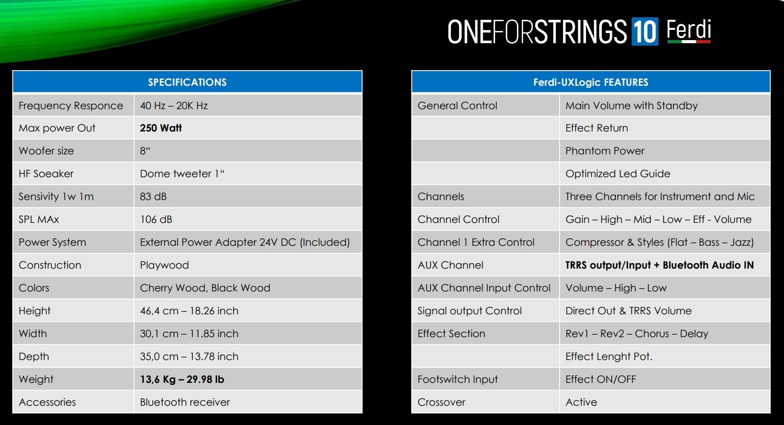 ONEFORSTRINGS 10FERDI is a 350 Watt acoustic and classical guitar amplifier equipped with 3 separate inputs + an Aux input