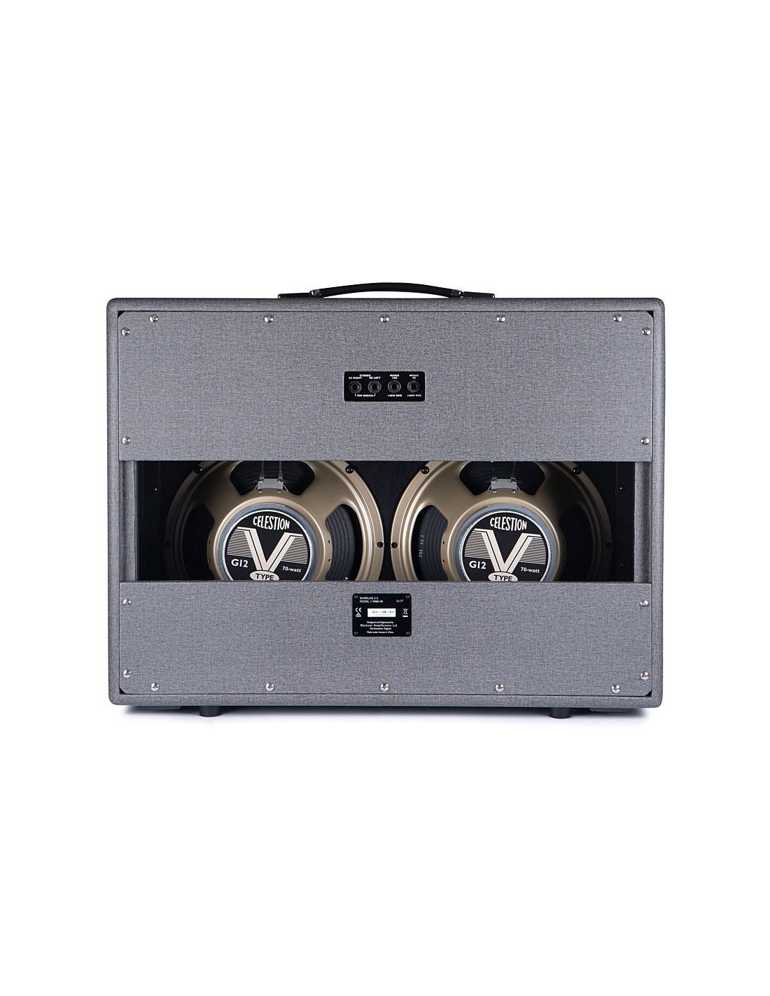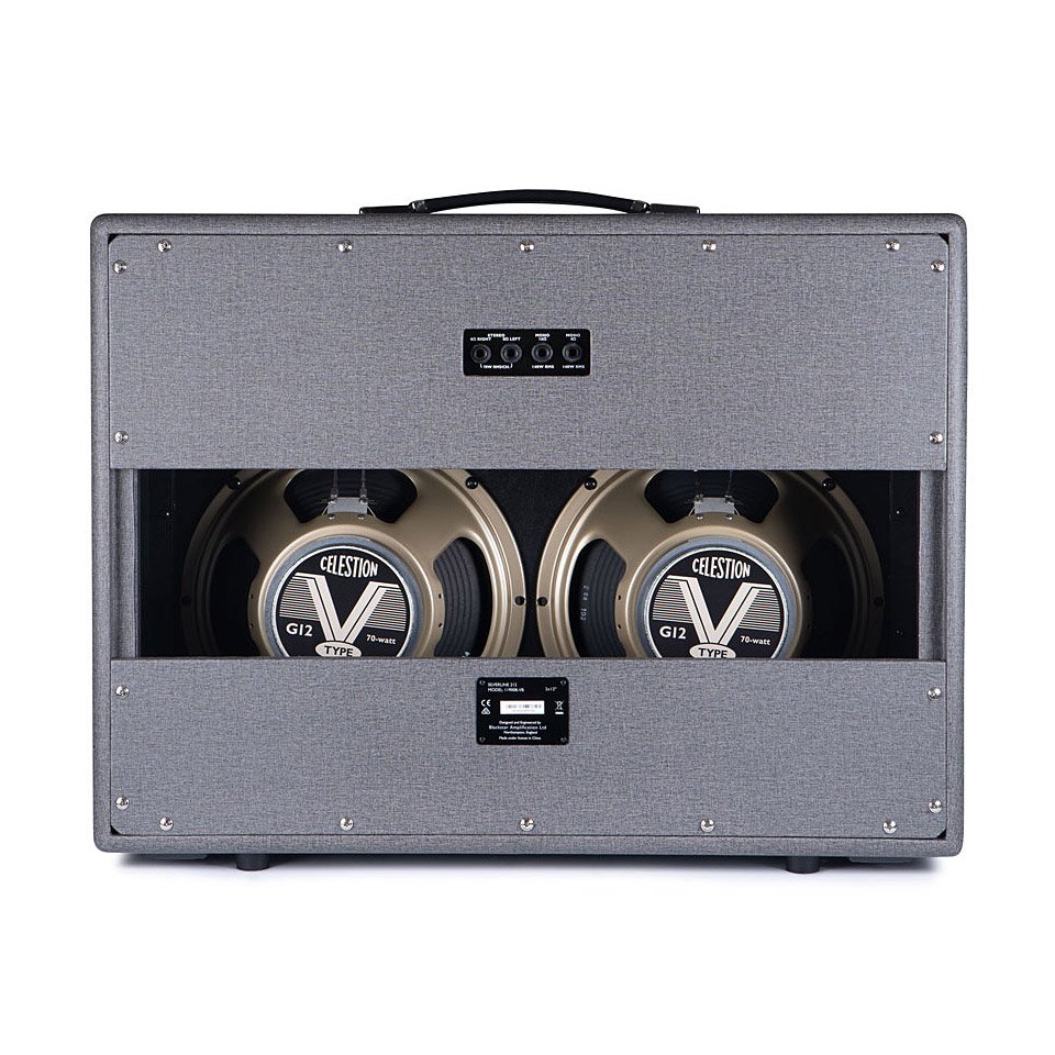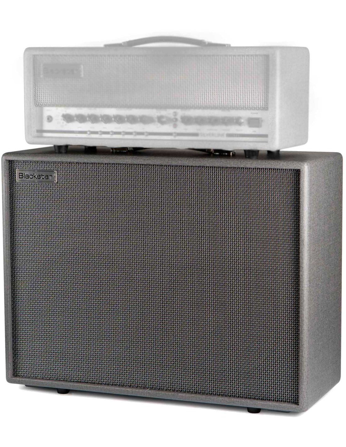 SILVERLINE 2x12 CABINET electric guitar cabinet. With two 12” Celestion V Type speakers. Designed to be combined with BLACKSTAR SILVERLINE DELUXE HEAD or SILVERLINE STEREO DELUXE. “Boutique Silver” silver tolex finish with front metallic logo